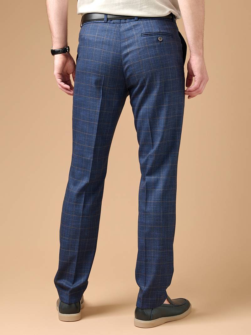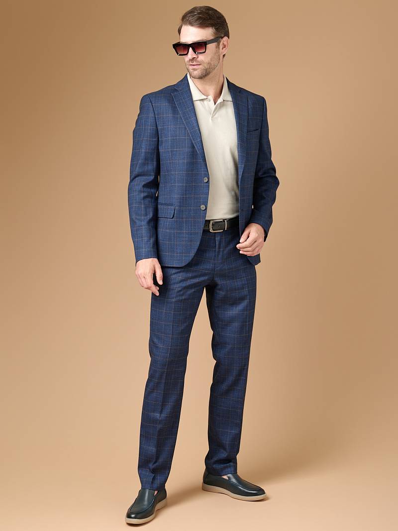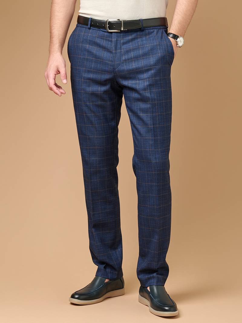 Slim fit (ПРИЛЕГАЮЩИЙ СИЛУЭТ), рекомендуется брать на размер больше. Темно-синие зауженные брюки с низкой посадкой, без защипов, с выраженным клетчатым мотивом днем составят офисный образ и дополнит яркий вечером. Наличие в составе ткани лайкры обеспечит дополнительный комфорт и удобство. Брюки с боковыми наклонными карманами и одним задними карманом "в рамку". Верхний срез брюк обработан поясом с корсажной лентой и шлевками под ремень. Брюки мужские, классические, нарядные, повседневные, молодежные, casual, для работы в офисе, модные, для мужа, сына, брата, на праздник.