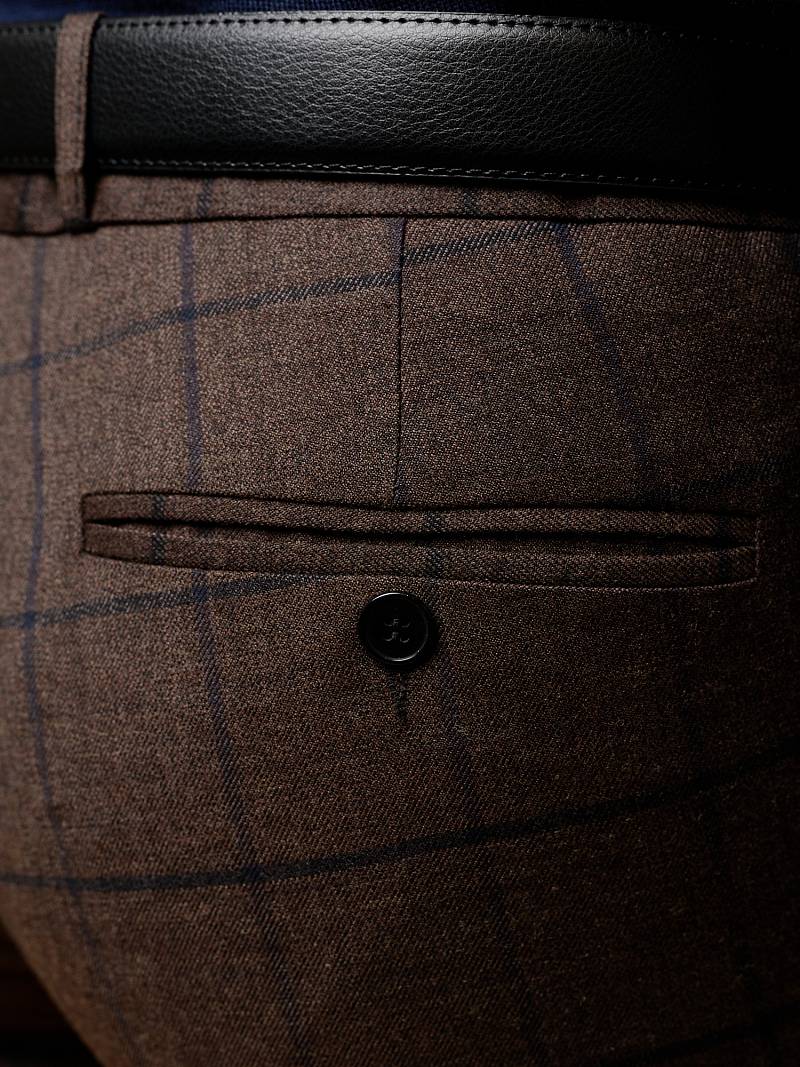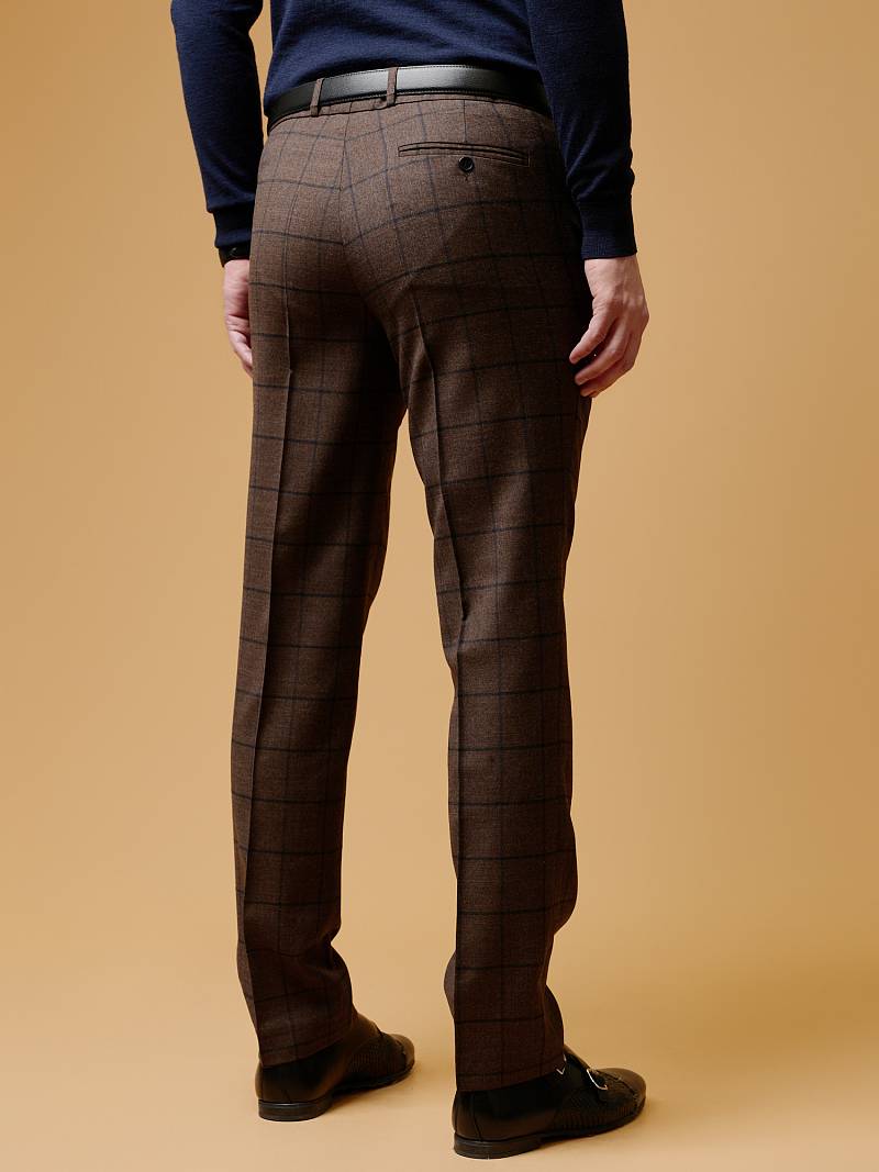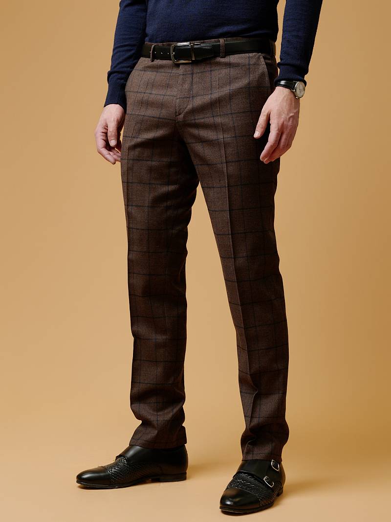 Slim fit (ПРИЛЕГАЮЩИЙ СИЛУЭТ), рекомендуется брать на размер больше. Брюки без защипов, с боковыми наклонными карманами и двумя задними карманами «в рамку». Передние половинки на подкладке. Верхний срез брюк обработан поясом с корсажной лентой и шлевками под ремень. Застежка обработана на тесьму-молнию, с петлей-пуговицей на поясе и усилен металлическим крючком.