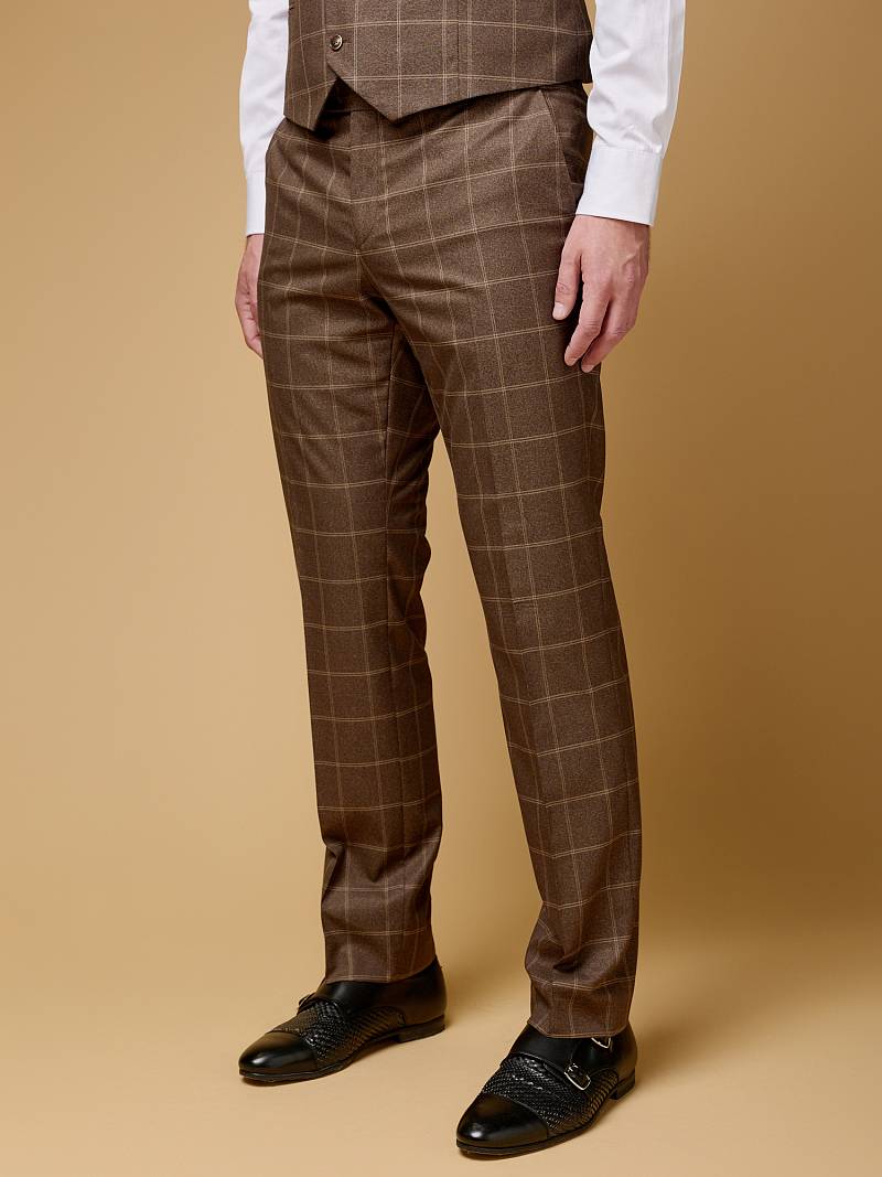 Slim fit (ПРИЛЕГАЮЩИЙ СИЛУЭТ), рекомендуется брать на размер больше. Брюки без защипов, с боковыми наклонными карманами и двумя задними карманами «в рамку». Передние половинки на подкладке. Верхний срез брюк обработан поясом с корсажной лентой и шлевками под ремень. Застежка обработана на тесьму-молнию, с петлей-пуговицей на поясе и усилен металлическим крючком.