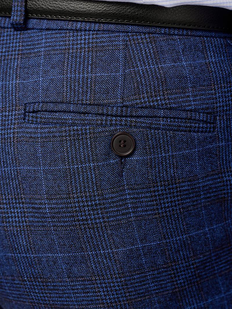 Slim fit (ПРИЛЕГАЮЩИЙ СИЛУЭТ), рекомендуется брать на размер больше. Брюки без защипов, с боковыми наклонными карманами и двумя задними карманами «в рамку». Передние половинки на подкладке. Верхний срез брюк обработан поясом с корсажной лентой и шлевками под ремень. Застежка обработана на тесьму-молнию, с петлей-пуговицей на поясе и усилен металлическим крючком.