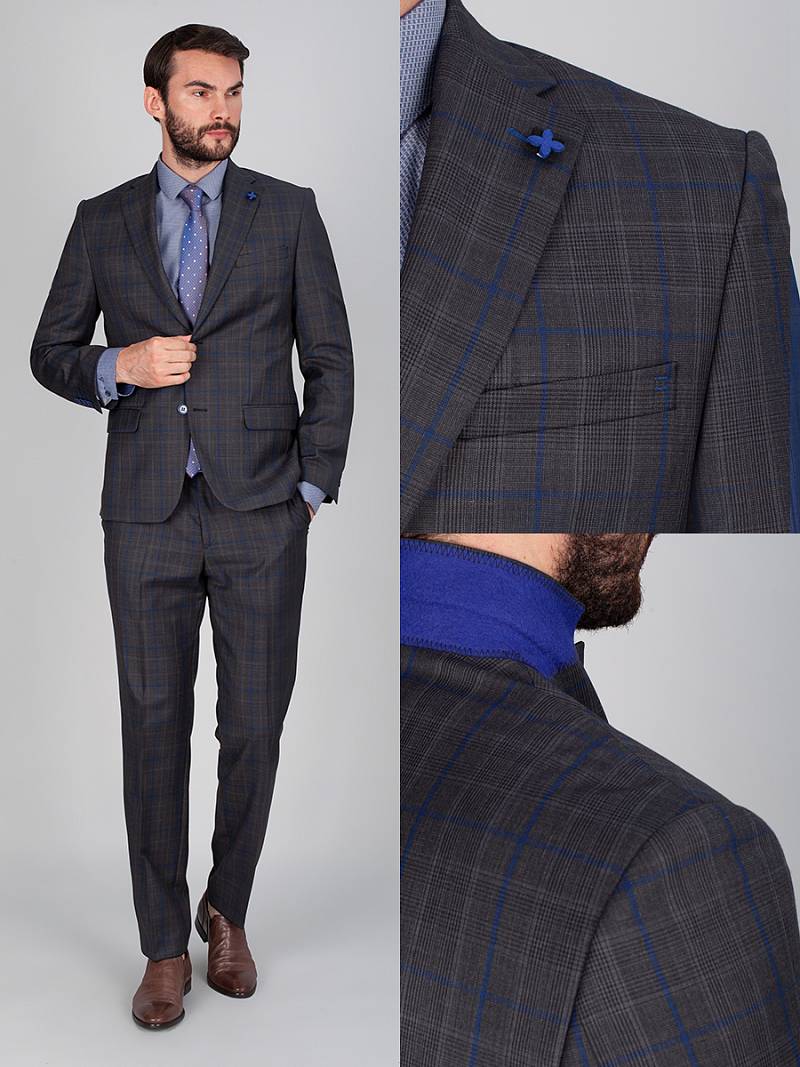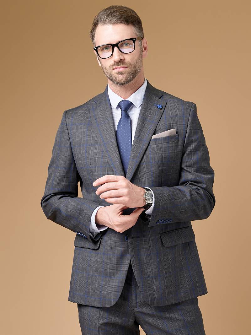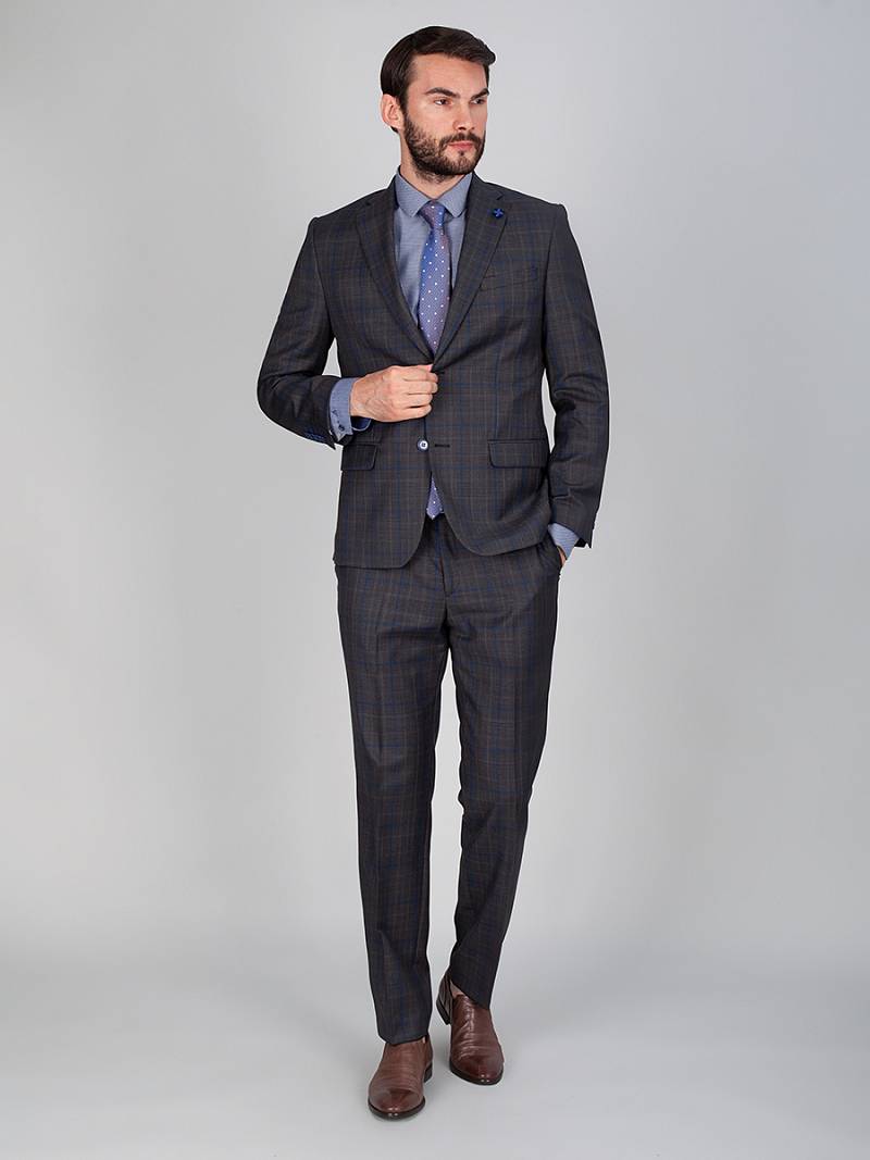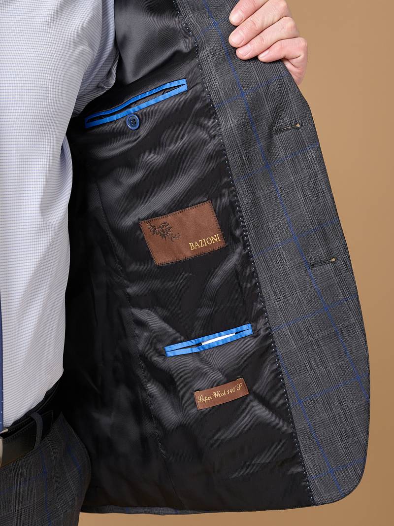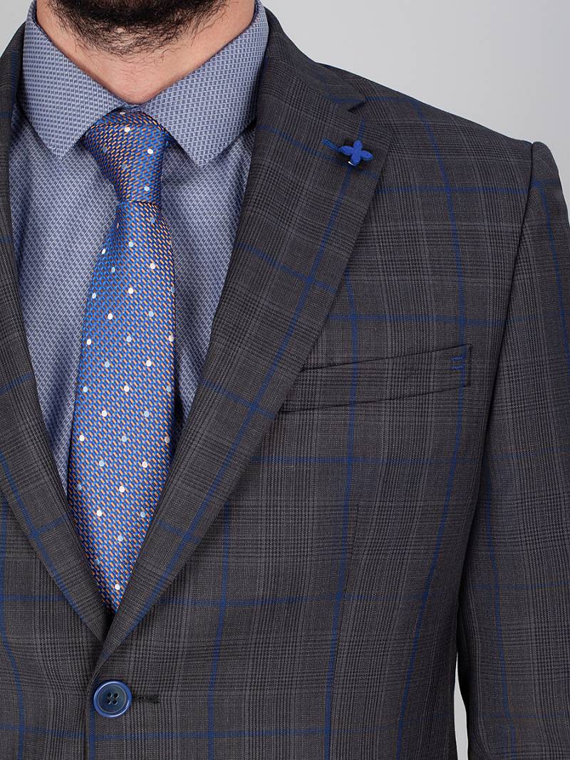 Classic fit, две пуговицы, две шлицы. Фасонная петля со значком на лацкане