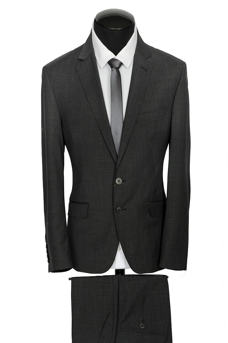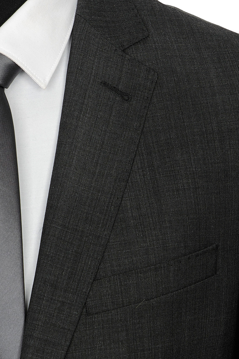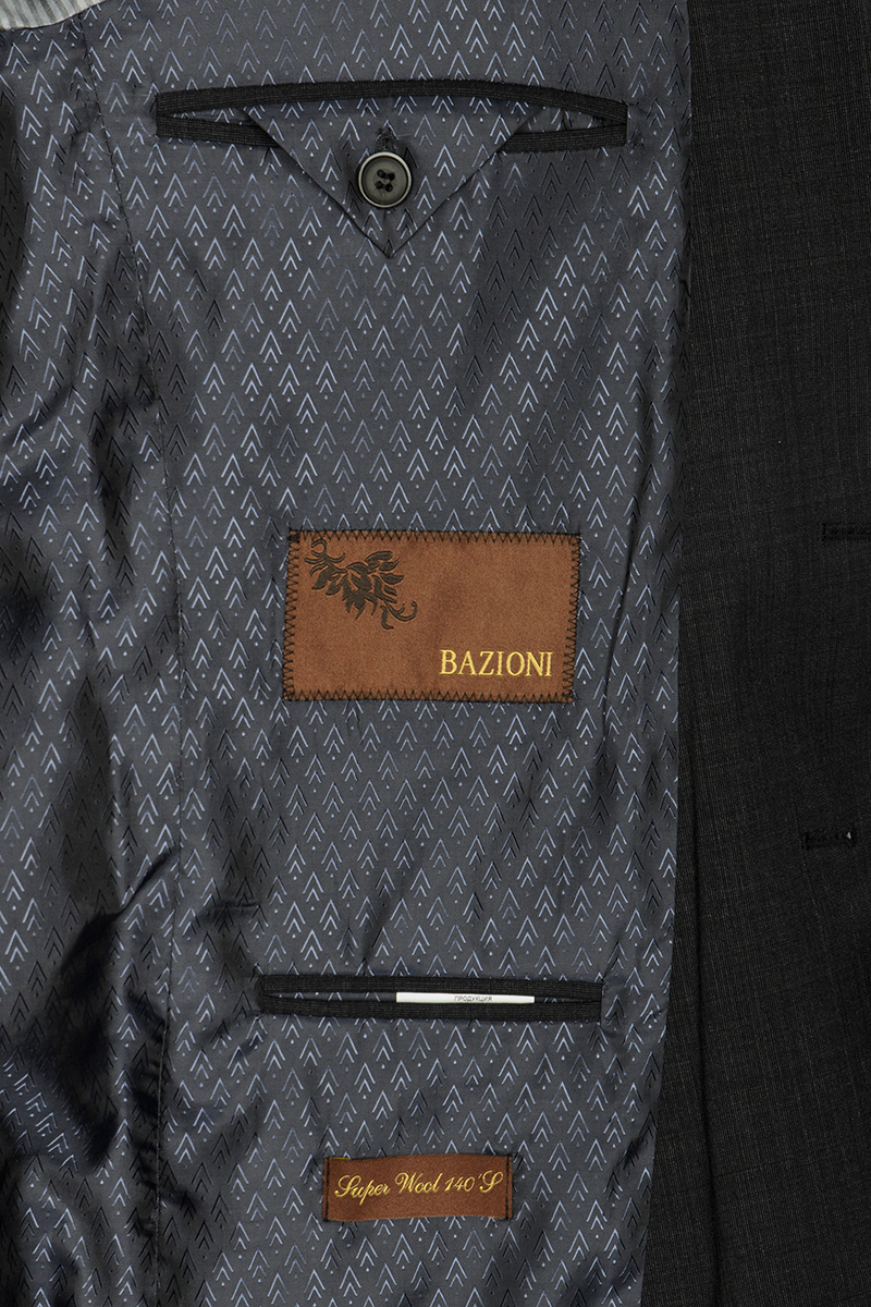 Slim fit, две пуговицы, две шлицы, две фасонные петли. Вспушка по воротнику, лацканам, борту, клапанам и листочке. BAZIONI.