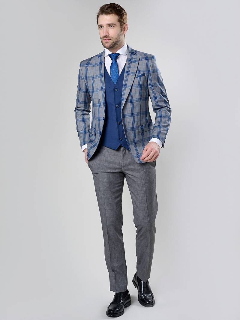 Классический костюм двойка Slim fit. Пиджак на две пуговицы, с боковыми и нагрудным карманами, по спинке две шлицы. Брюки без защипов с боковыми и двумя задними карманами, выполнены из ткани компаньона.