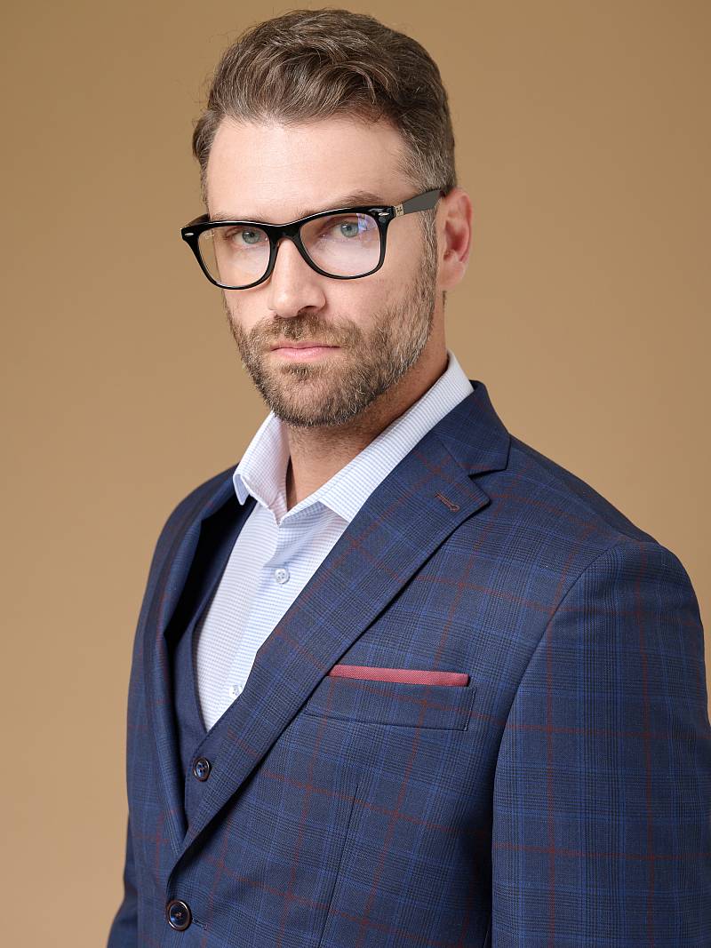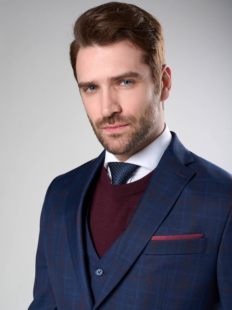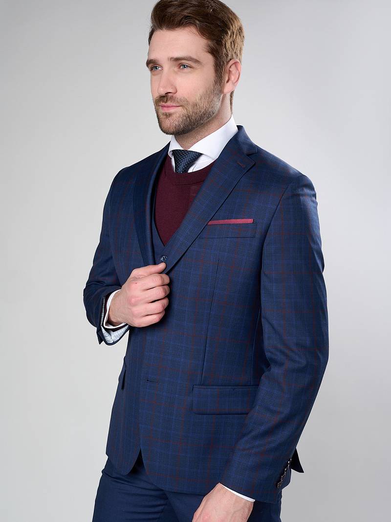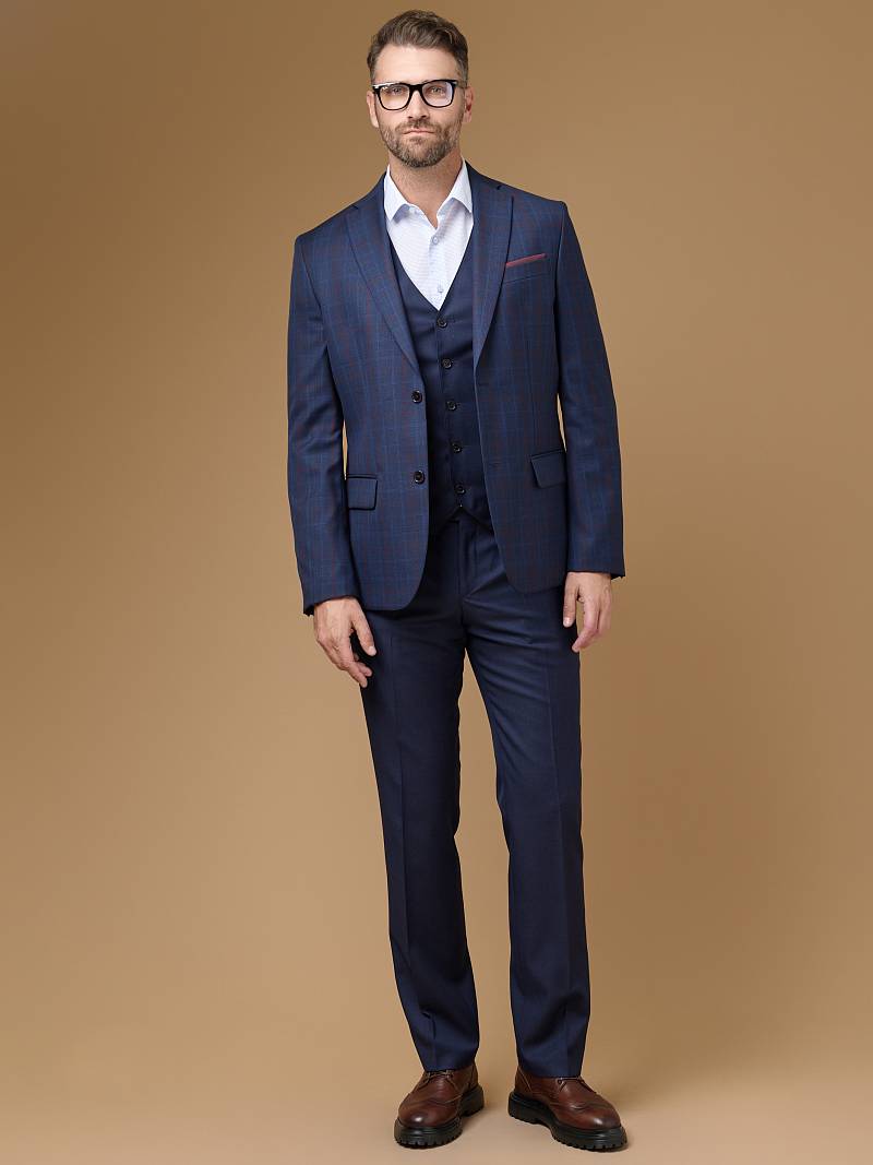 Классический костюм тройка Classic fit. Пиджак на две пуговицы, с боковыми и нагрудным карманами, по спинке две шлицы. Брюки без защипов с боковыми и одним задним карманом. Брюки и жилет выполнены из ткани компаньона