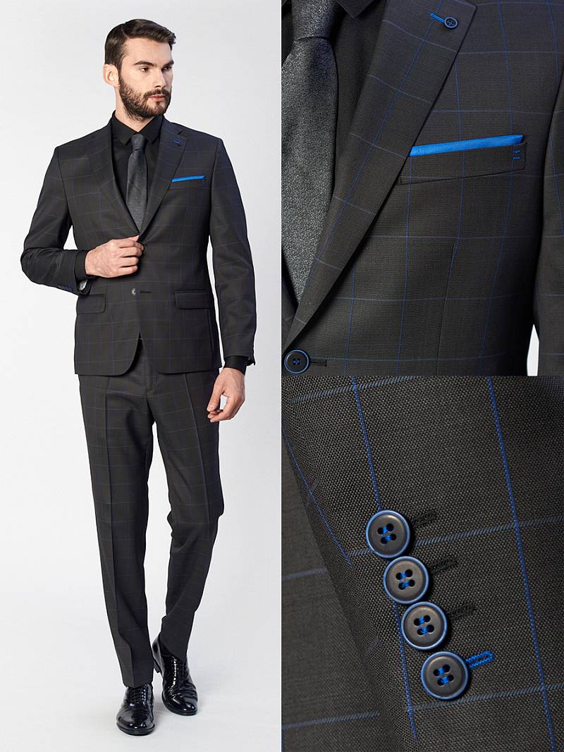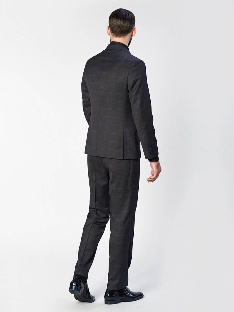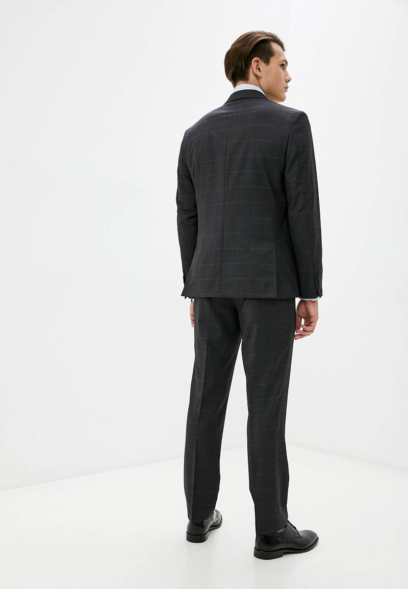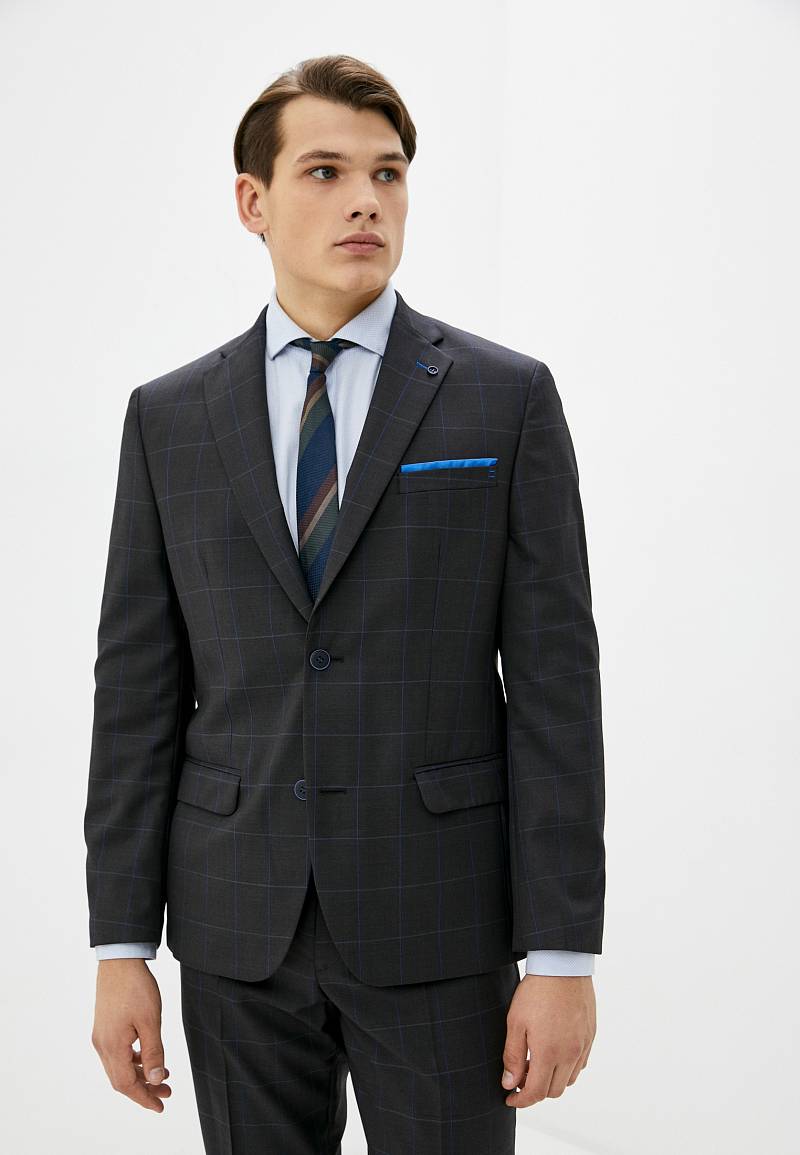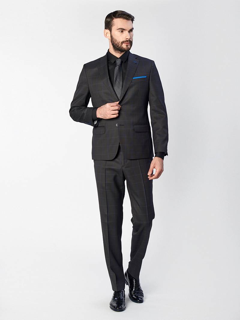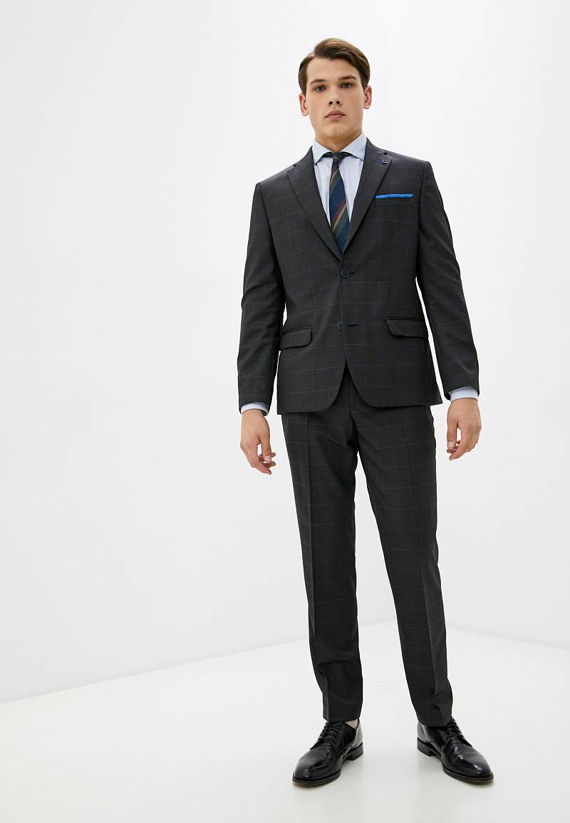 Классический костюм двойка Classic fit. Пиджак на две пуговицы, с боковыми и нагрудным карманами, по спинке две шлицы, в фасонной петле значок. Брюки без защипов с боковыми и одним задним карманом.