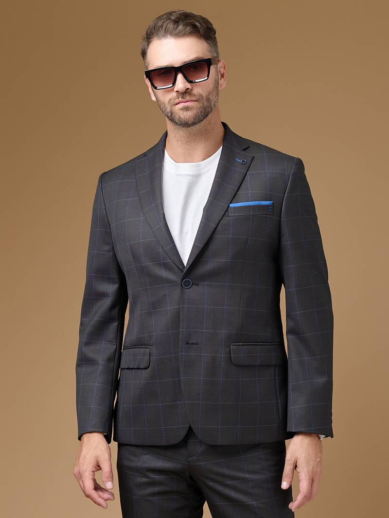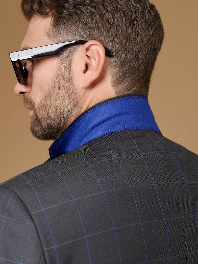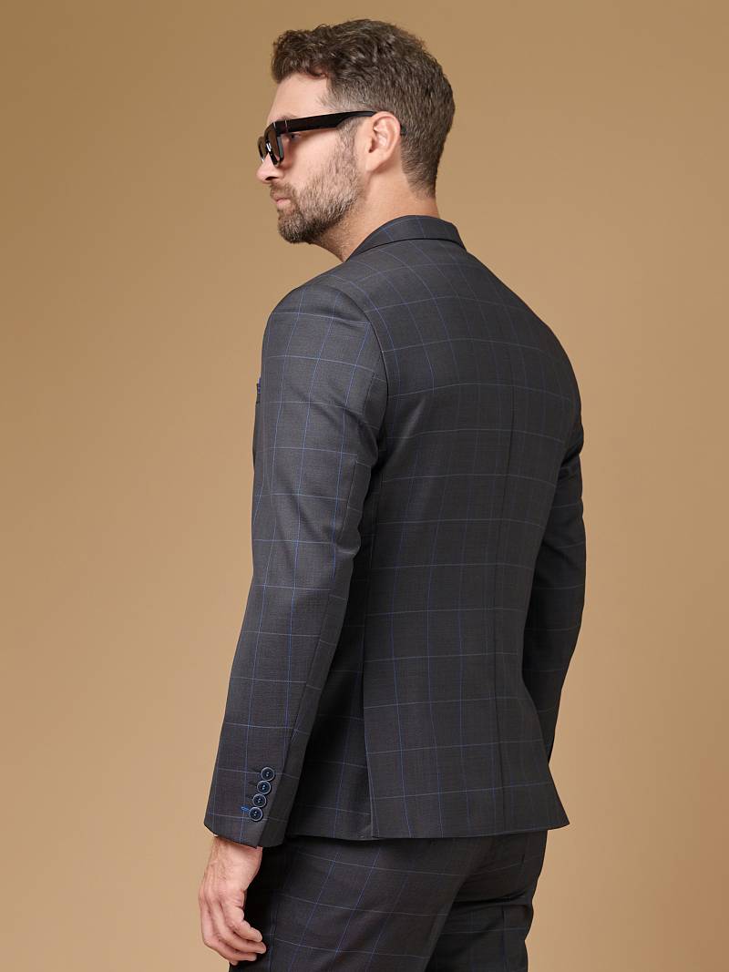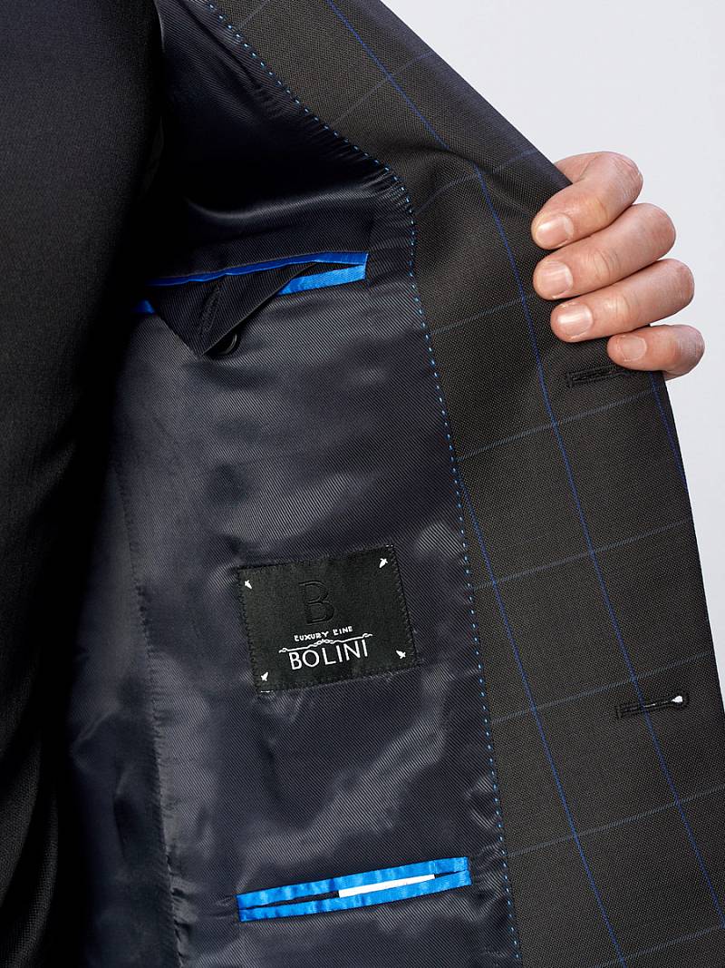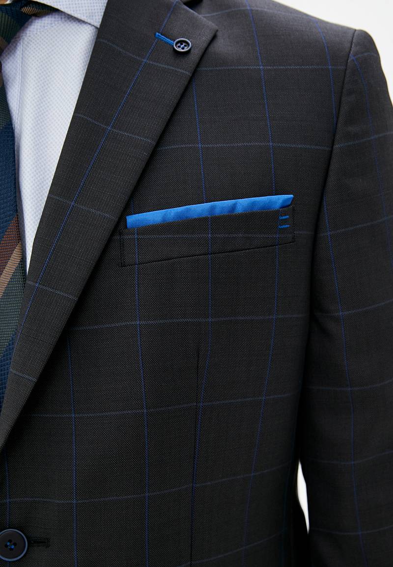 Классический костюм двойка Classic fit. Пиджак на две пуговицы, с боковыми и нагрудным карманами, по спинке две шлицы, в фасонной петле значок. Брюки без защипов с боковыми и одним задним карманом.