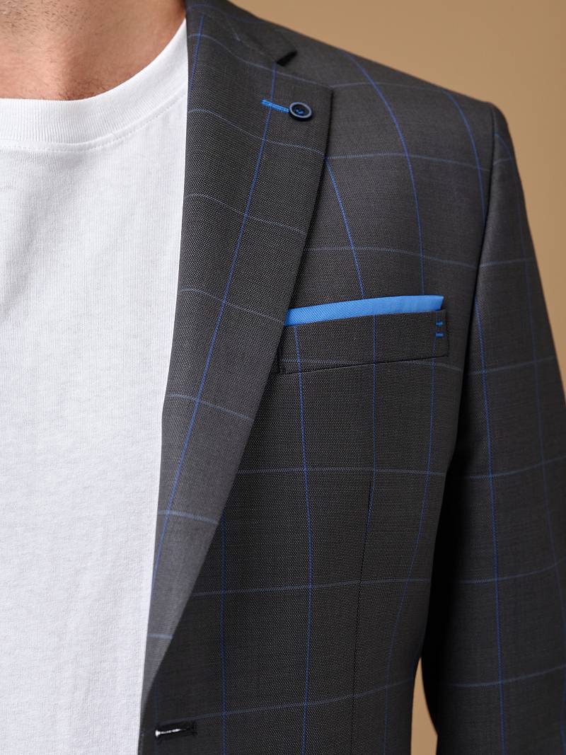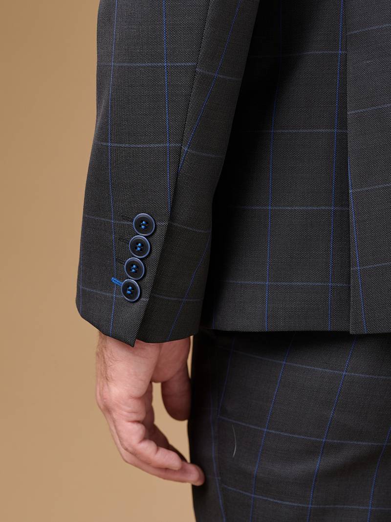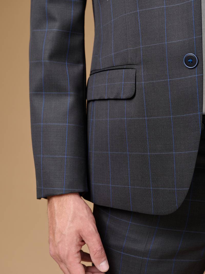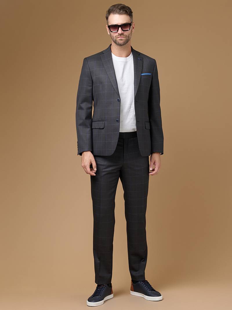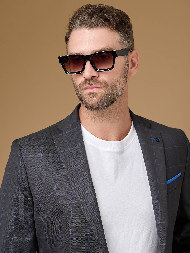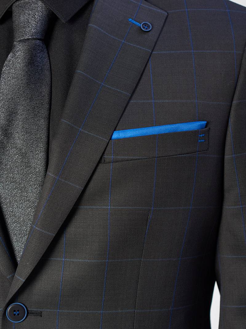 Классический костюм двойка Classic fit. Пиджак на две пуговицы, с боковыми и нагрудным карманами, по спинке две шлицы, в фасонной петле значок. Брюки без защипов с боковыми и одним задним карманом.