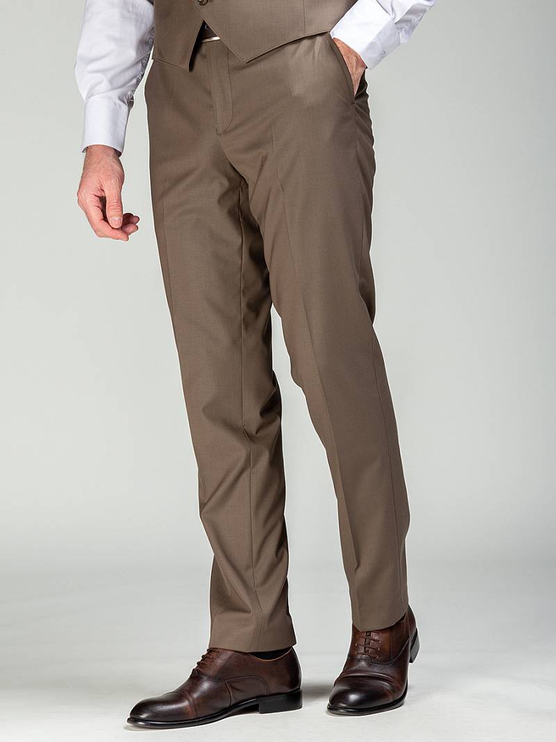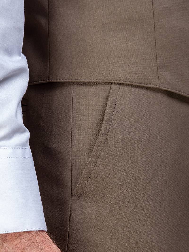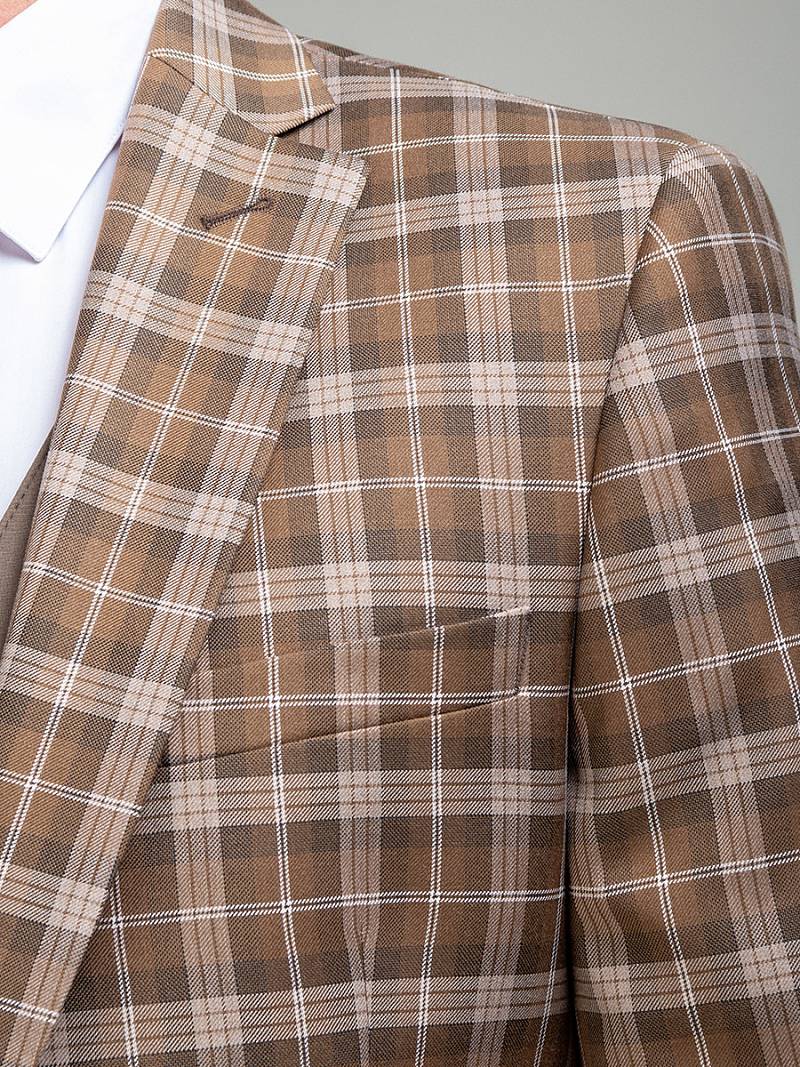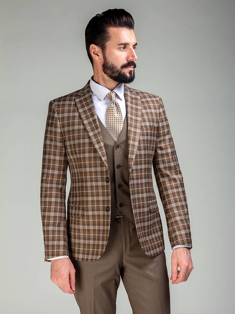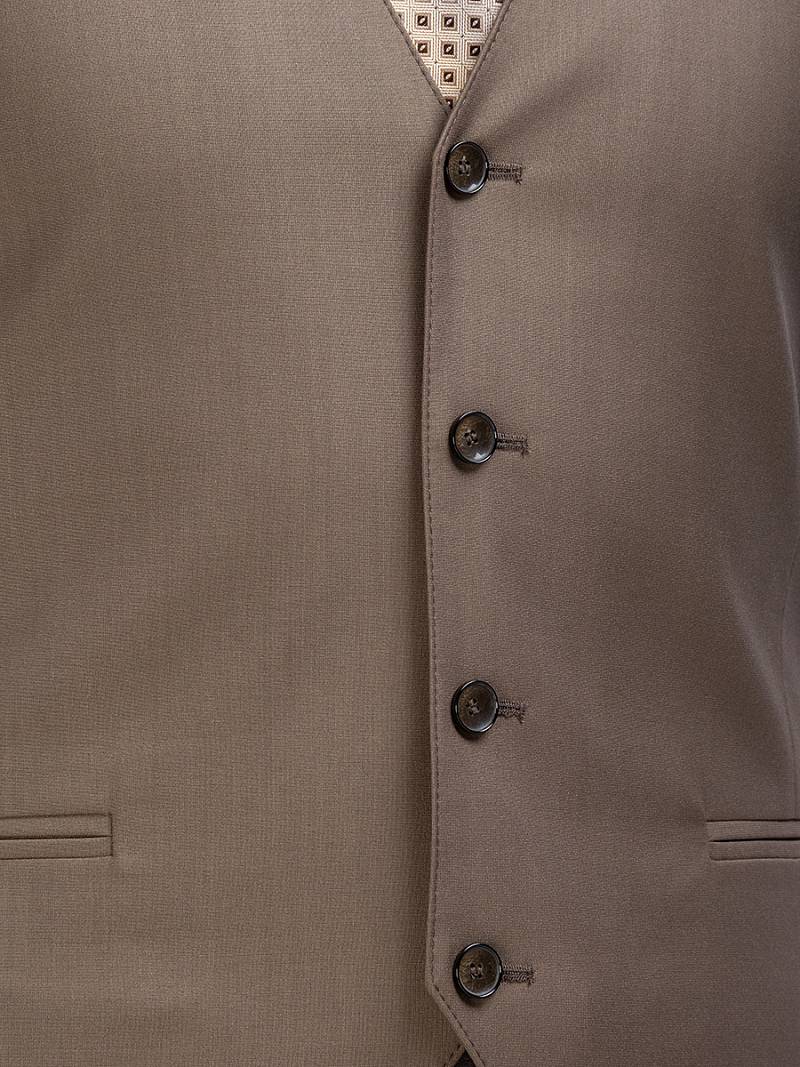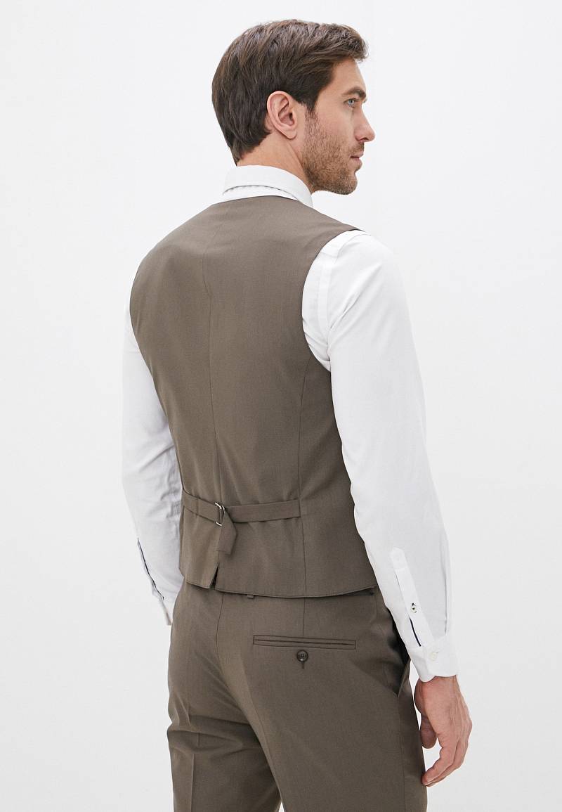 Классический костюм-тройка Slim fit. Пиджак на две пуговицы, с боковыми и нагрудным карманами, по спинке две шлицы. Брюки без защипов в боковыми и одним задним карманом. Жилет и брюки выполнены из ткани компаньона.