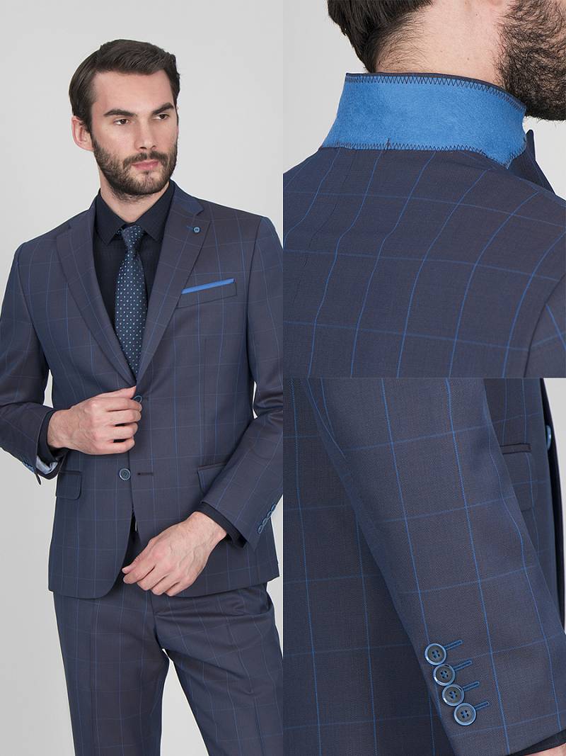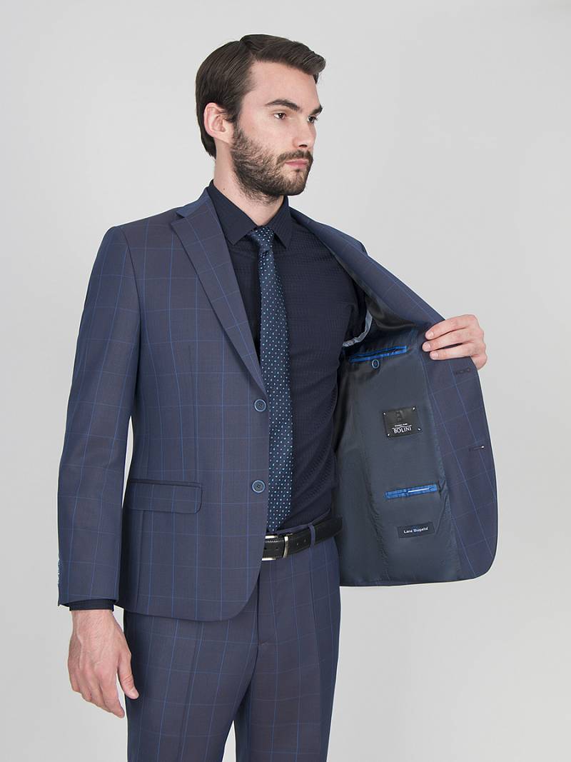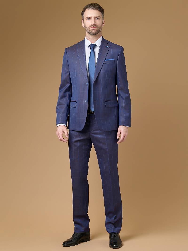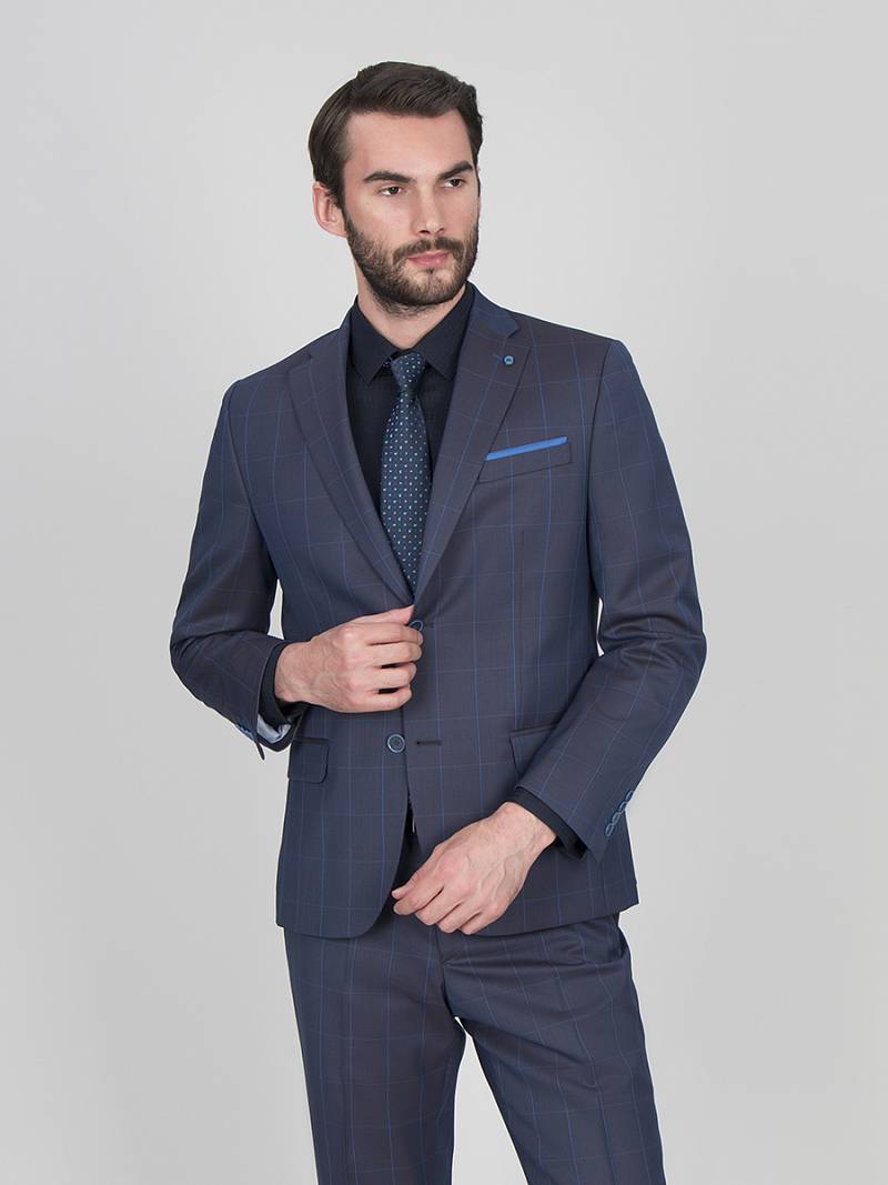 Классический костюм двойка Classic fit. Пиджак на две пуговицы, с боковыми и нагрудным карманами, по спинке две шлицы, в нагрудном кармане расположен декоративный платок, в фасонной петле значок. Брюки без защипов с боковыми и одним задним карманом.