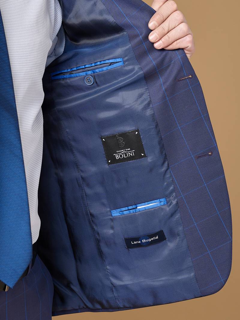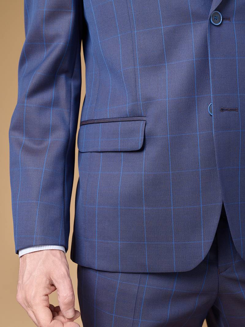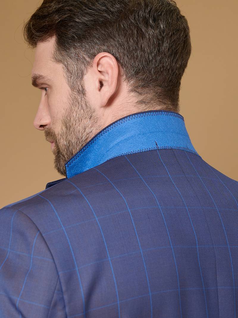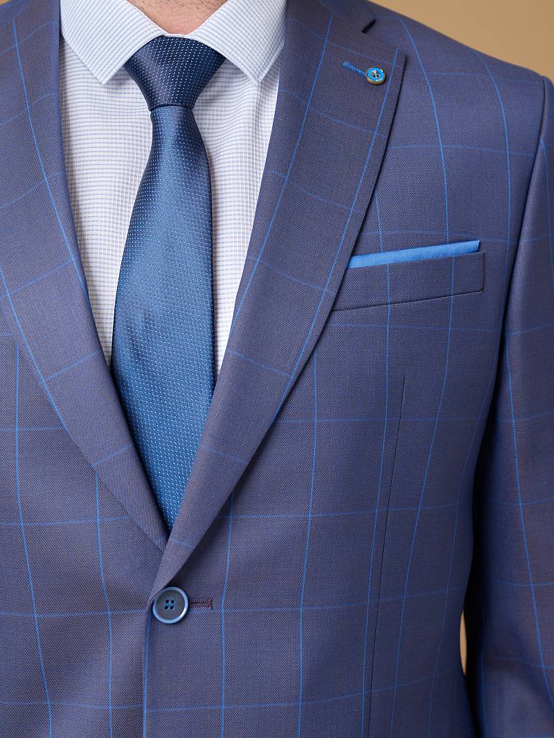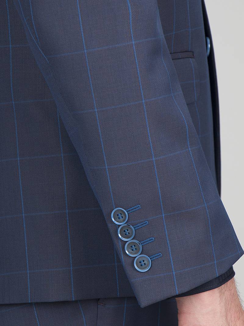 Классический костюм двойка Classic fit. Пиджак на две пуговицы, с боковыми и нагрудным карманами, по спинке две шлицы, в нагрудном кармане расположен декоративный платок, в фасонной петле значок. Брюки без защипов с боковыми и одним задним карманом.