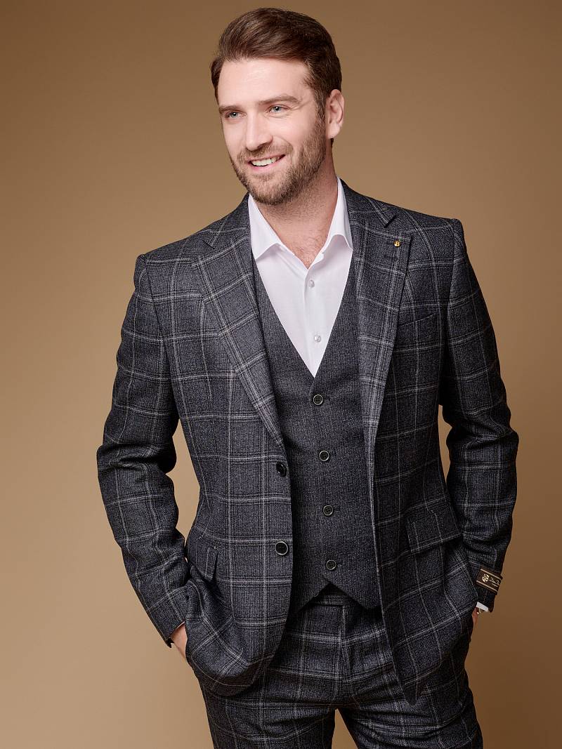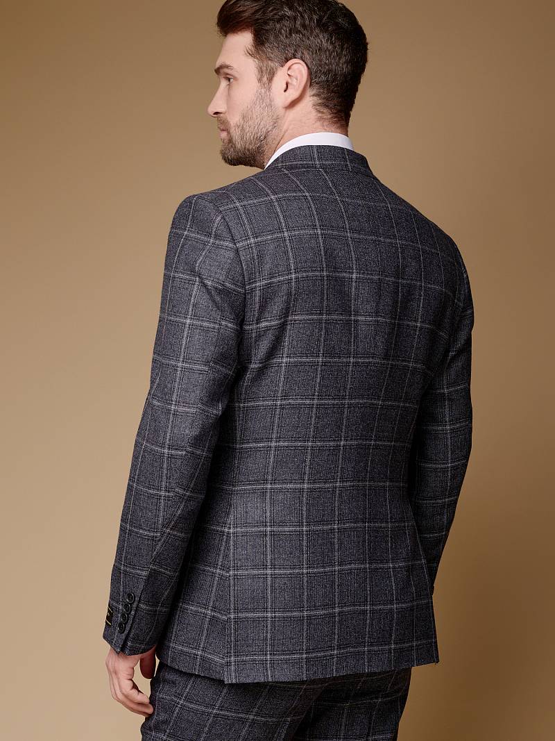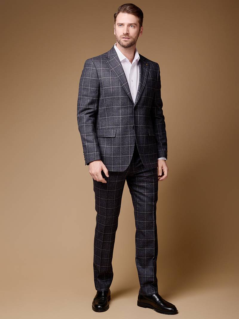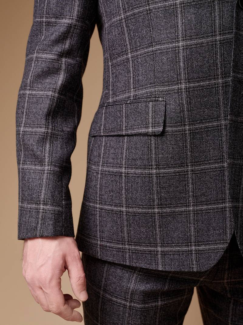 Classic fit (ПОЛУПРИЛЕГАЮЩИЙ СИЛУЭТ), Пиджак однобортный на две пуговицы, с двумя боковыми карманами и нагрудной листочкой. Рукава втачные, двухшовные со шлицей и четырьмя декоративными пуговицами. По спинке расположены две шлицы. Пиджак на подкладке, с двумя внутренними карманами.