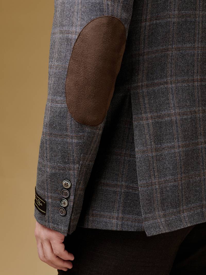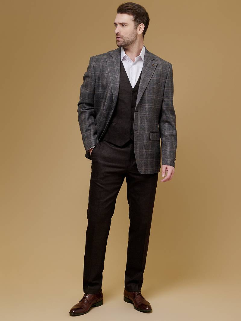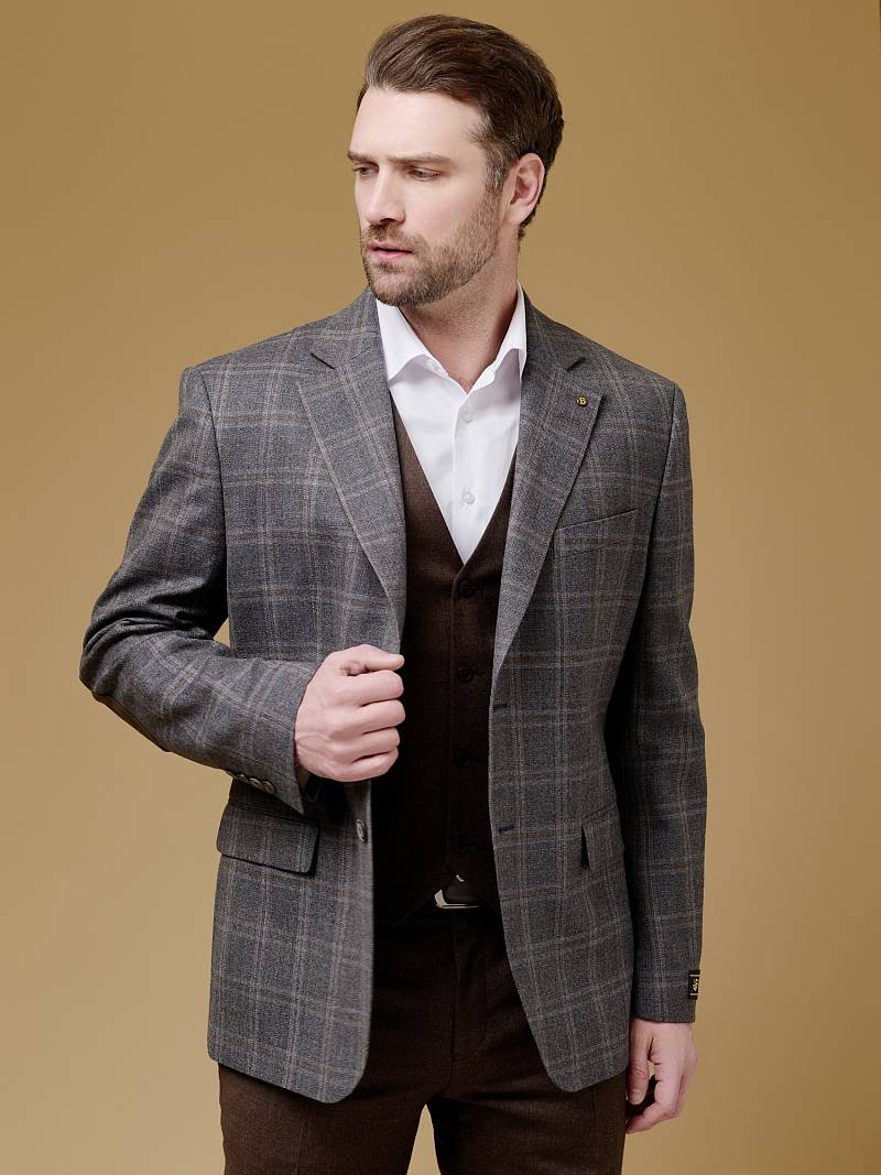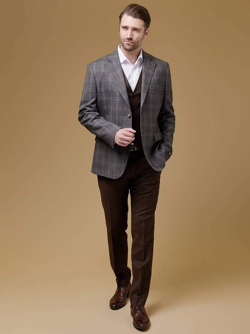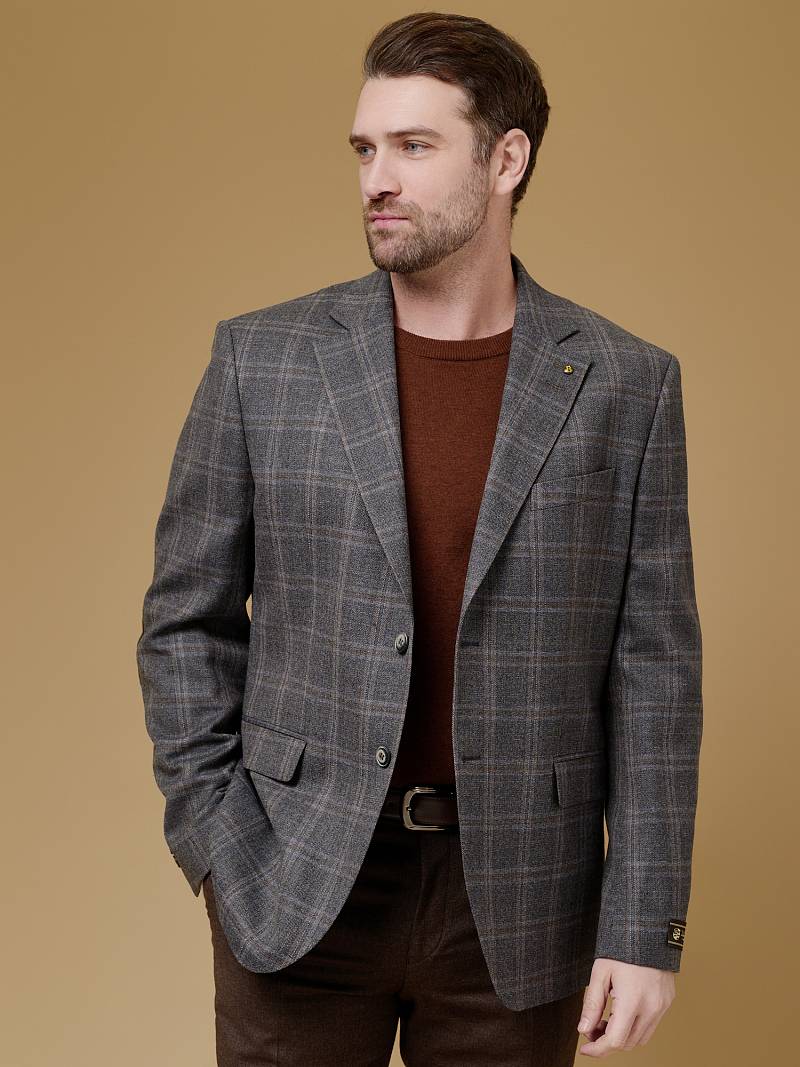 Classic fit (ПОЛУПРИЛЕГАЮЩИЙ СИЛУЭТ), Пиджак однобортный на две пуговицы, с двумя боковыми карманами и нагрудной листочкой. Рукава с налокотниками, втачные,двухшовные со шлицей и четырьмя декоративными пуговицами. По спинке расположены две шлицы. Пиджак на подкладке, с двумя внутренними карманами.