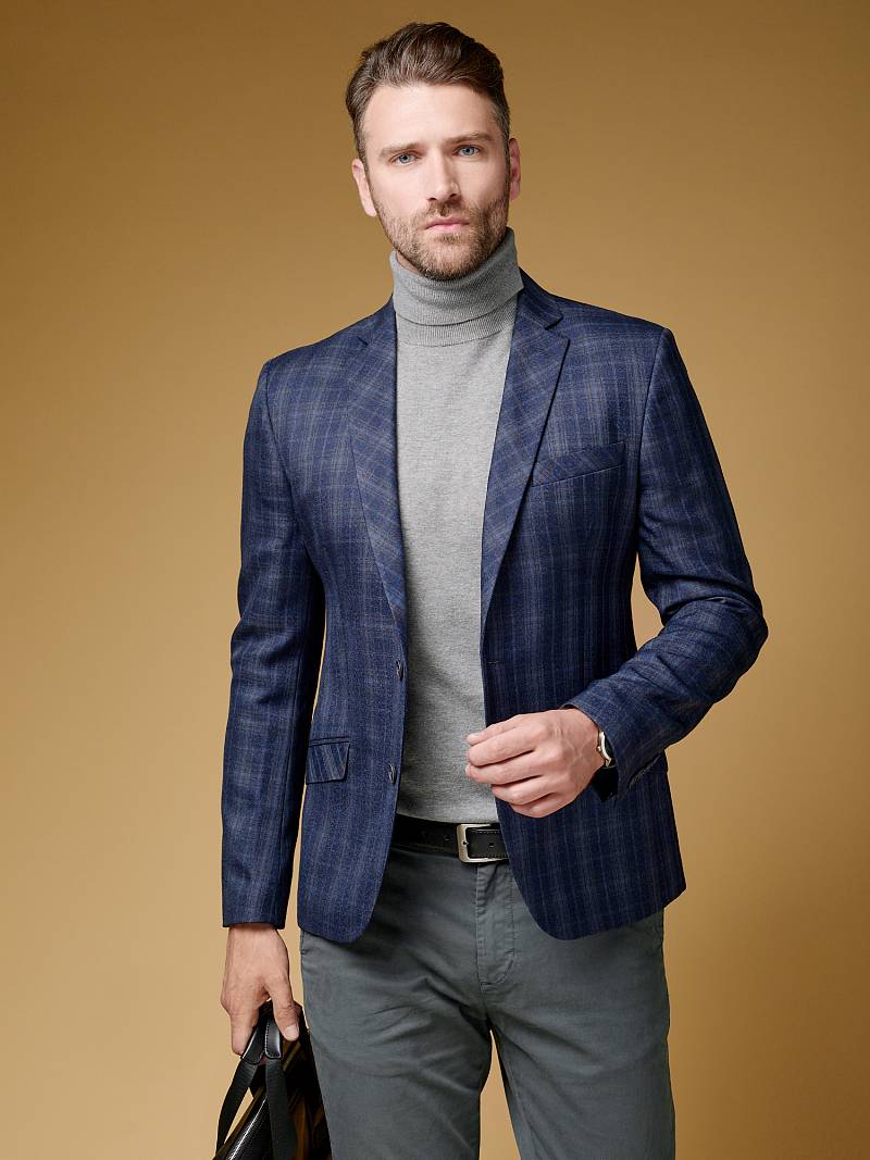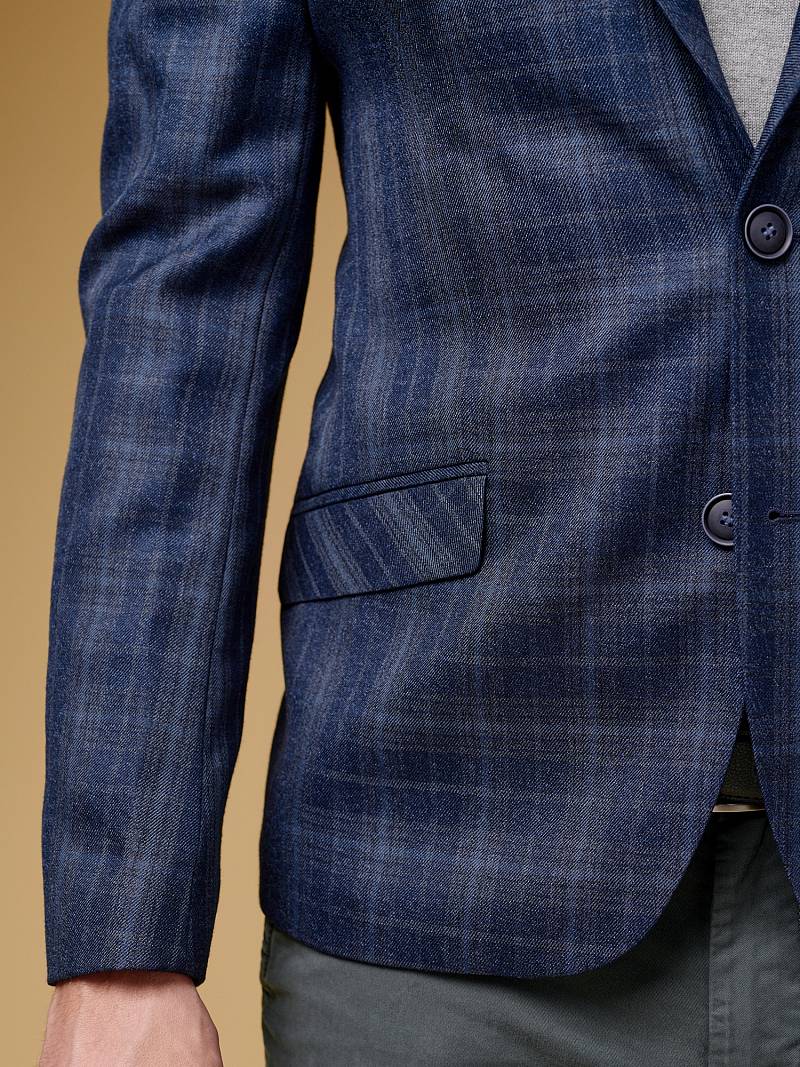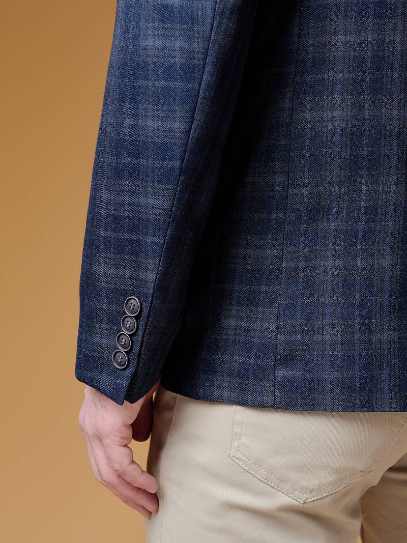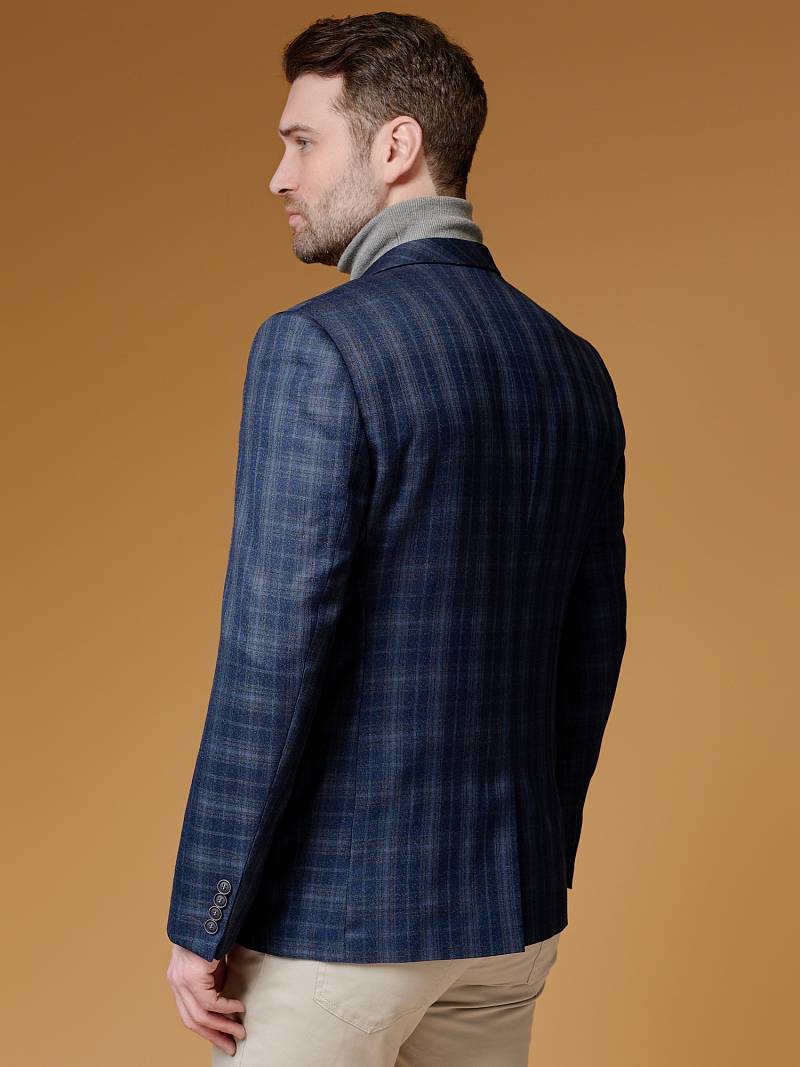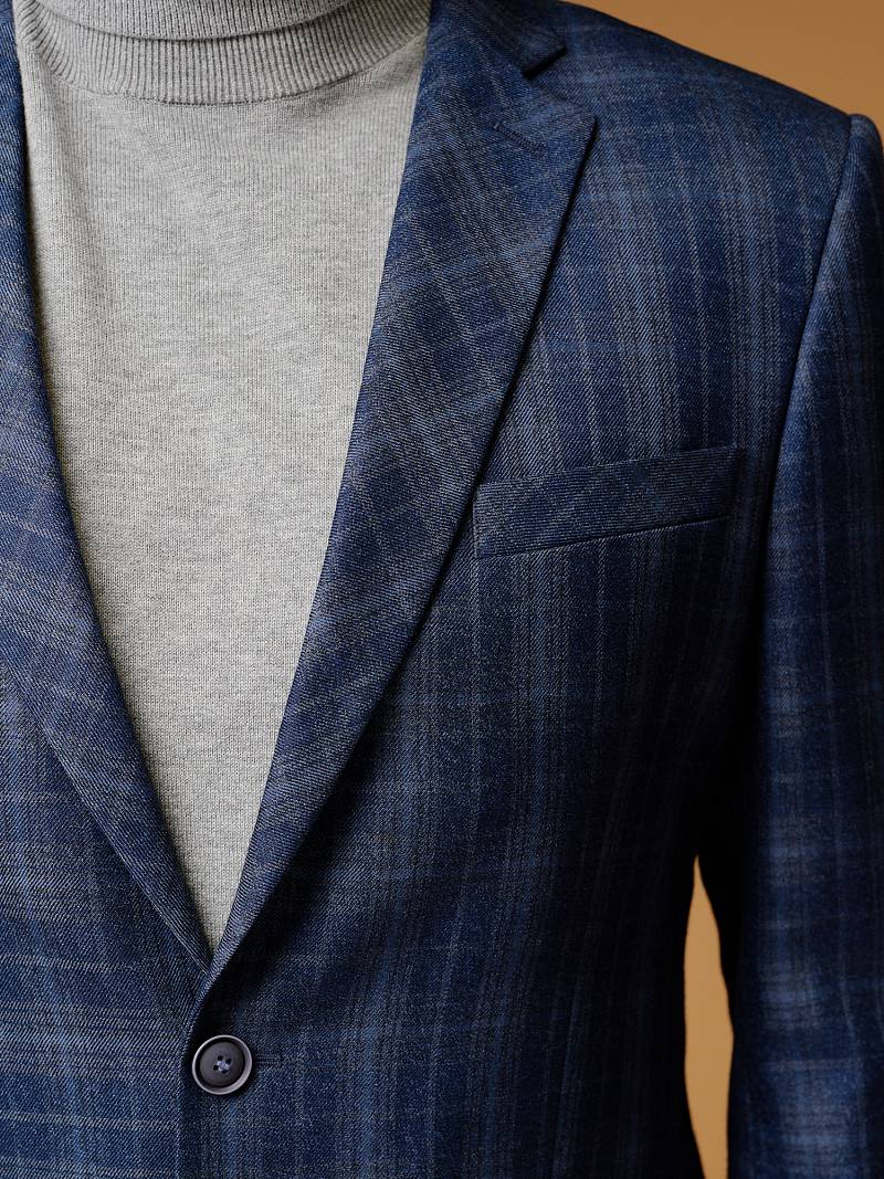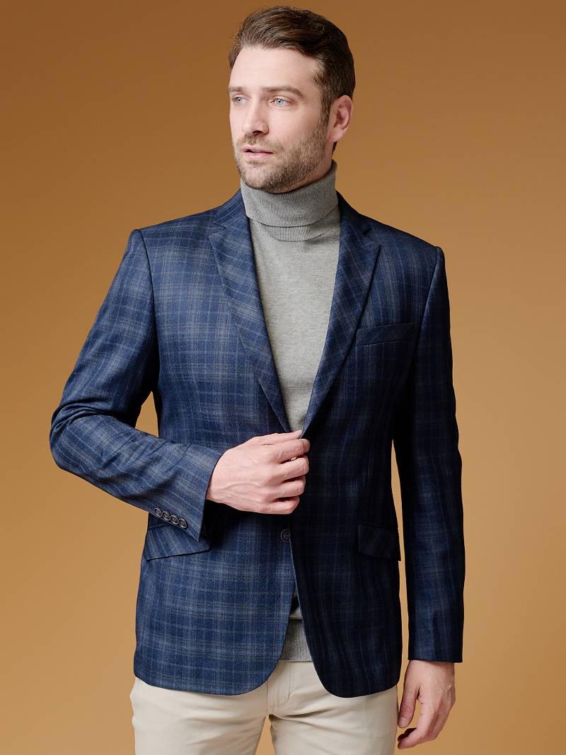 Classic fit, две пуговицы, одна шлица. Лацкана, нагрудная листочка и клапаны карманов по косой.