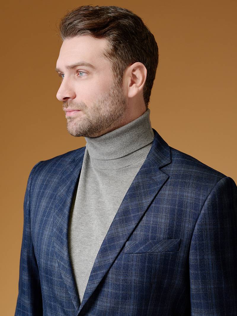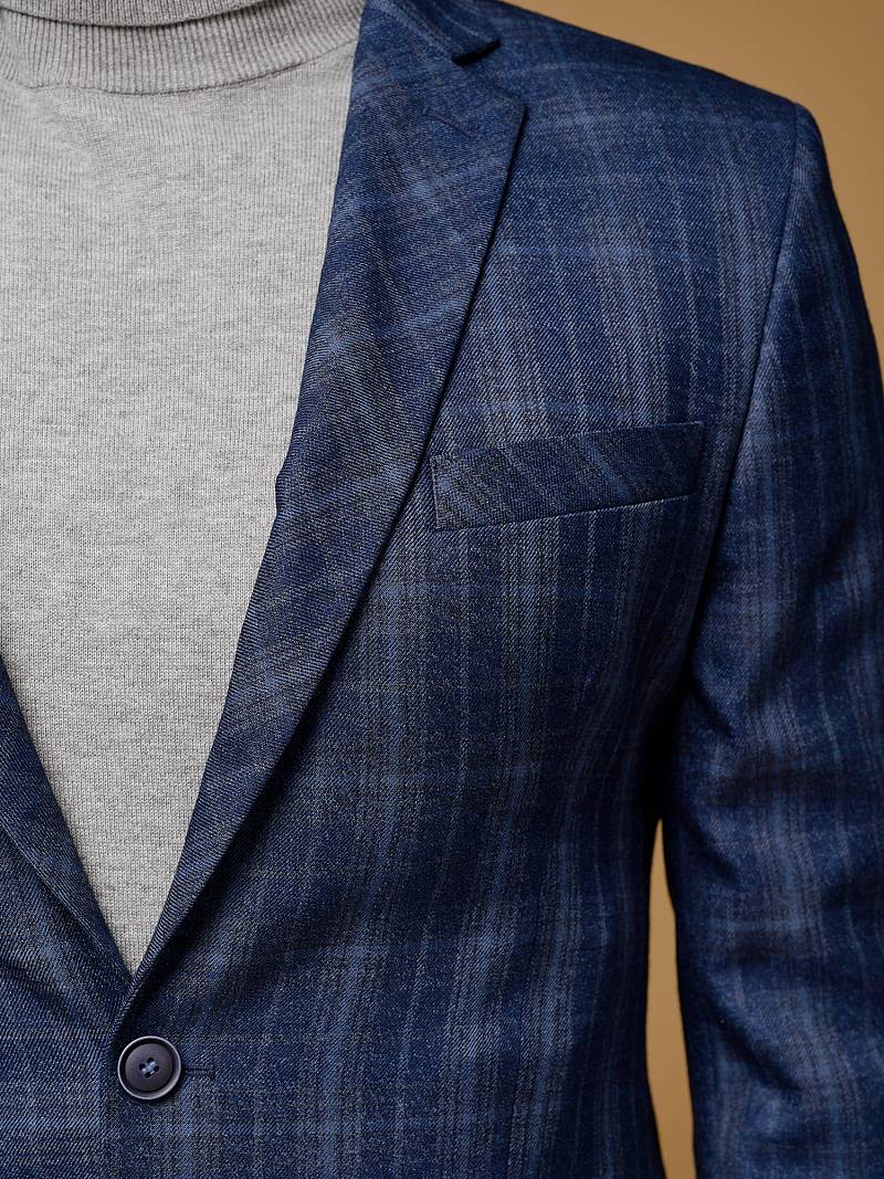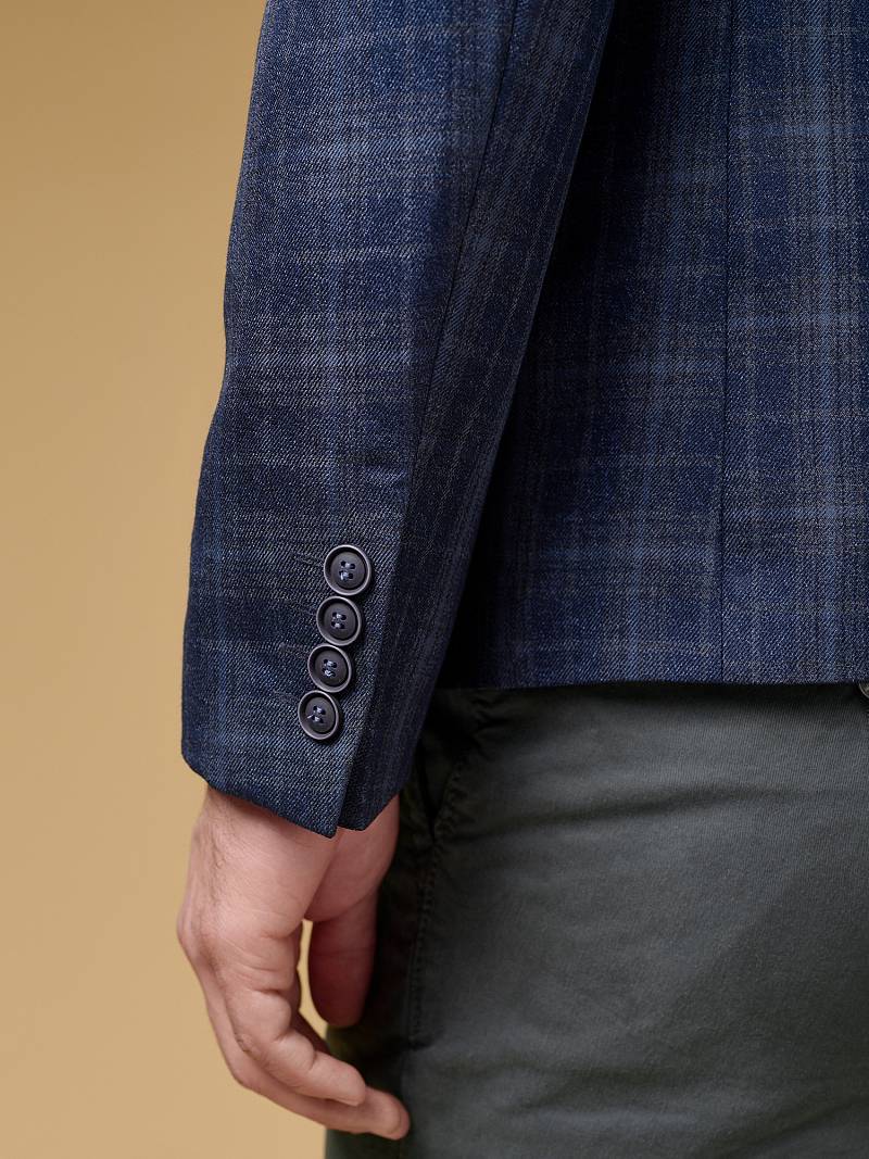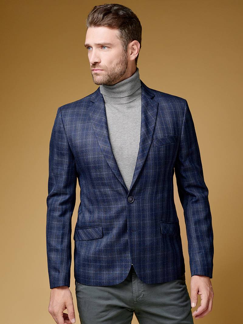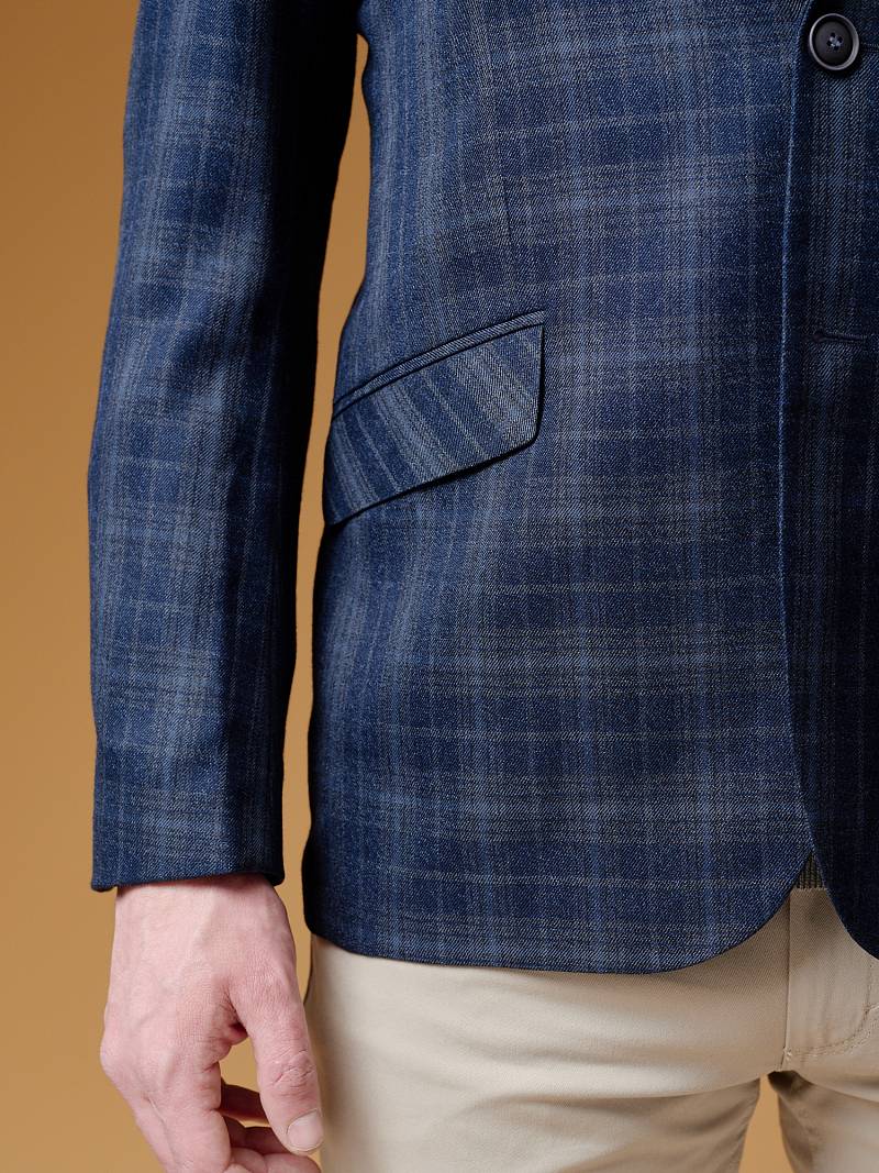Classic fit, две пуговицы, одна шлица. Лацкана, нагрудная листочка и клапаны карманов по косой.