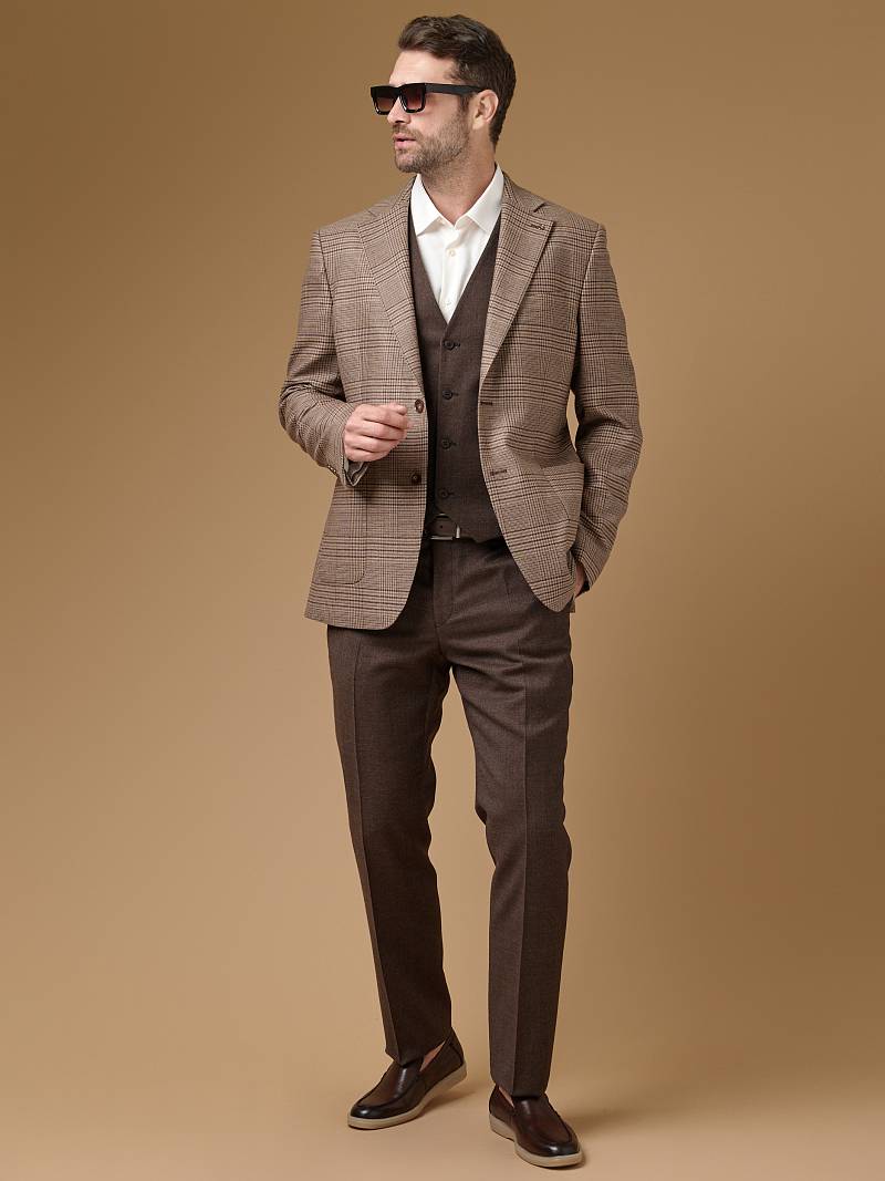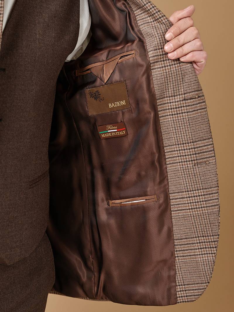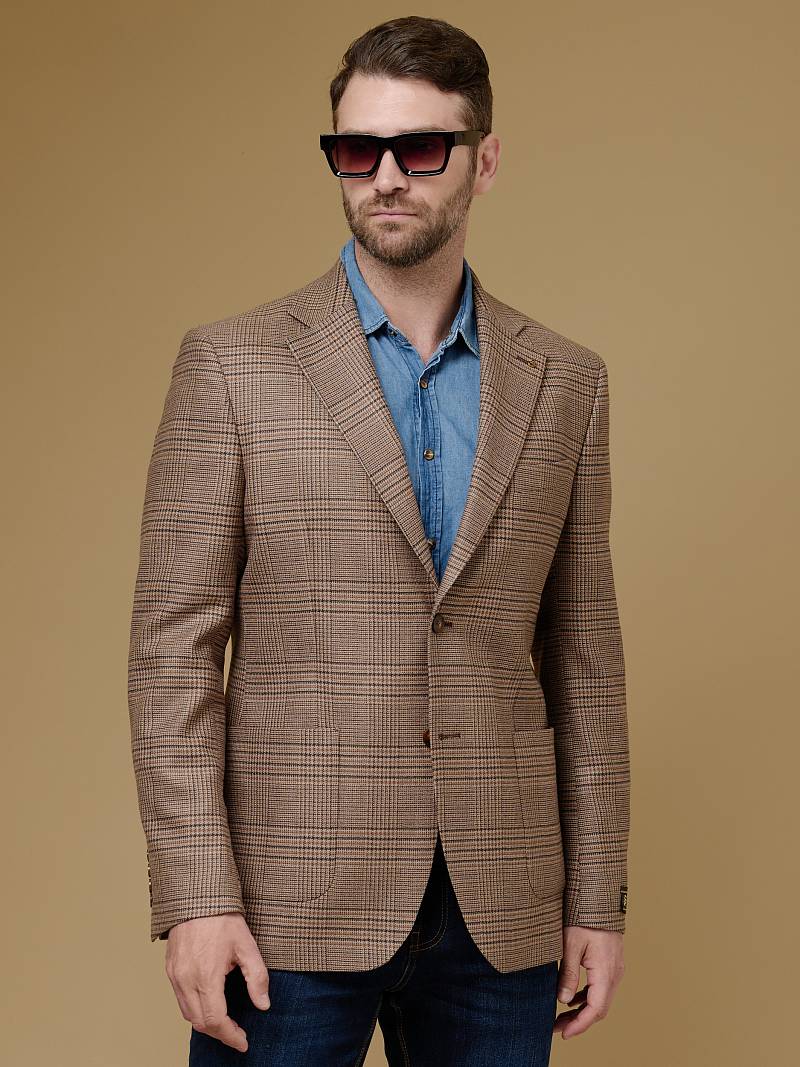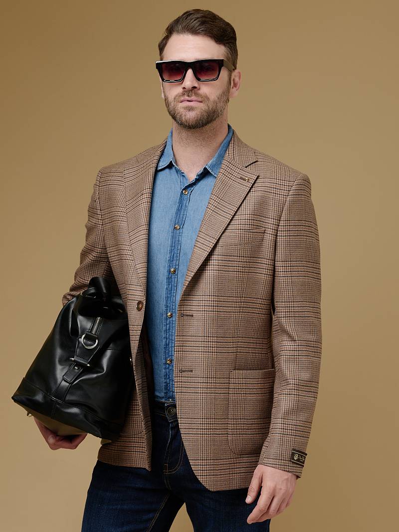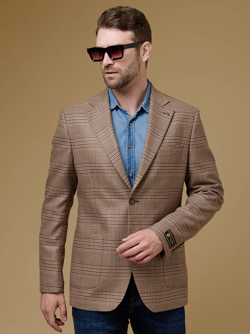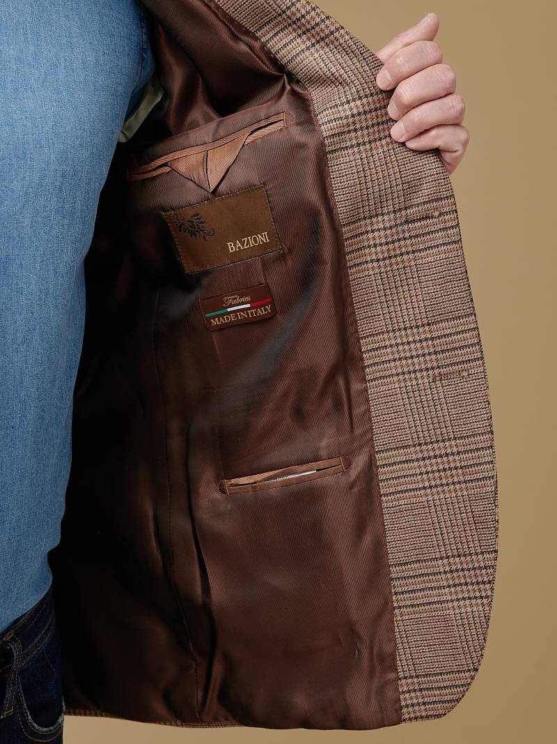 Classic fit (ПОЛУПРИЛЕГАЮЩИЙ СИЛУЭТ). Классическая однобортная модель на две пуговицы из шерстяной ткани в клетку подойдет для любого случая в жизни и завершит образ в стиле smart casual. Пиджак с широкими лацканами и мягкой линией плеч отлично сядет по фигуре, а расположенные по спинке две шлицы обеспечат дополнительный комфорт и свободу движения. Для придания образу торжественности подкладку нагрудного кармана можно использовать как платок-паше. Лацканы украсили небольшим значком в виде эмблемы бренда. Обработан пиджак шелковой подкладкой с двумя внутренними карманами. Дизайнеры марки BAZIONI тщательно подходят к выбору материалов. Пуговицы подбираются и красятся индивидуально под каждую ткань, а прикладные материалы используют только от передовых производителей. Пиджак мужской, классический, под джины, повседневный, молодежный, casual, для работы в офисе, модный, для мужа, сына, брата, на праздник.