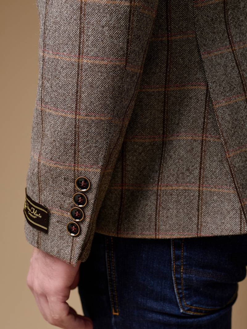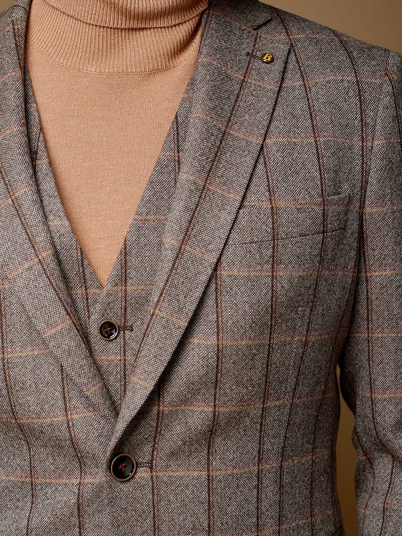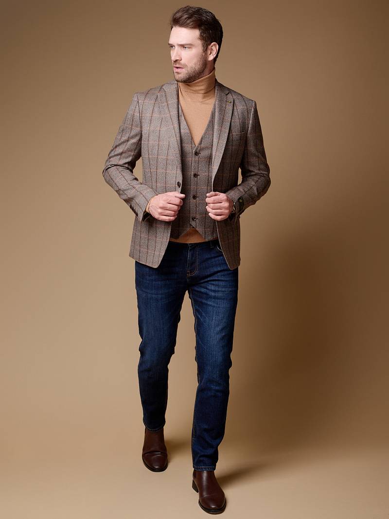 Slim fit (ПРИЛЕГАЮЩИЙ СИЛУЭТ), рекомендуется брать на размер больше. Пиджак однобортный на две пуговицы, с двумя боковыми карманами и нагрудной листочкой. Рукава втачные, двухшовные со шлицей и четырьмя декоративными пуговицами. По спинке расположены две шлицы. Пиджак на подкладке, с двумя внутренними карманами.