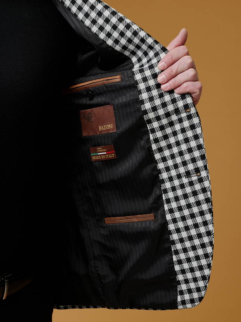 Slim fit (ПРИЛЕГАЮЩИЙ СИЛУЭТ), рекомендуется брать на размер больше. Пиджак однобортный на две пуговицы, с двумя боковыми карманами и нагрудной листочкой. Рукава втачные, двухшовные со шлицей и четырьмя декоративными пуговицами. По спинке расположены две шлицы. Пиджак на подкладке, с двумя внутренними карманами.