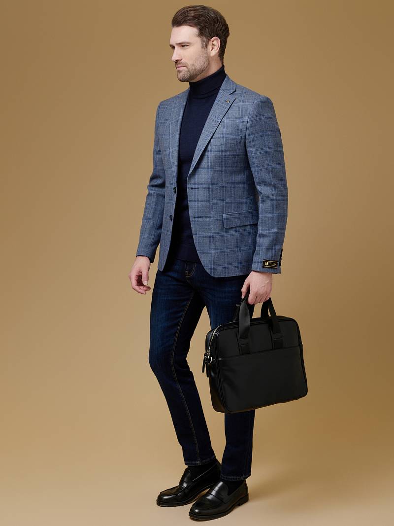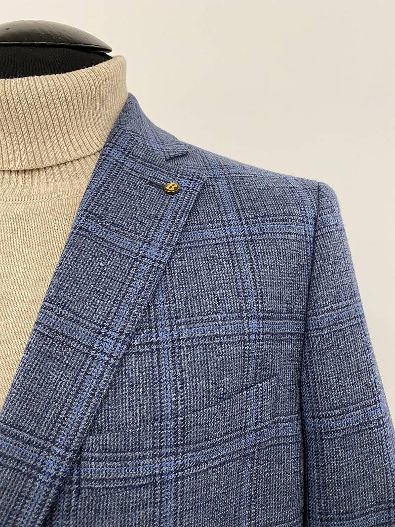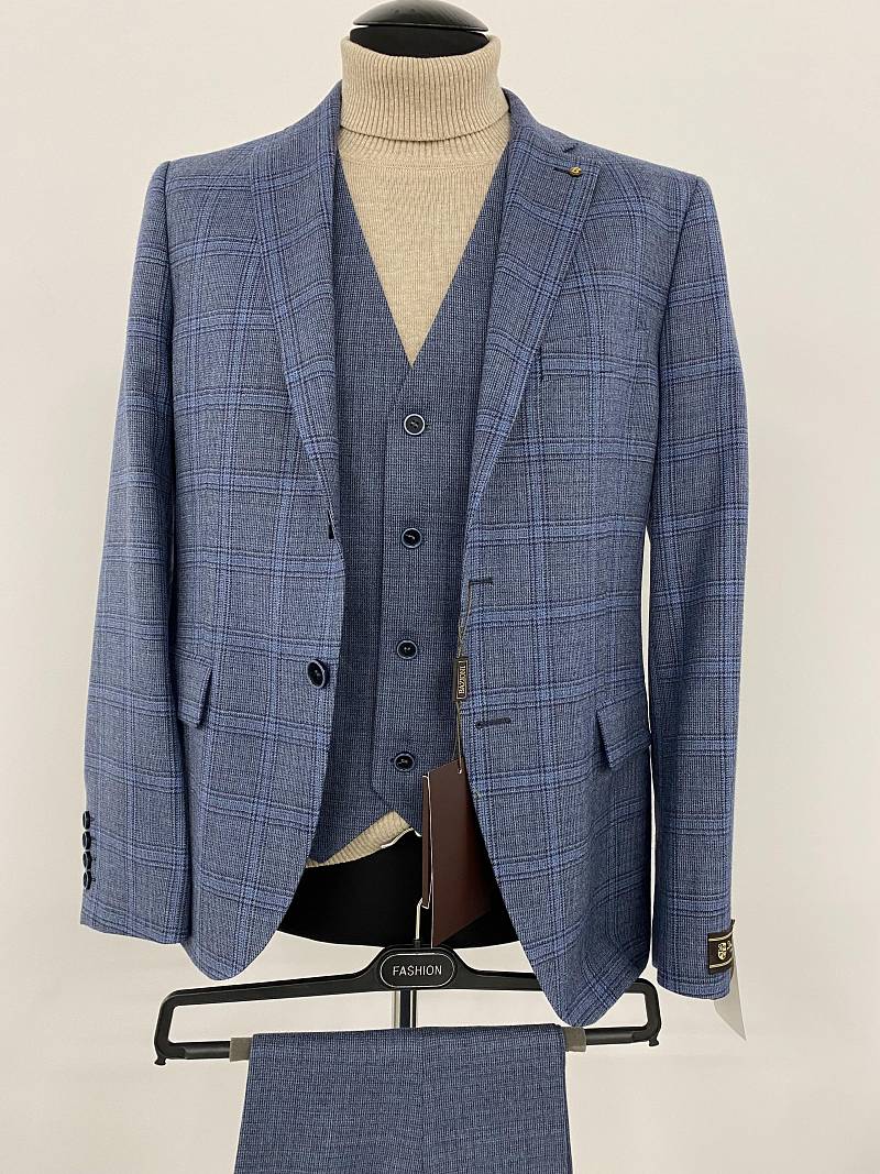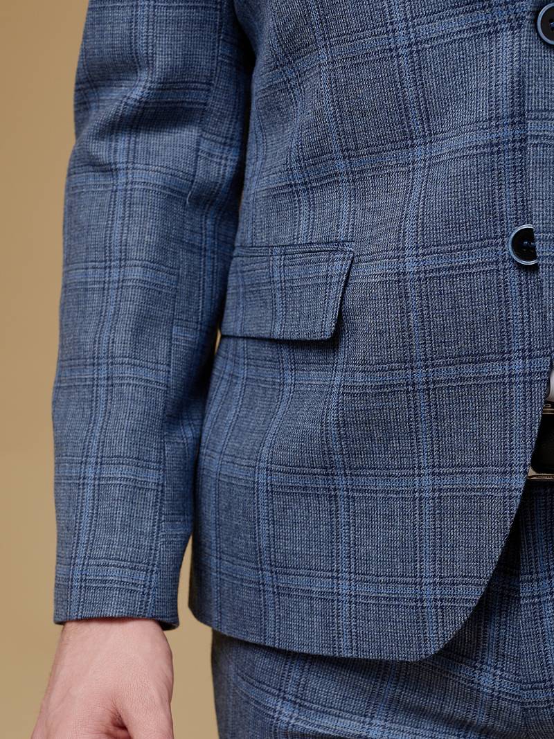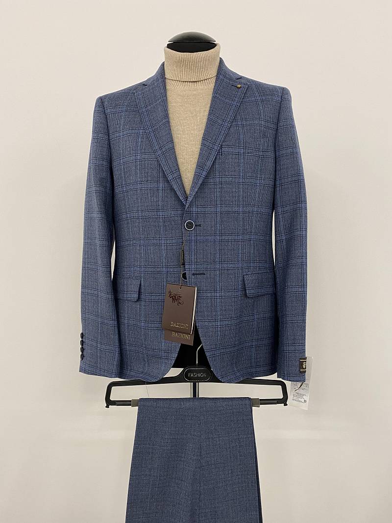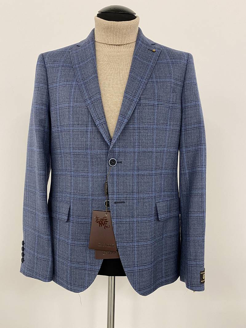 Slim fit (ПРИЛЕГАЮЩИЙ СИЛУЭТ), рекомендуется брать на размер больше. Пиджак однобортный на две пуговицы, с двумя боковыми карманами и нагрудной листочкой. Рукава втачные, двухшовные со шлицей и четырьмя декоративными пуговицами. По спинке расположены две шлицы. Пиджак на подкладке, с двумя внутренними карманами.