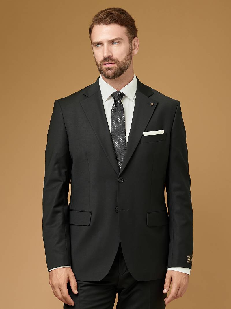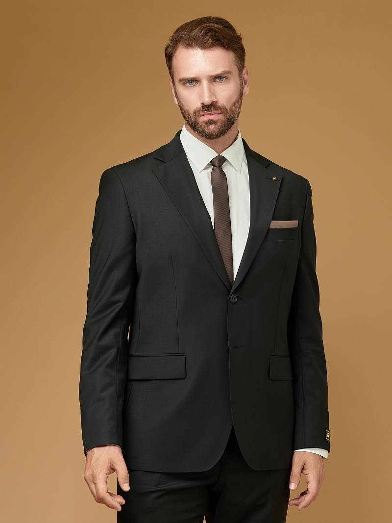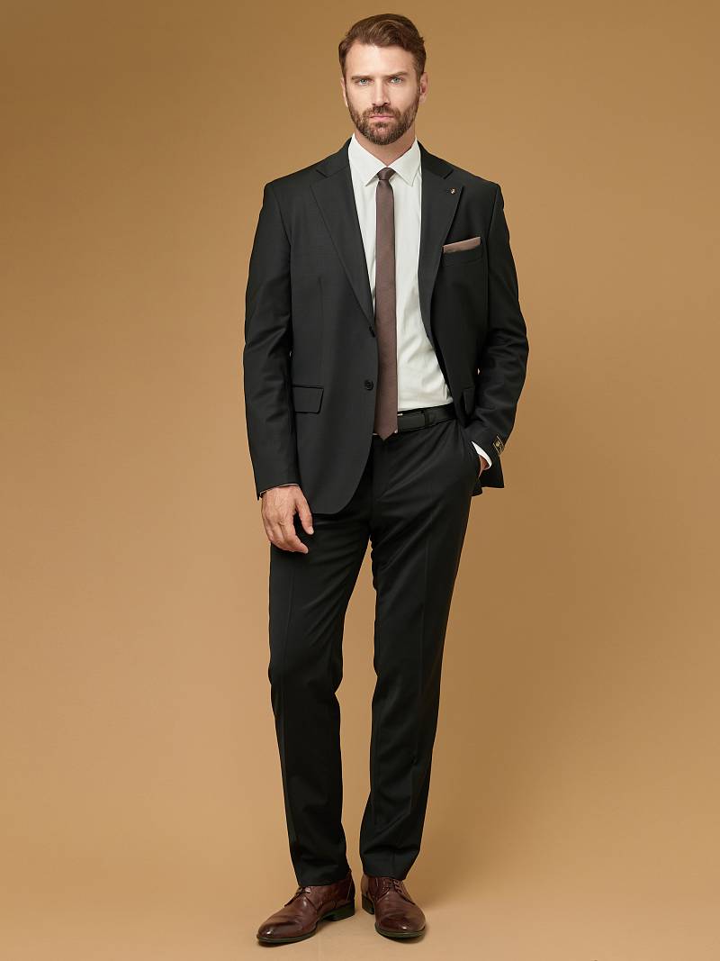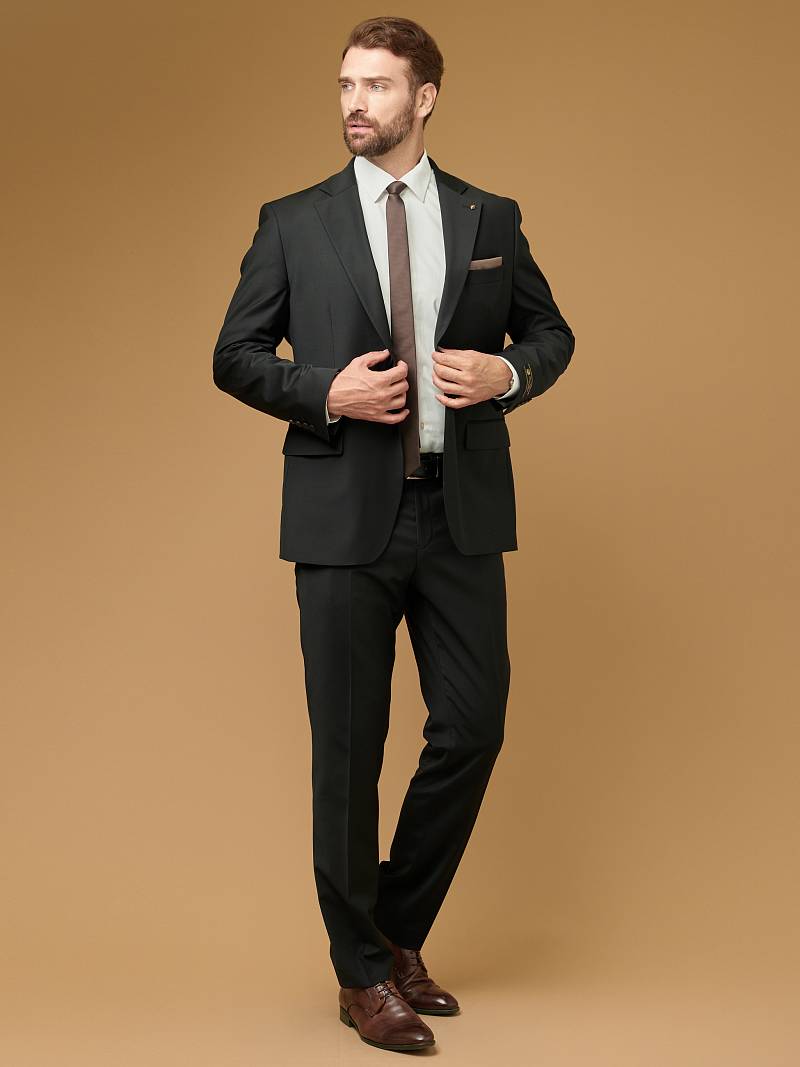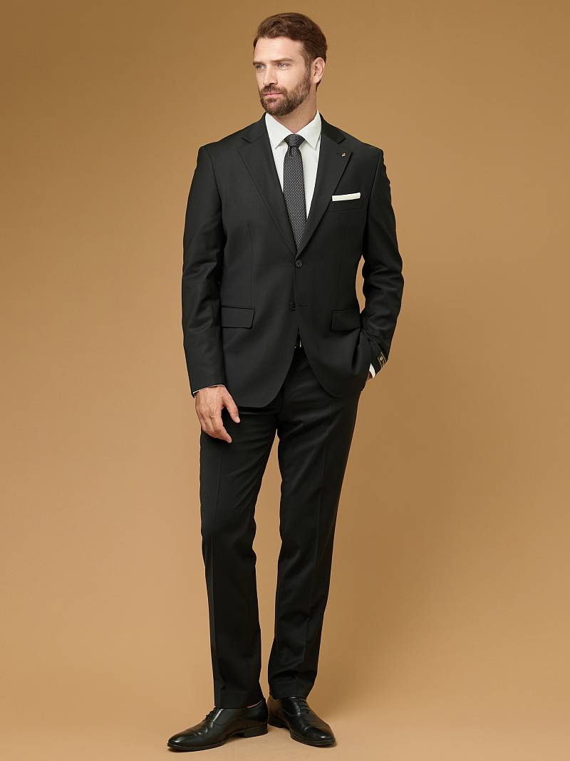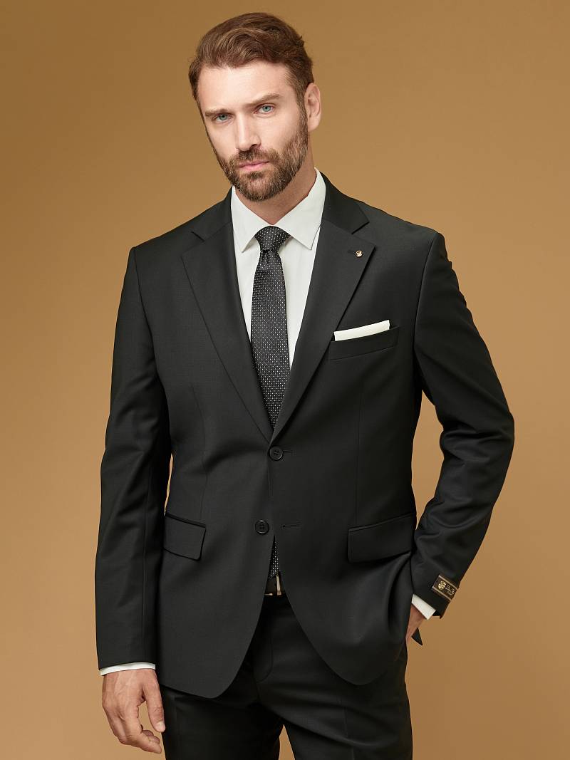 Classic fit (ПОЛУПРИЛЕГАЮЩИЙ СИЛУЭТ). Классический костюм двойка марки BAZIONI– это идеальное сочетание стиля и комфорта для мужчин. Для пошива лаконичного черного, однотонного костюма использовали премиальную шерсть с содержанием прочных волокон лайкры, которые не сковывают движение и обеспечивает дополнительный комфорт и удобство. Пиджак с классической шириной лацкана и мягкой линией плеч отлично сядет по фигуре, а расположенные по спинке две шлицы обеспечат дополнительный комфорт и свободу движения. Для придания образу торжественности подкладку нагрудного кармана можно использовать как платок-паше. Лацканы украсили небольшим значком в виде эмблемы бренда. Обработан пиджак шелковой подкладкой с двумя внутренними карманами. Брюки прямого кроя со стрелками и заниженной посадкой, с боковыми наклонными карманами и двумя задними карманами "в рамку". Верхний срез брюк обработан поясом с корсажной лентой и шлевками под ремень. Дизайнеры марки BAZIONI тщательно подходят к выбору материалов. Пуговицы подбираются и красятся индивидуально под каждую ткань, а прикладные материалы используют только от передовых производителей. Костюм мужской, классический, нарядный, повседневный, молодежный, для работы в офисе, модный, для мужа, сына, брата, на праздник.