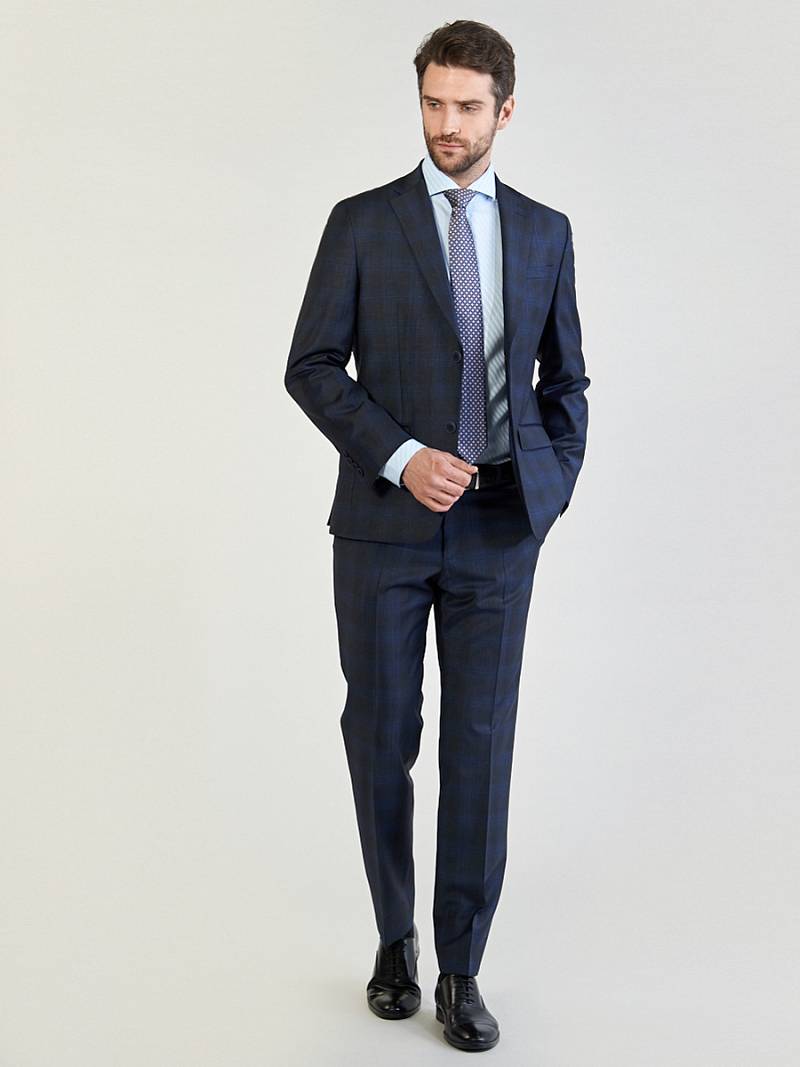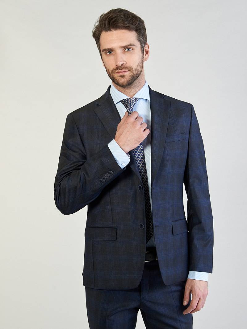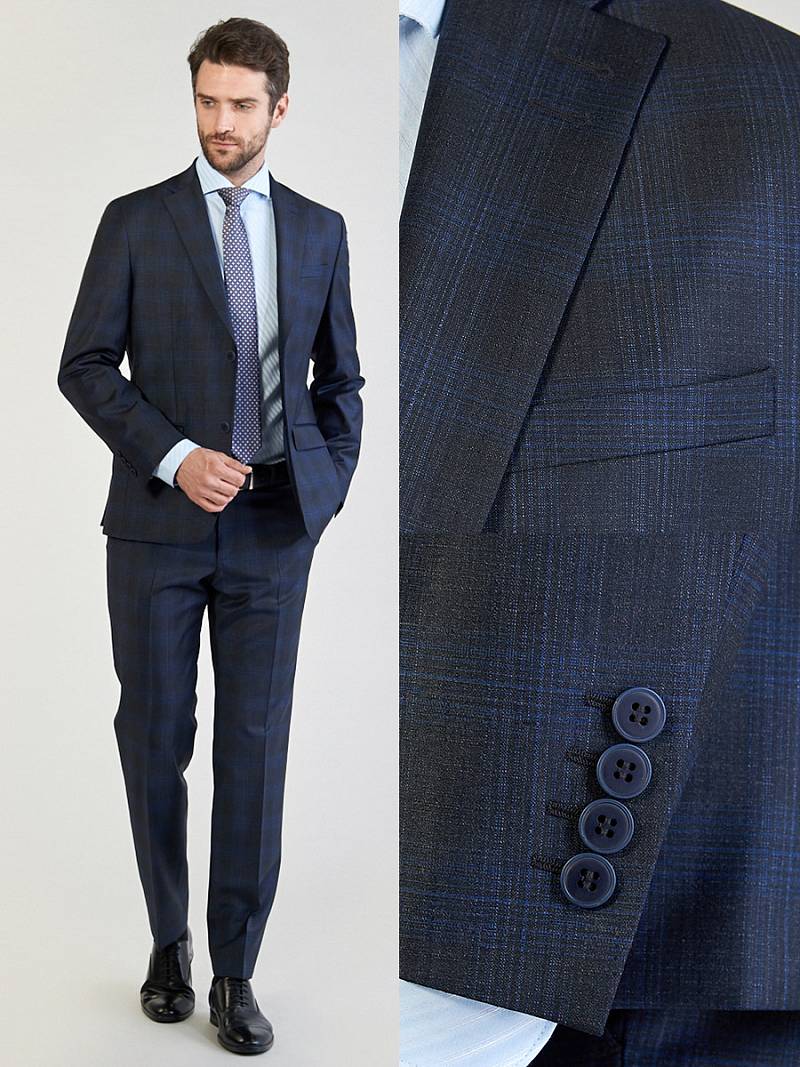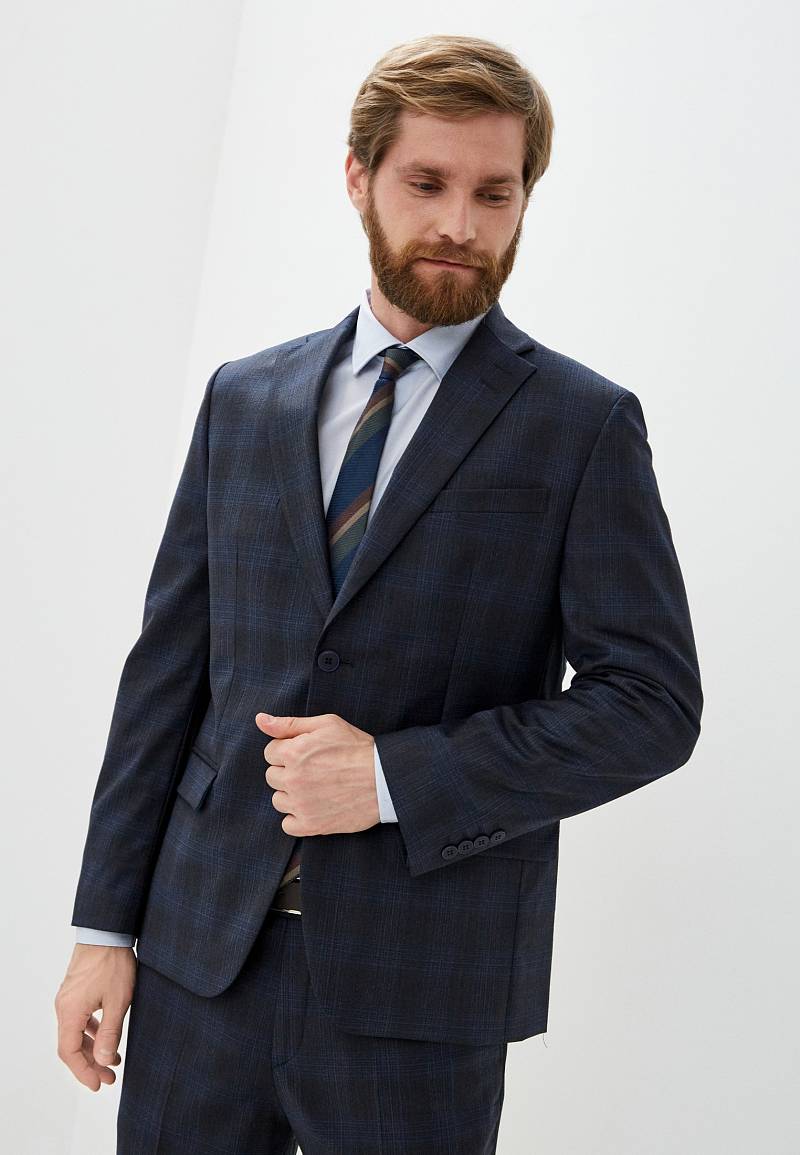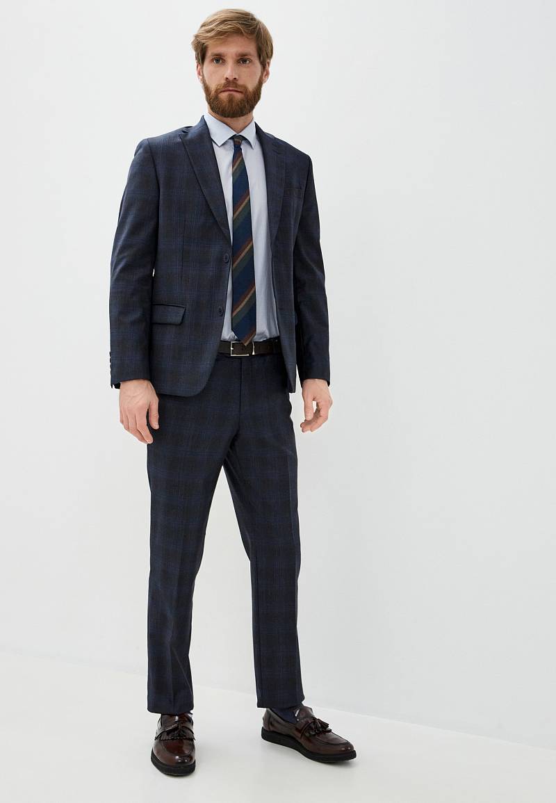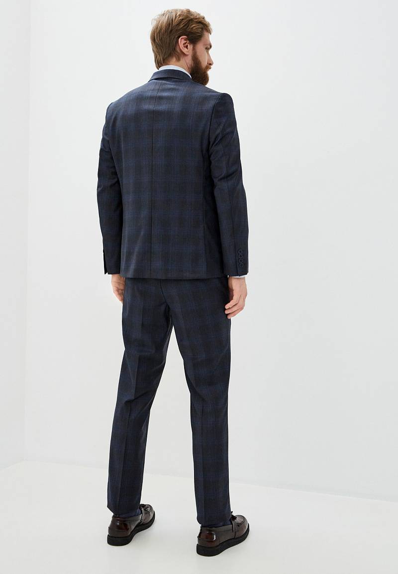 Классический костюм двойка Classic fit. Пиджак на две пуговицы, с боковыми и нагрудным карманами, по спинке две шлицы. Брюки без защипов с боковыми и одним задним карманом.