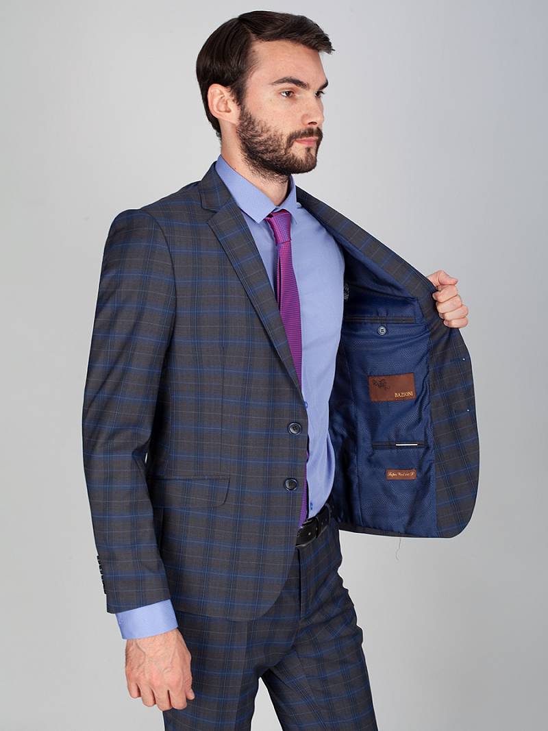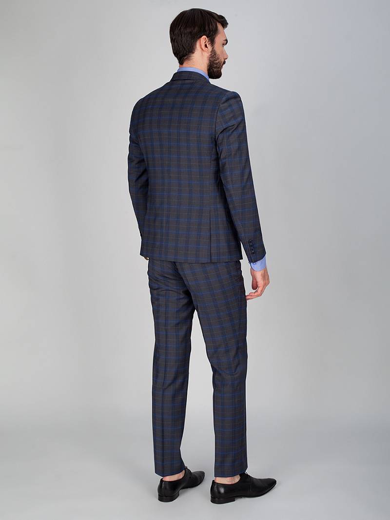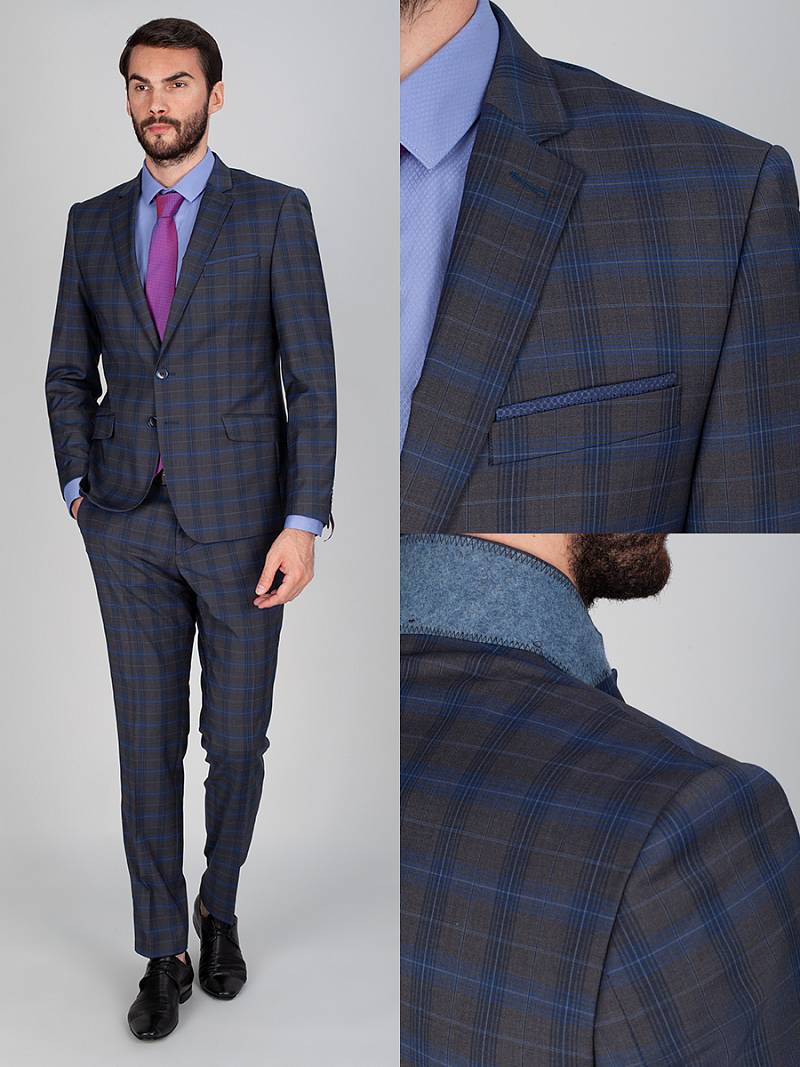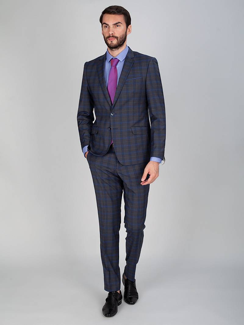 Классический костюм двойка Slim fit. Пиджак на две пуговицы, с боковыми и нагрудным карманами, по спинке две шлицы, в нагрудном кармане декоративный платок. Брюки без защипов с боковыми и одним задним карманом.
