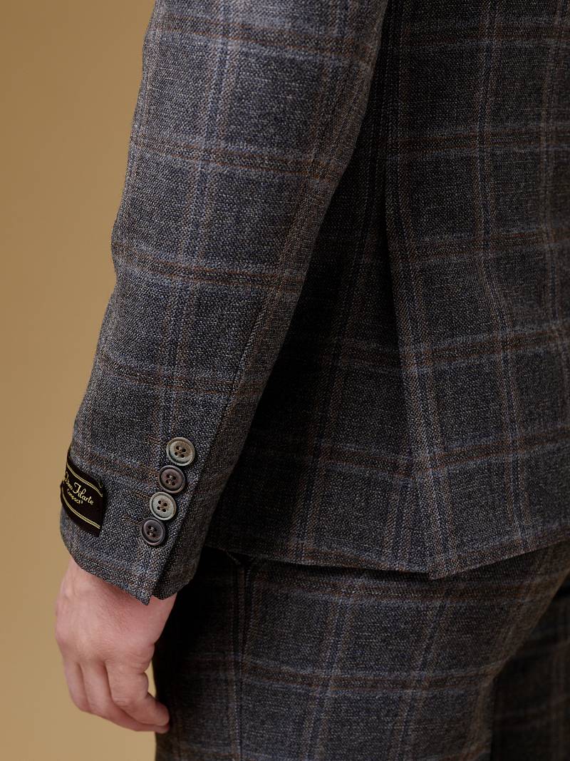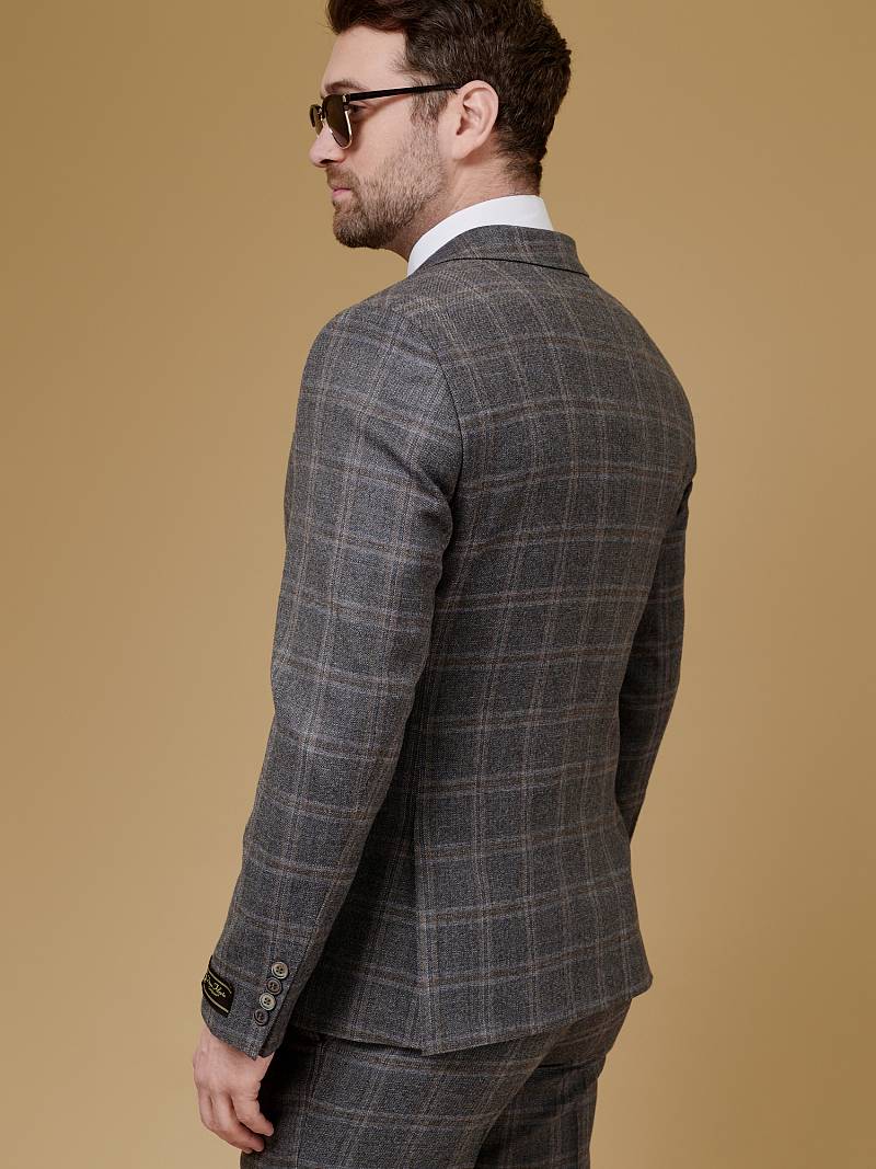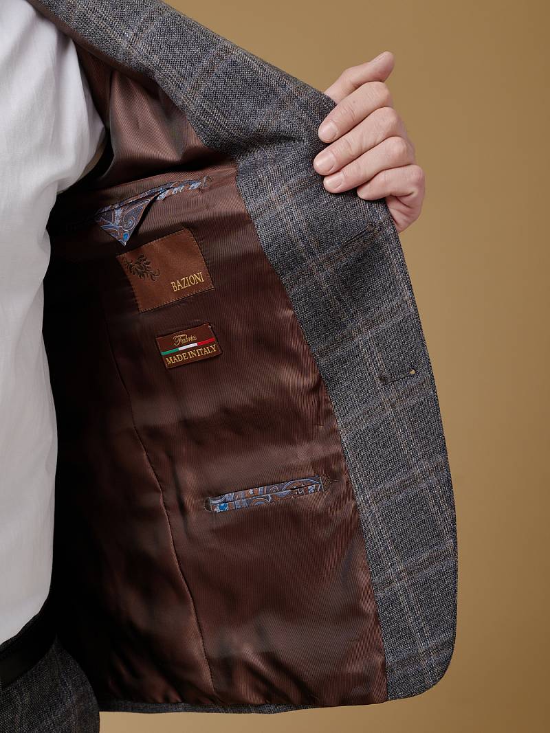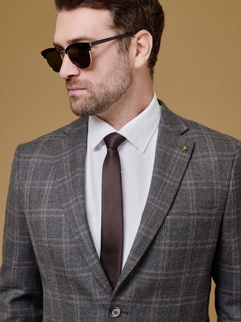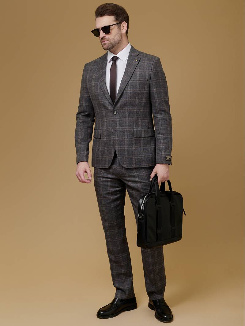 Классический костюм двойка Slim fit (ПРИЛЕГАЮЩИЙ СИЛУЭТ), рекомендуется брать на размер больше.Пиджак однобортный на две пуговицы, с двумя боковыми карманами с клапанами и нагрудной листочкой. Рукава втачные, двухшовные со шлицей и четырьмя декоративными пуговицами. По спинке расположены две шлицы. Пиджак на подкладке, с двумя внутренними карманами. Брюки без защипов, с боковыми наклонными карманами и двумя задними карманами «в рамку». Передние половинки на подкладке. Верхний срез брюк обработан поясом с корсажной лентой и шлевками под ремень. Застежка обработана на тесьму-молнию, с петлей-пуговицей на поясе и усилен металлическим крючком.