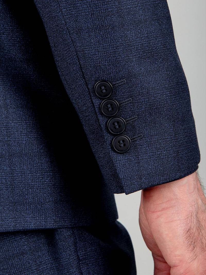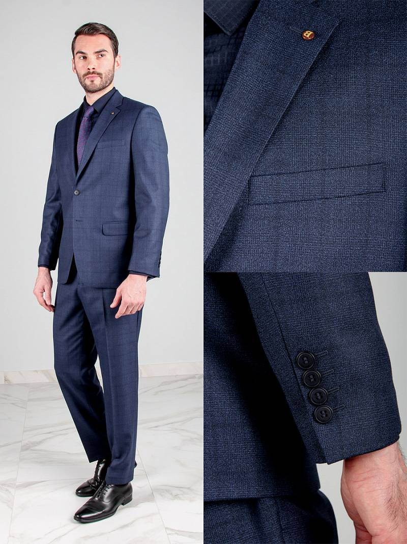 Классический костюм двойка Classic fit. Пиджак на две пуговицы, с боковыми и нагрудным карманами, по спинке две шлицы. Брюки без защипов с боковыми и одним задним карманом.
