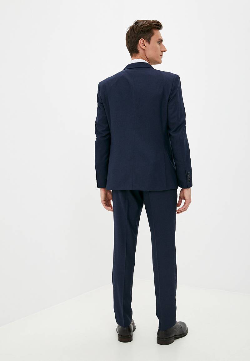 Классический костюм двойка Slim fit. Пиджак на две пуговицы, с боковыми и нагрудным карманами, по спинке две шлицы. Брюки без защипов с боковыми и двумя задними карманами.