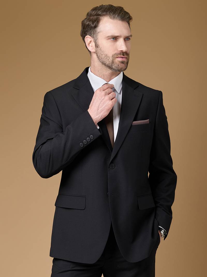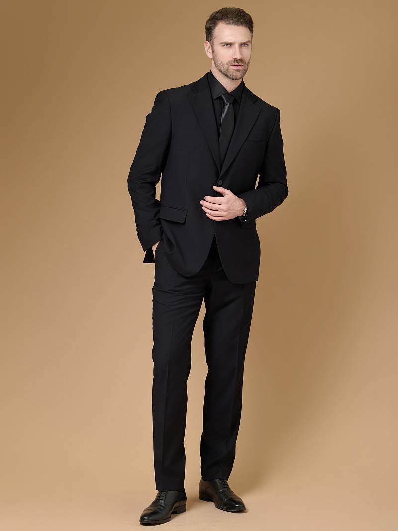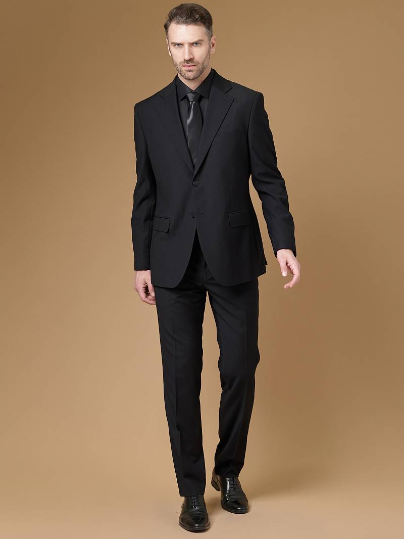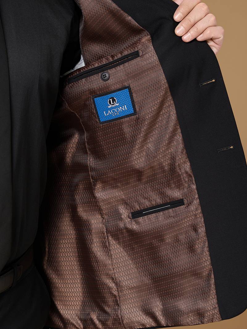 Classic fit (ПОЛУПРИЛЕГАЮЩИЙ СИЛУЭТ).Черный костюм двойка марки LACONI– это идеальный баланс между внешним видом и комфортом. Для пошива лаконичного, однотонного классического костюма использовали ткань с содержанием лайкры, которые придают ей эластичность и обеспечивают дополнительный комфорт и удобство. Слегка приталенный однобортный пиджак с широкими лацканами и с мягкой линией плеч дополнен сзади двумя шлицами, поэтому он садится по фигуре и подходит для повседневной носки. Пиджак обработан на подкладке с двумя внутренними карманами. Для придания образу торжественности подкладку нагрудного кармана можно использовать как платок. Брюки прямого кроя со стрелками и классической посадкой, с боковыми наклонными карманами и одним задними карманом "в рамку". Верхний срез брюк обработан поясом с корсажной лентой и шлевками под ремень. Дизайнеры марки LACONI тщательно подходят к выбору материалов. Пуговицы подбираются и красятся индивидуально под каждую ткань, а прикладные материалы используют только от передовых производителей. Костюм мужской, классический, нарядный, повседневный, молодежный, casual, для работы в офисе, модный, для мужа, сына, брата, на праздник.
