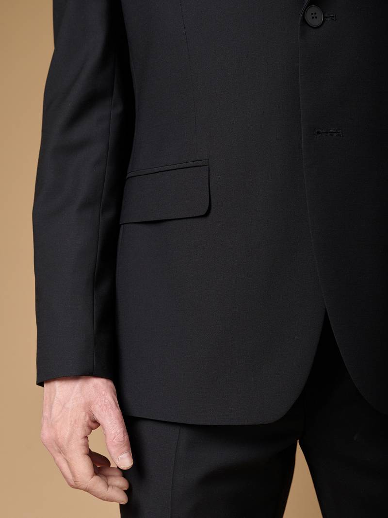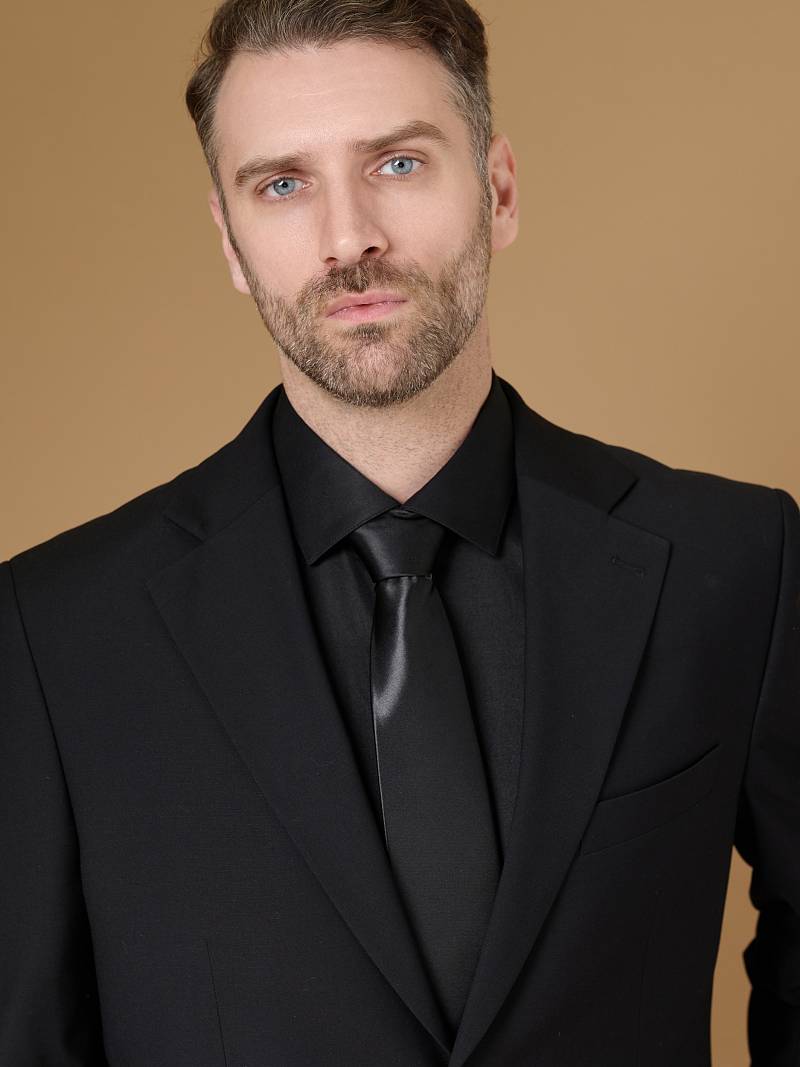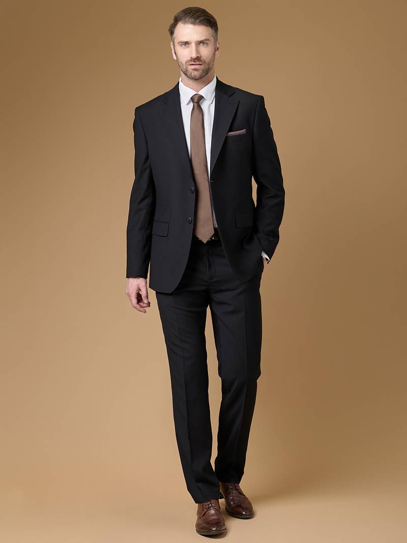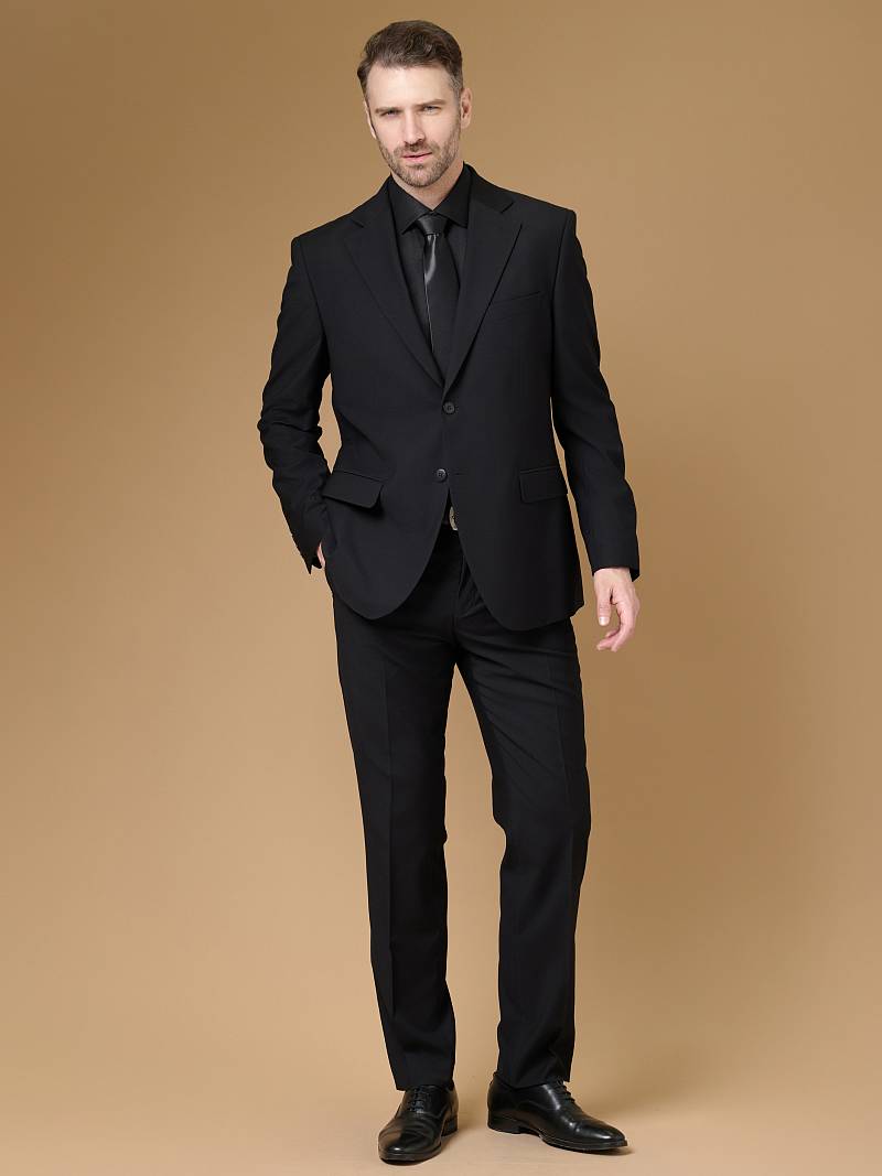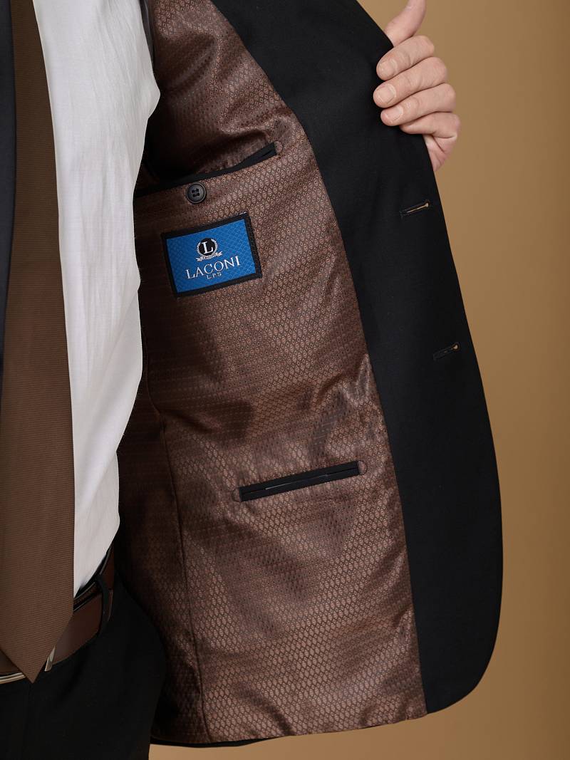 Classic fit (ПОЛУПРИЛЕГАЮЩИЙ СИЛУЭТ).Черный костюм двойка марки LACONI– это идеальный баланс между внешним видом и комфортом. Для пошива лаконичного, однотонного классического костюма использовали ткань с содержанием лайкры, которые придают ей эластичность и обеспечивают дополнительный комфорт и удобство. Слегка приталенный однобортный пиджак с широкими лацканами и с мягкой линией плеч дополнен сзади двумя шлицами, поэтому он садится по фигуре и подходит для повседневной носки. Пиджак обработан на подкладке с двумя внутренними карманами. Для придания образу торжественности подкладку нагрудного кармана можно использовать как платок. Брюки прямого кроя со стрелками и классической посадкой, с боковыми наклонными карманами и одним задними карманом "в рамку". Верхний срез брюк обработан поясом с корсажной лентой и шлевками под ремень. Дизайнеры марки LACONI тщательно подходят к выбору материалов. Пуговицы подбираются и красятся индивидуально под каждую ткань, а прикладные материалы используют только от передовых производителей. Костюм мужской, классический, нарядный, повседневный, молодежный, casual, для работы в офисе, модный, для мужа, сына, брата, на праздник.