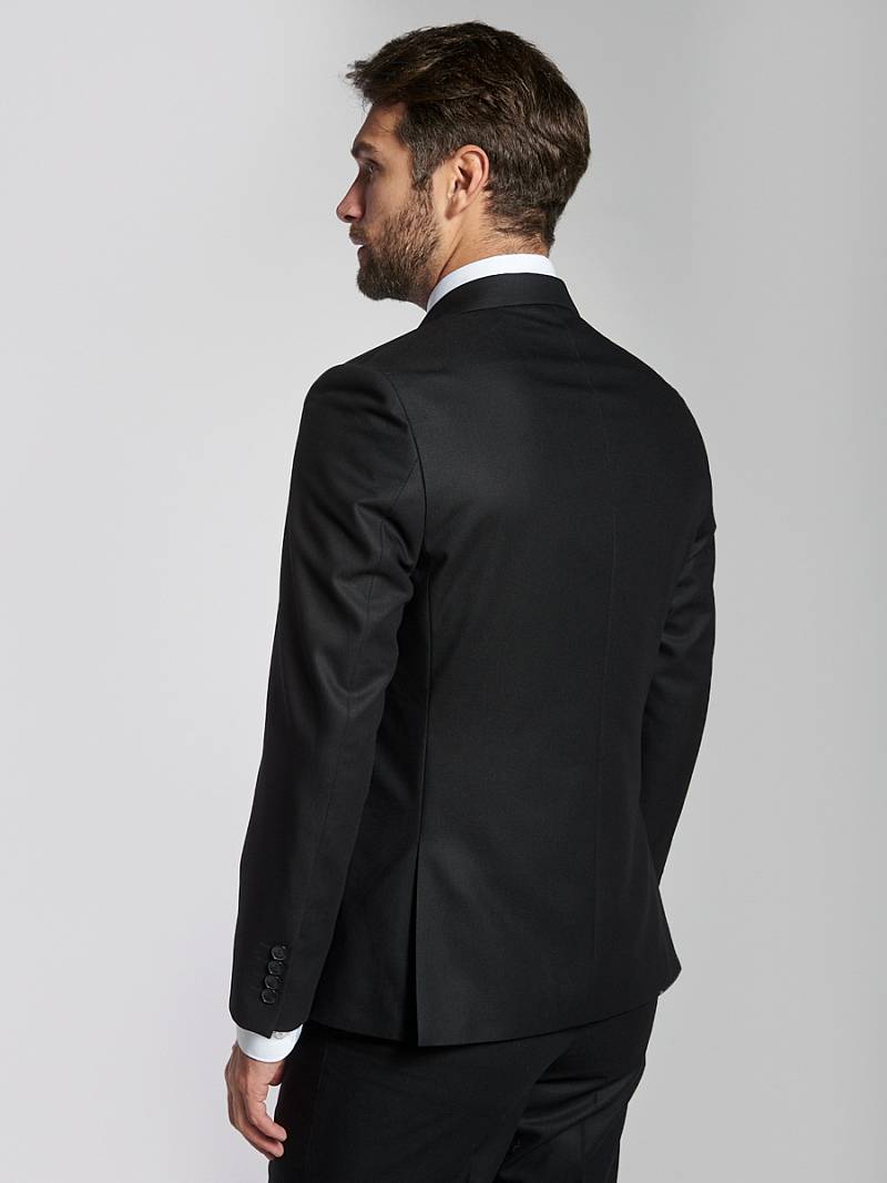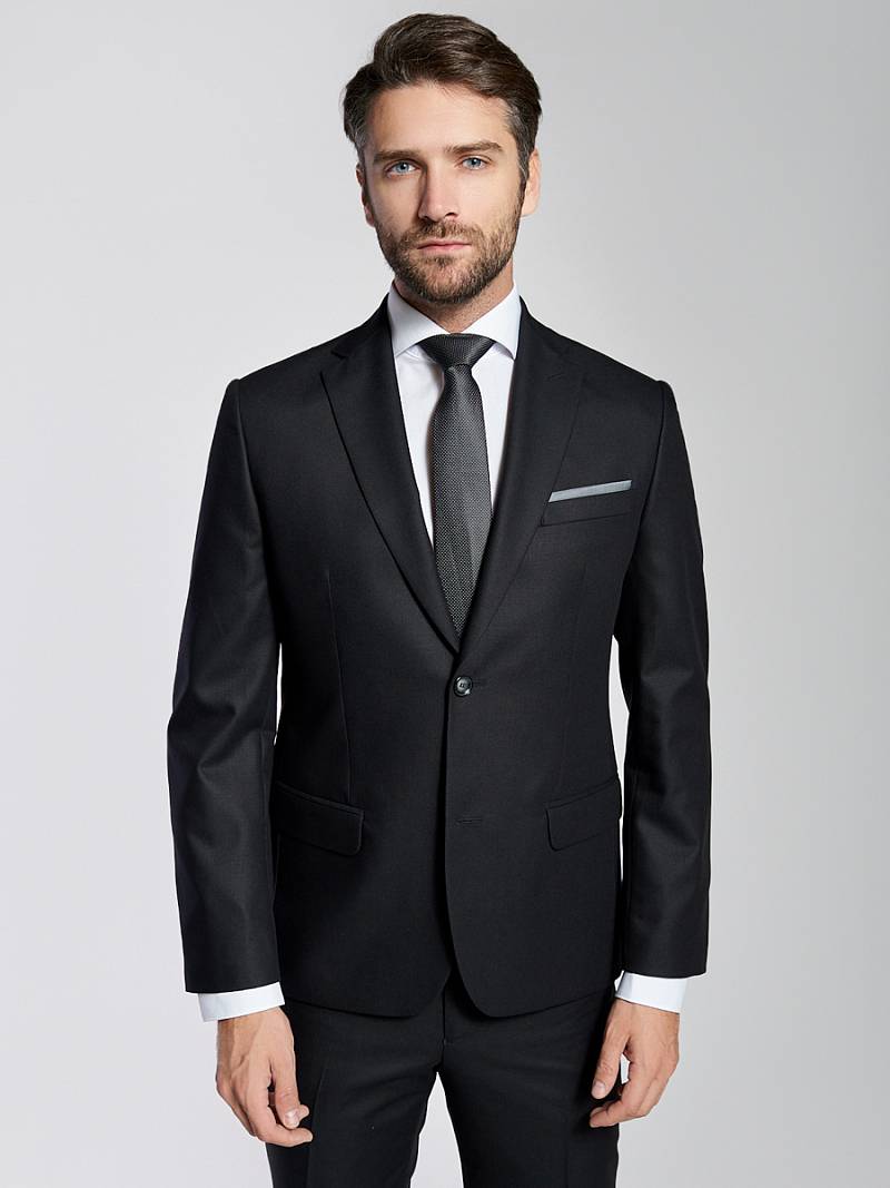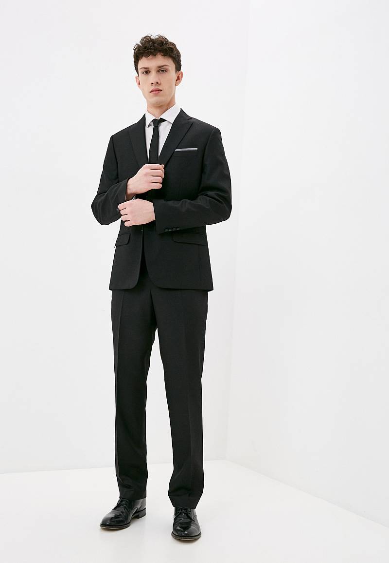 Костюм двойка Slim fit. Пиджак на две пуговицы, с боковыми и нагрудным карманами, по спинке две шлицы, в нагрудном кармане расположен декоративный платок. Брюки без защипов с боковыми и одним задним карманом.