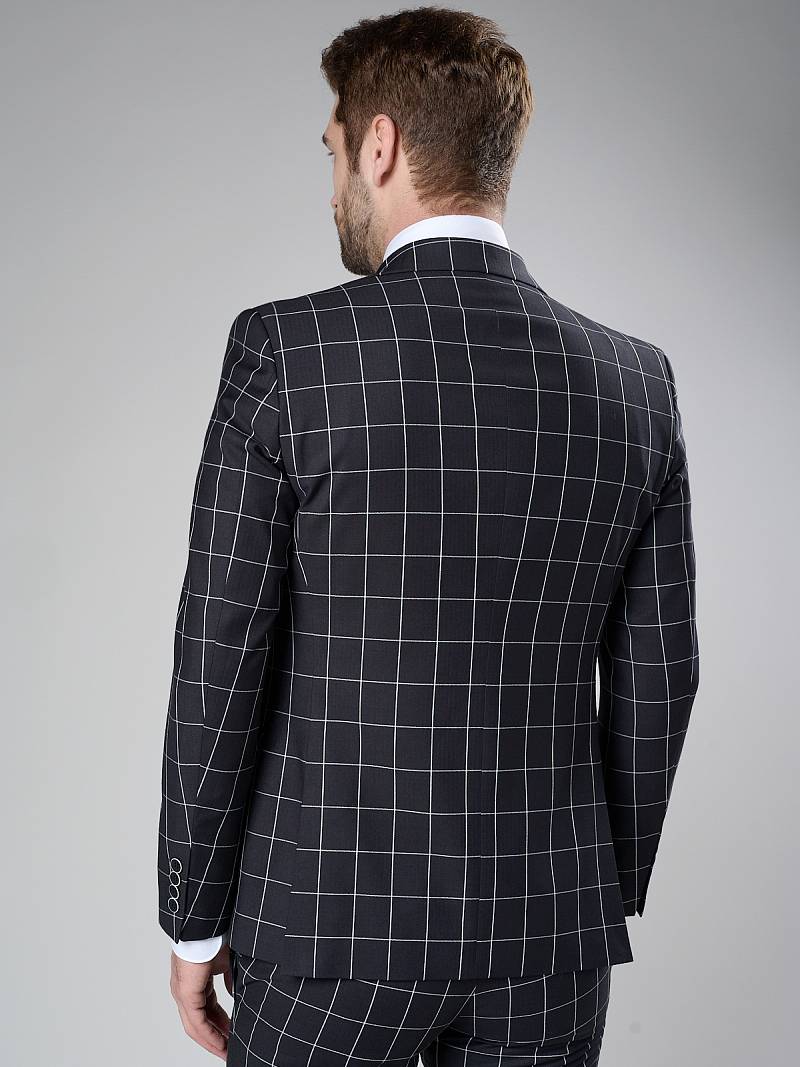 Slim fit, две пуговицы, две шлицы. Контрастные петли, декоративная пуговица на лацкане, нагрудный платок.