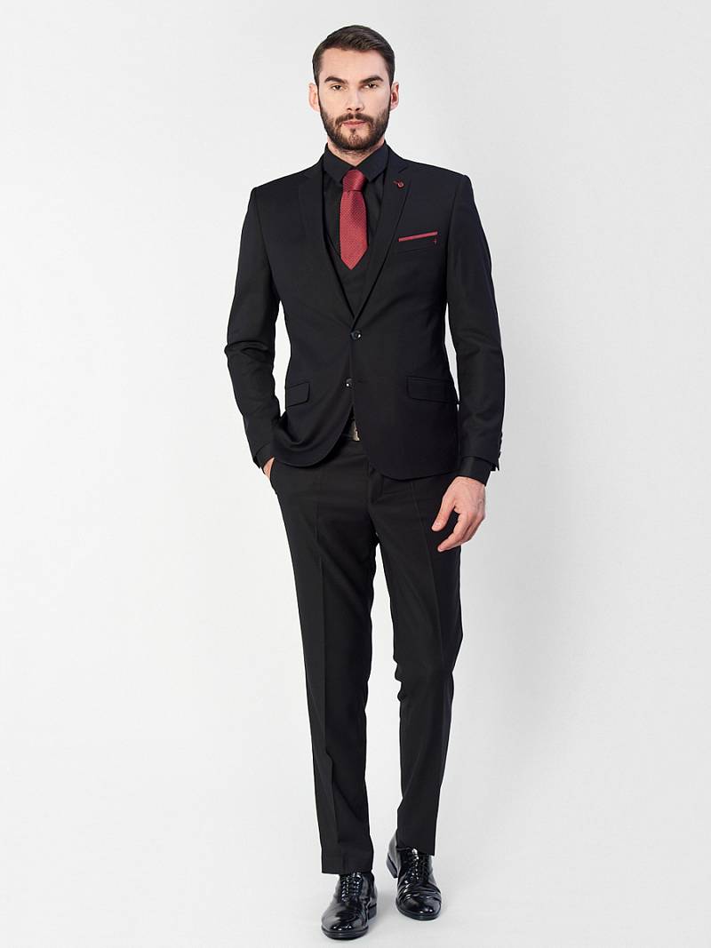 Slim fit, костюм-тройка, две пуговицы, две шлицы. Контрастные петли, декоративная пуговица на лацкане,  нагрудный платок,