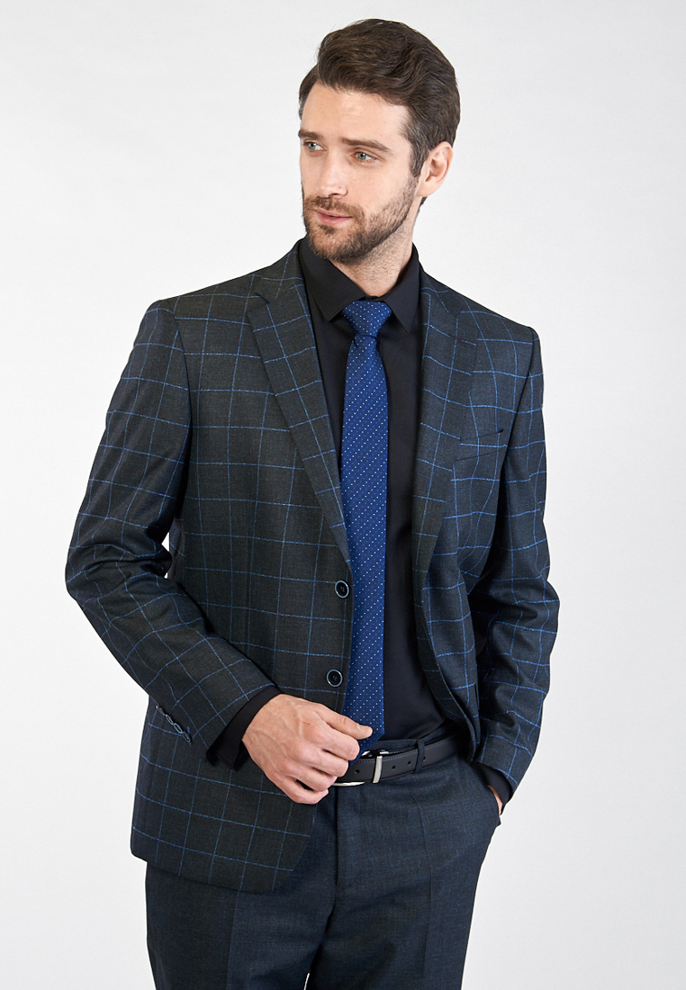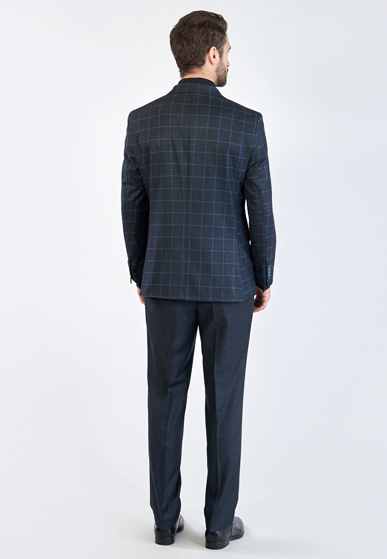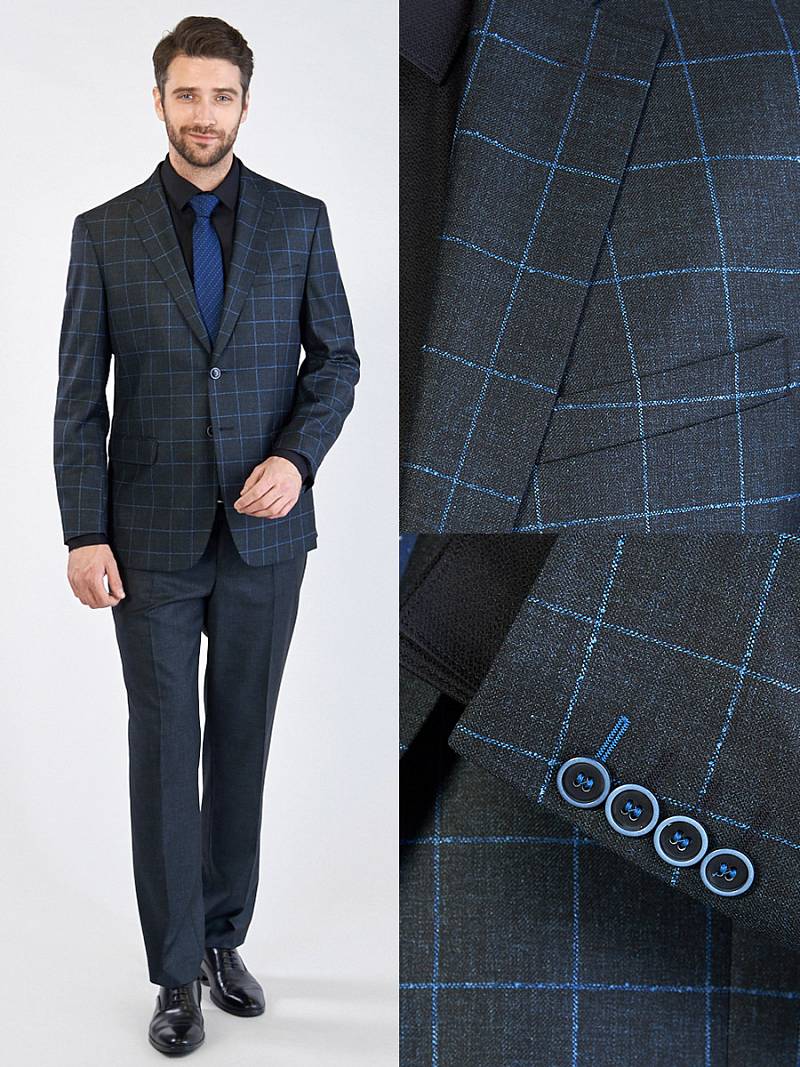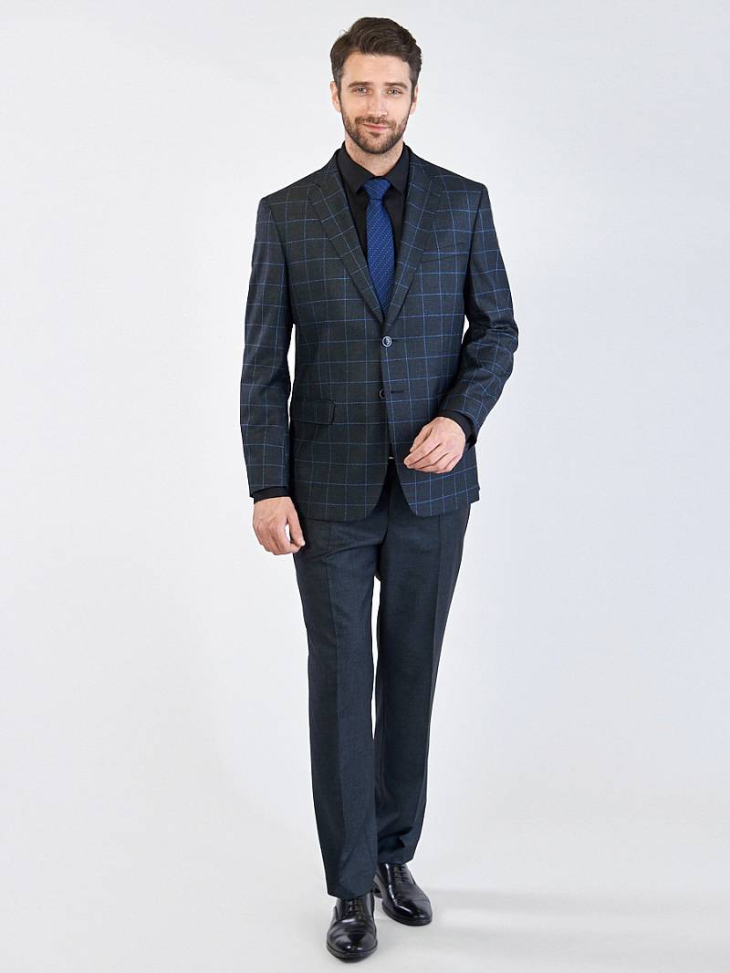 Классический костюм двойка Classic fit. Пиджак на две пуговицы, с боковыми и нагрудным карманами, по спинке две шлицы. Брюки без защипов с боковыми и двумя задними карманами.
