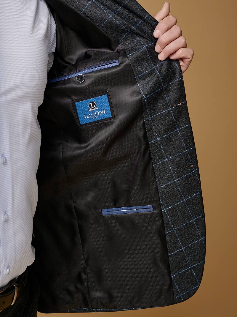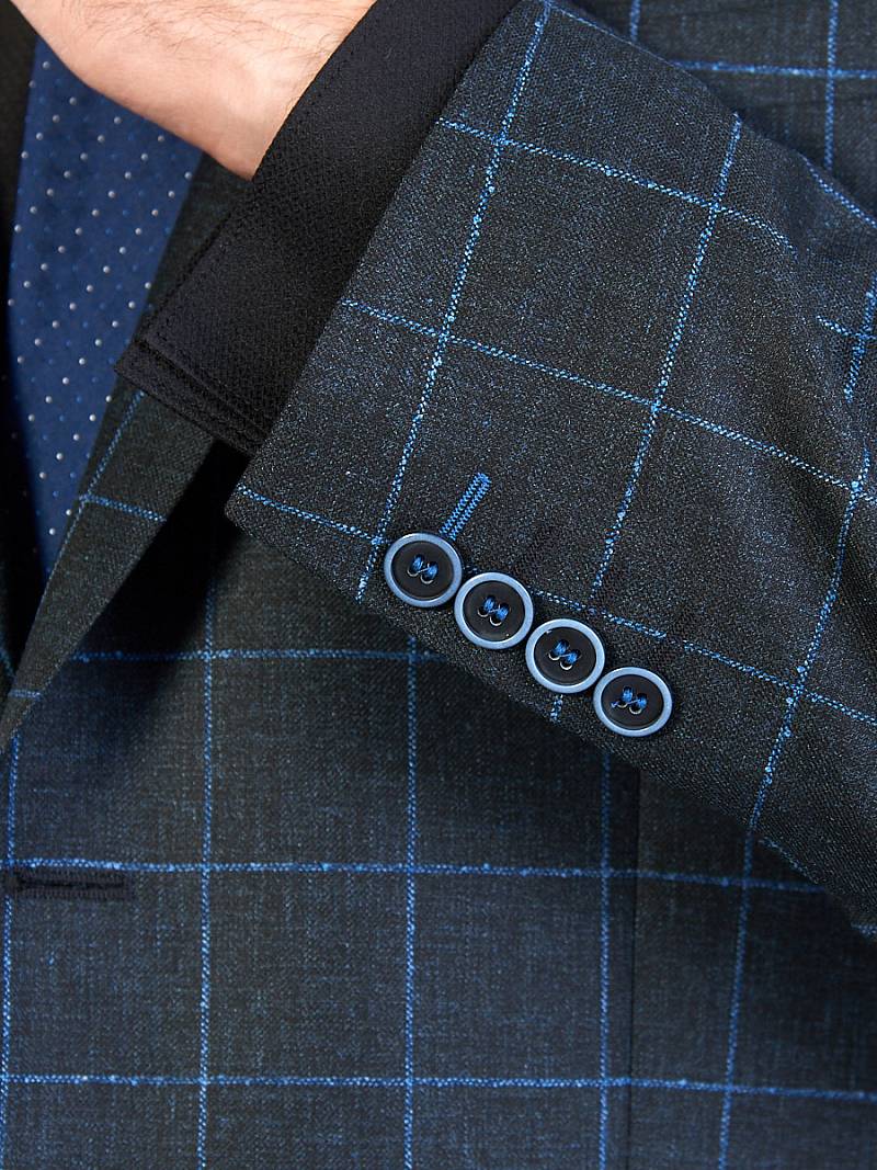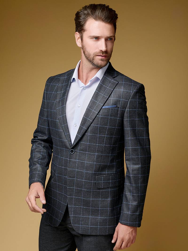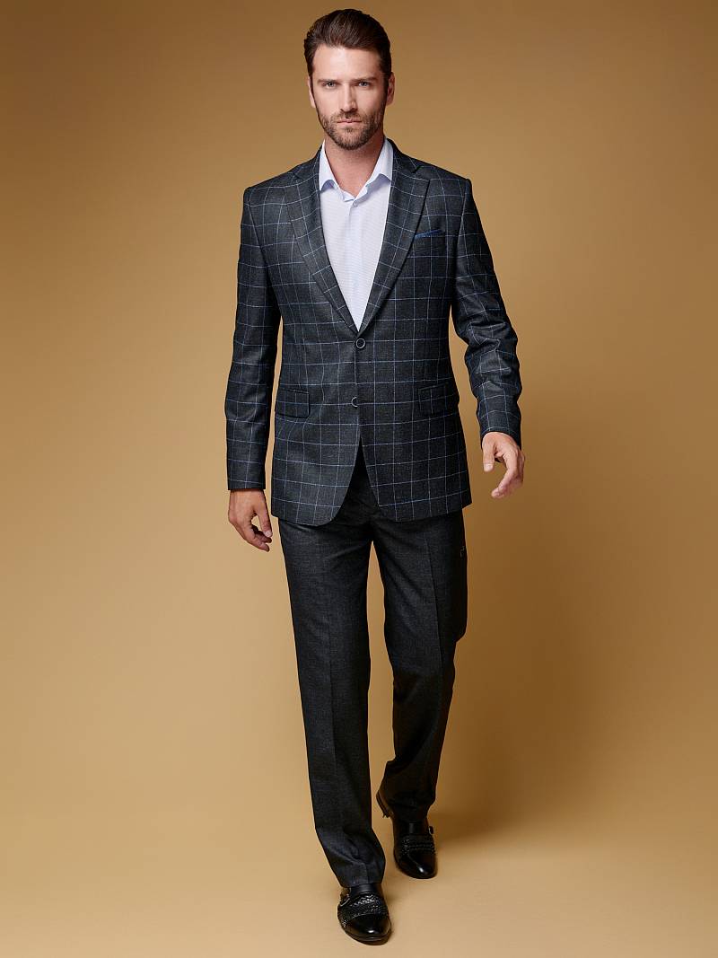 Классический костюм двойка Classic fit. Пиджак на две пуговицы, с боковыми и нагрудным карманами, по спинке две шлицы. Брюки без защипов с боковыми и двумя задними карманами.