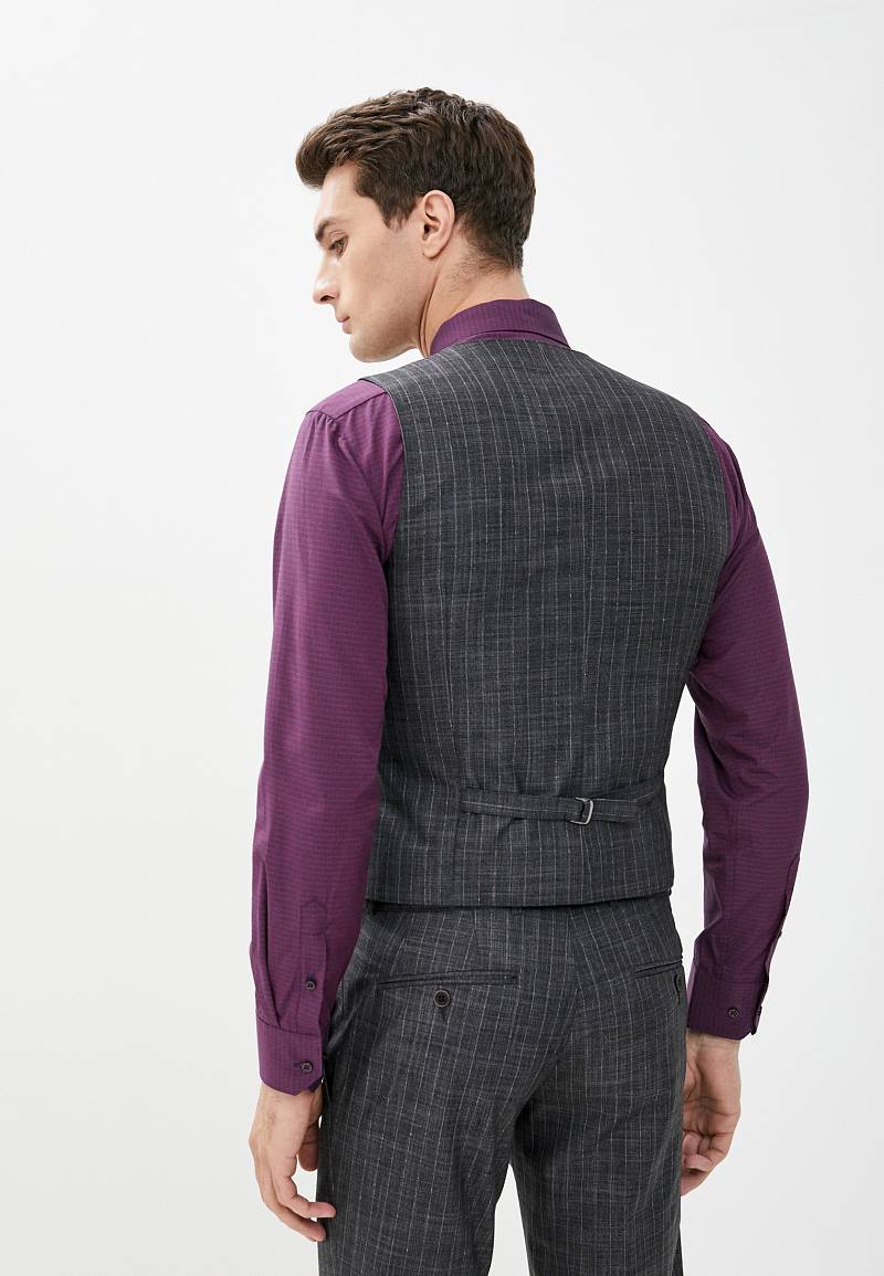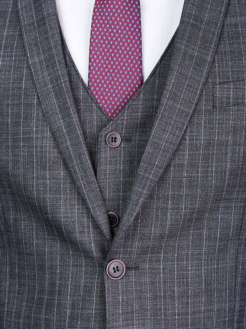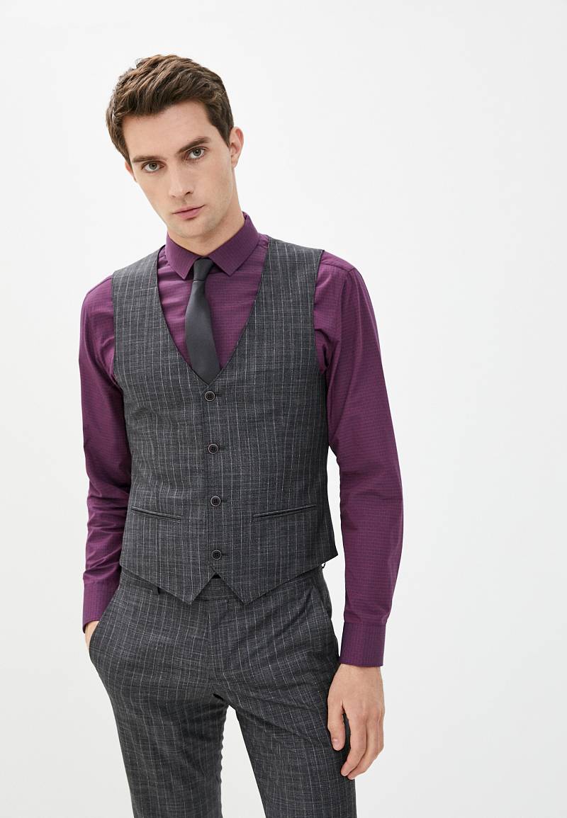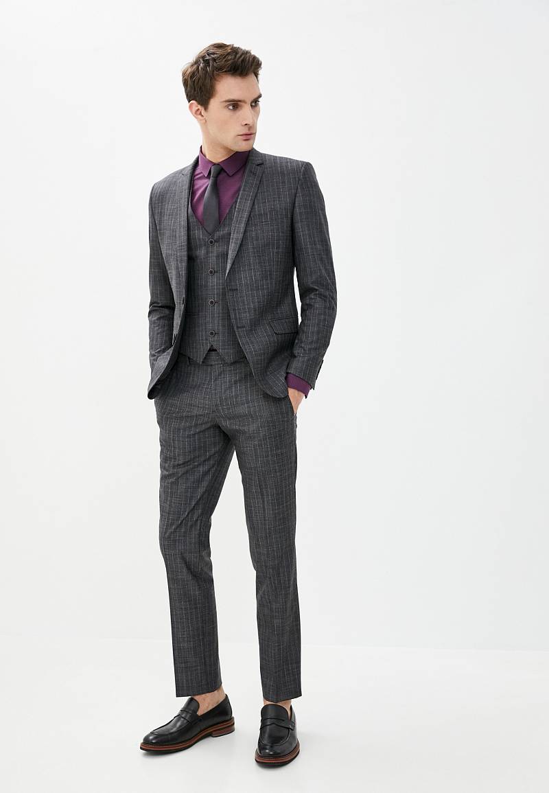 Классический костюм-тройка Slim fit. Пиджак на две пуговицы, с боковыми и нагрудным карманами, по спинке две шлицы. Брюки без защипов с боковыми и двумя задними карманами.