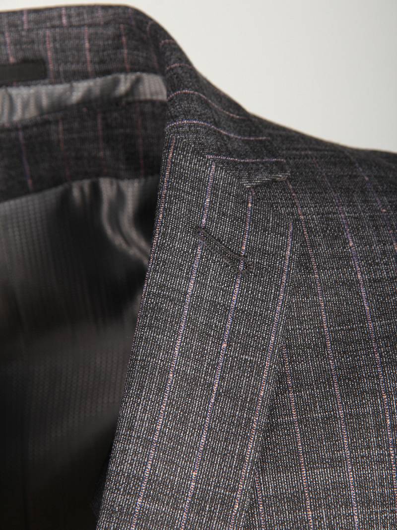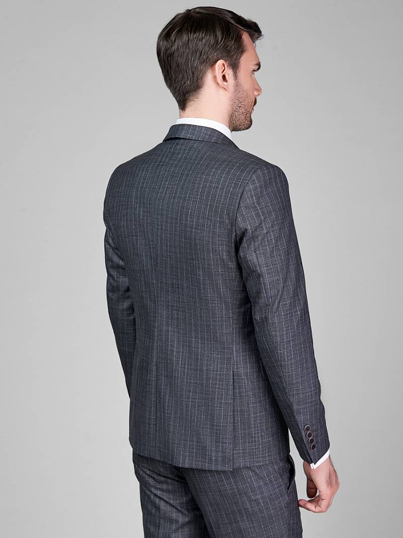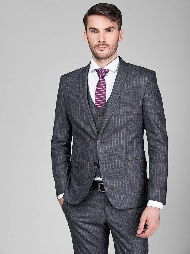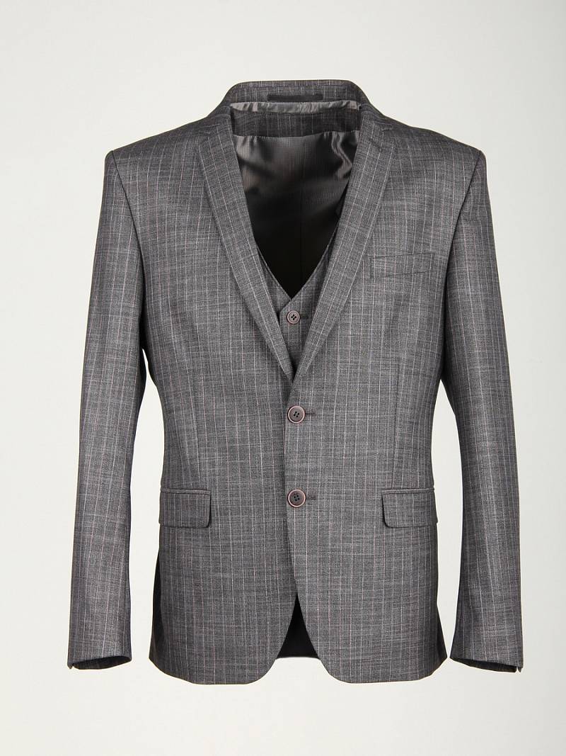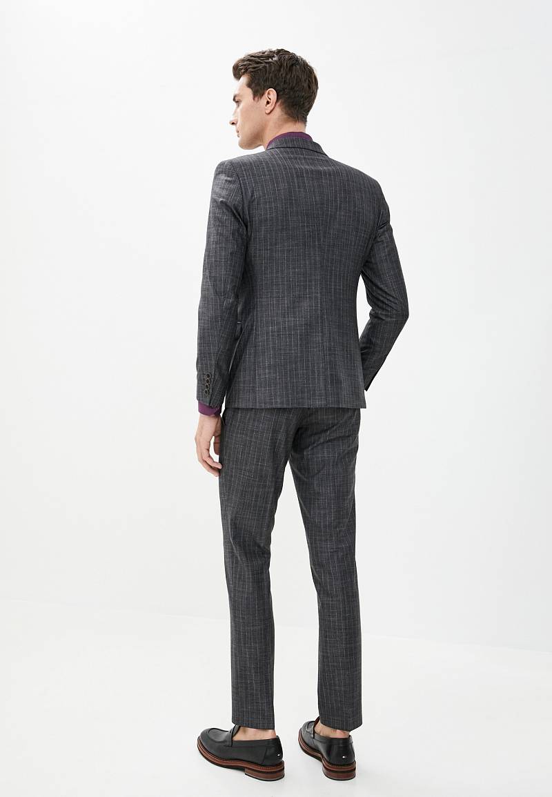 Классический костюм-тройка Slim fit. Пиджак на две пуговицы, с боковыми и нагрудным карманами, по спинке две шлицы. Брюки без защипов с боковыми и двумя задними карманами.