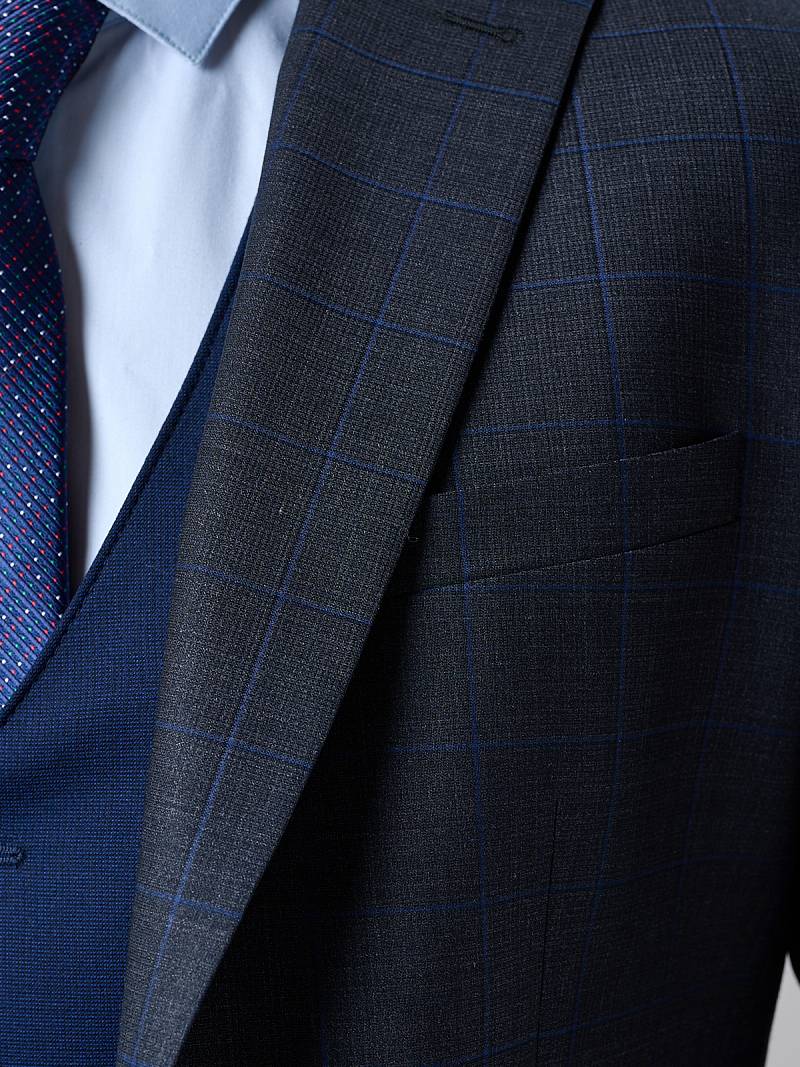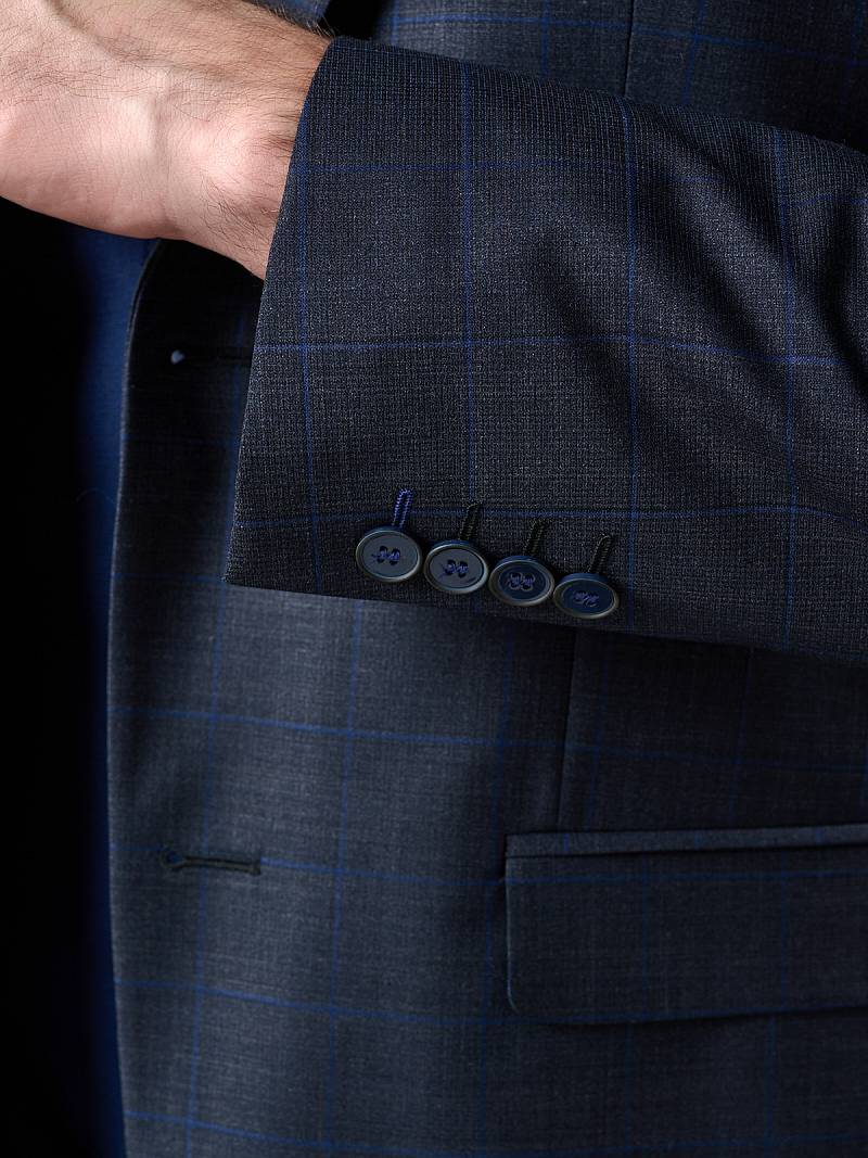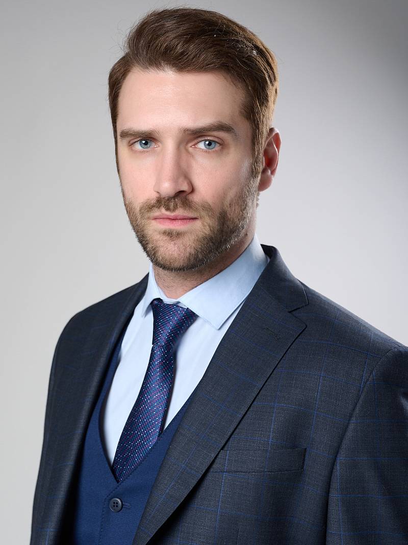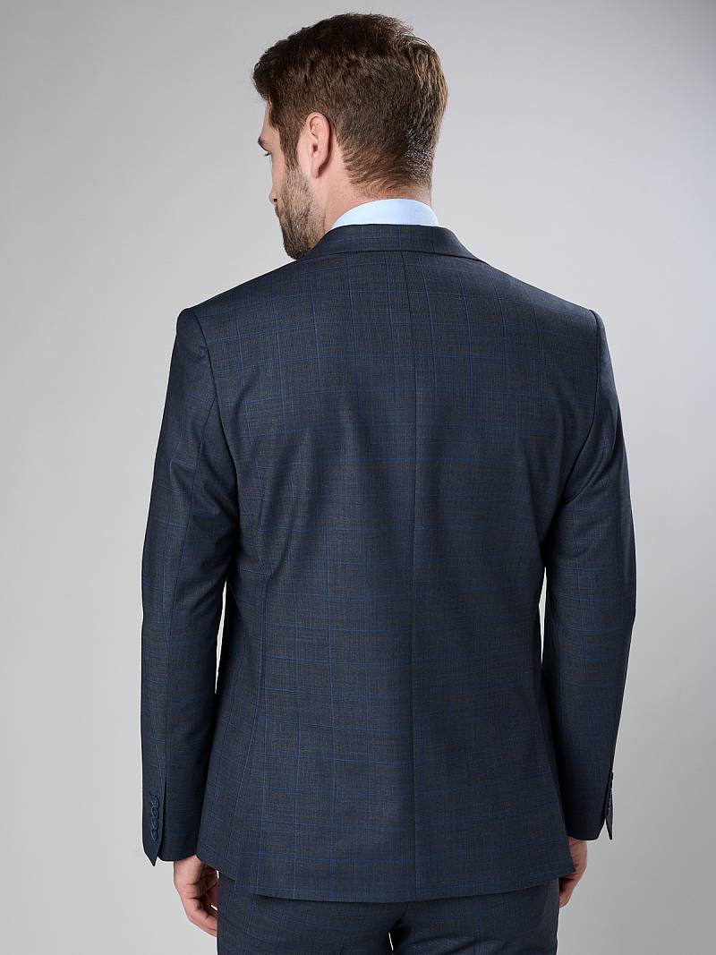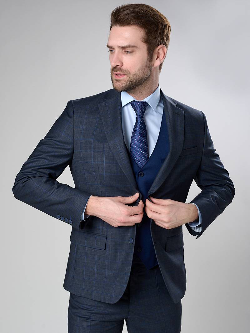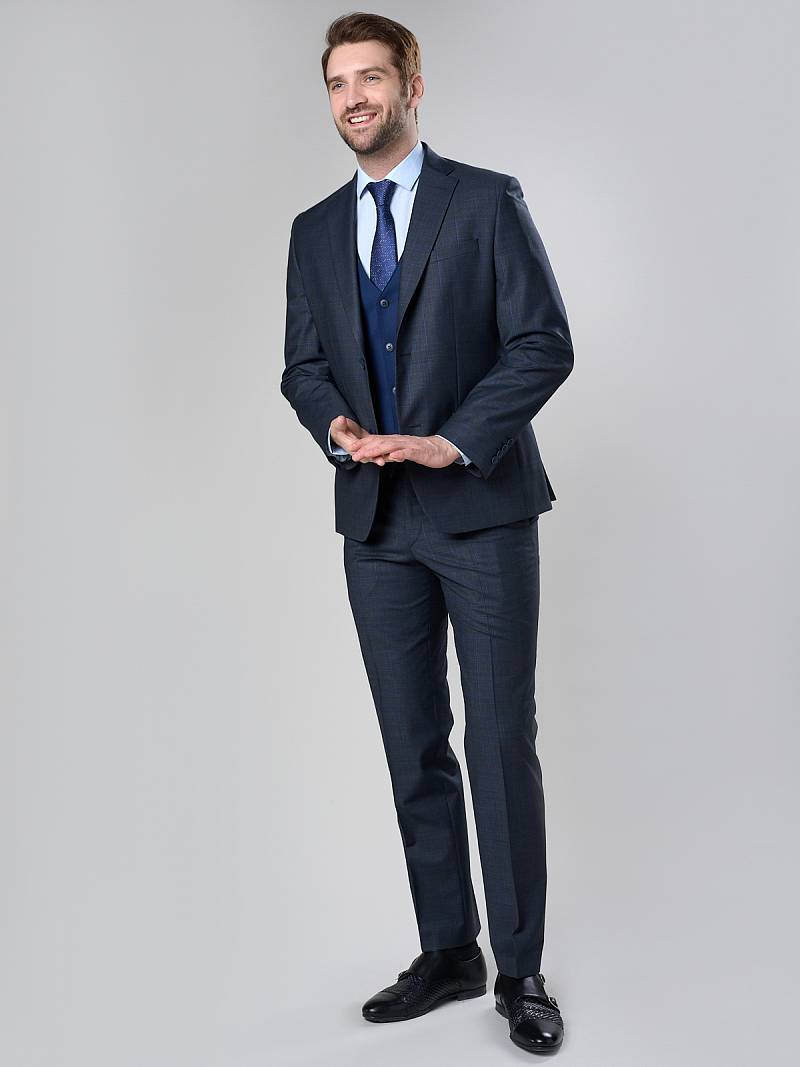 Классический костюм двойка Classic fit. Пиджак на две пуговицы, с боковыми и нагрудным карманами, по спинке две шлицы. Брюки без защипов с боковыми и одним задним карманом.