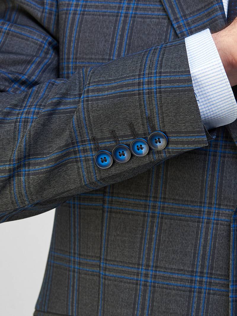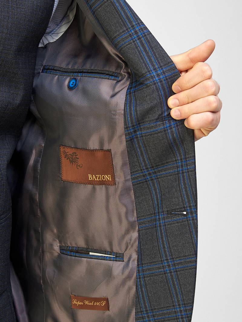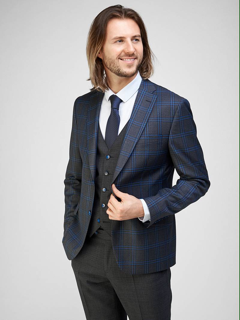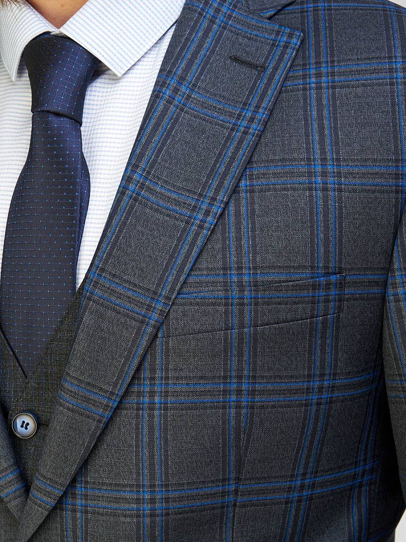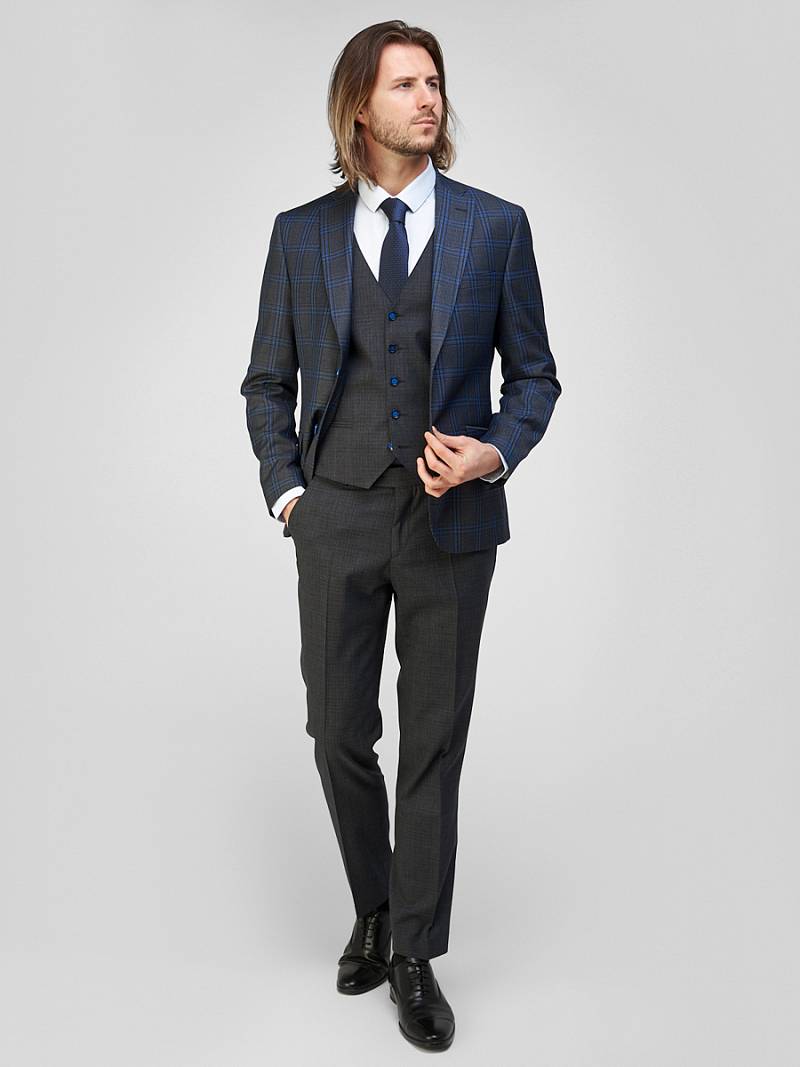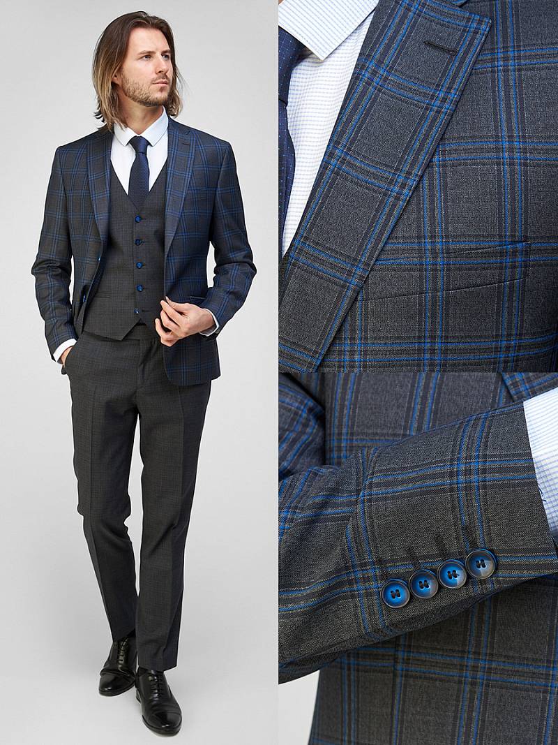Классический костюм-тройка Slim fit. Пиджак на две пуговицы, с боковыми и нагрудным карманами, по спинке две шлицы. Брюки без защипов с боковыми и одним задним карманом.