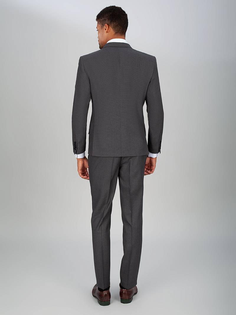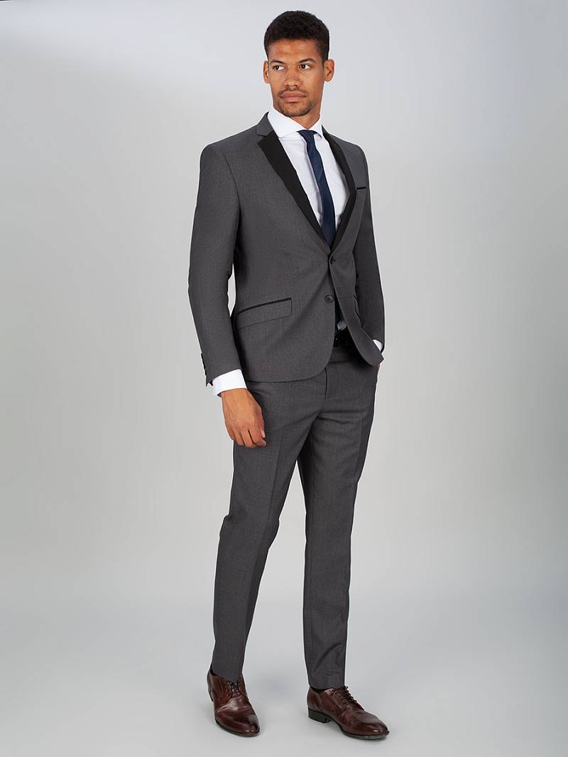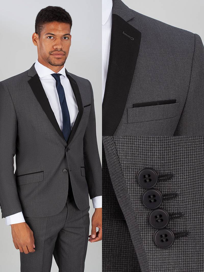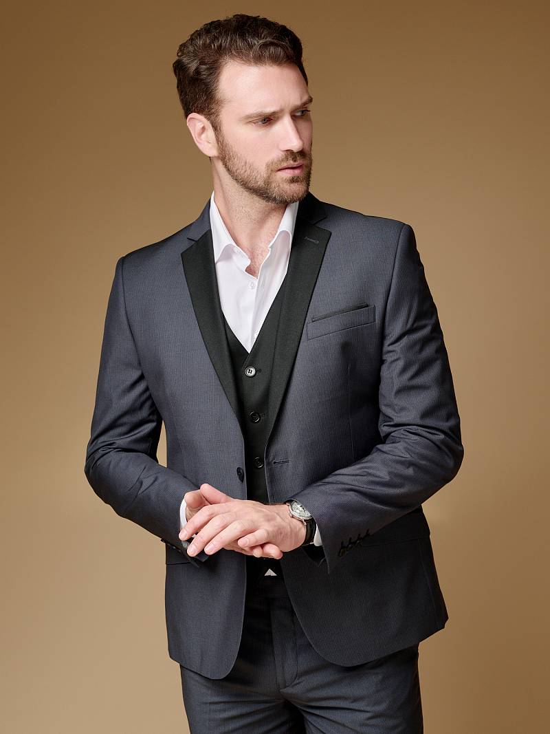 Классический костюм двойка Slim fit. Пиджак на две пуговицы, с боковыми и нагрудным карманами, по спинке две шлицы. Брюки без защипов с боковыми и одним задним карманом. Лацканы пиджака, рамки боковых карманов выполнены из отделочной ткани.