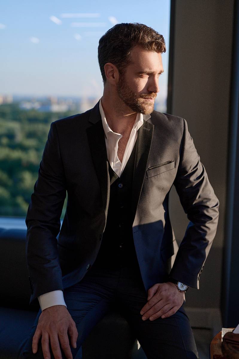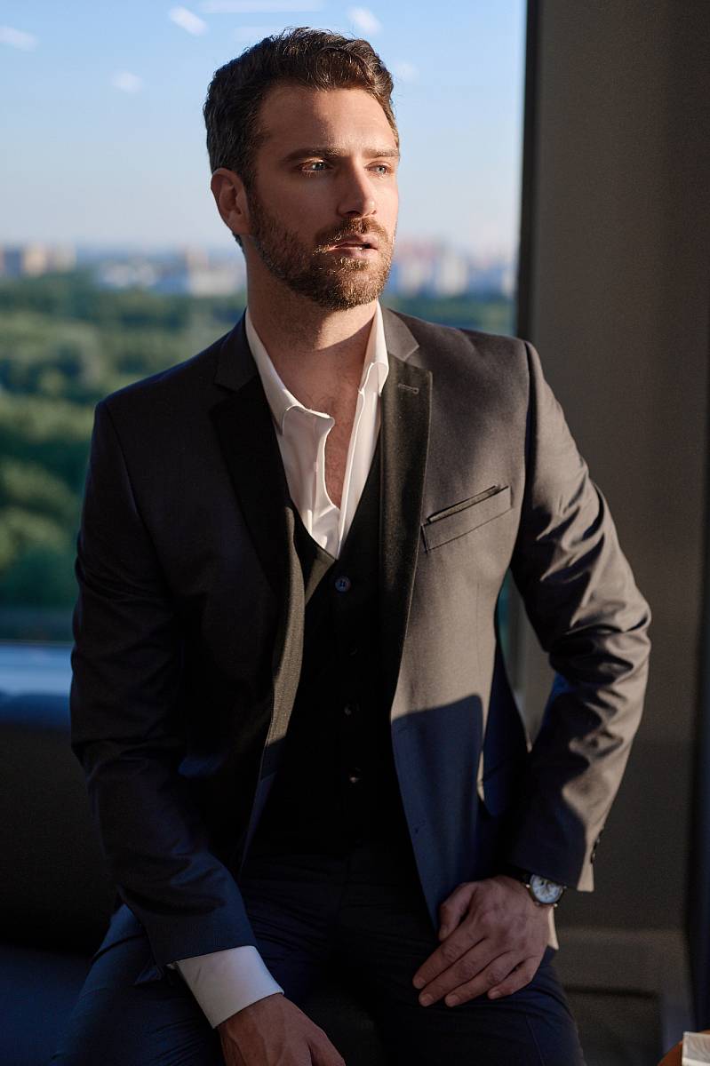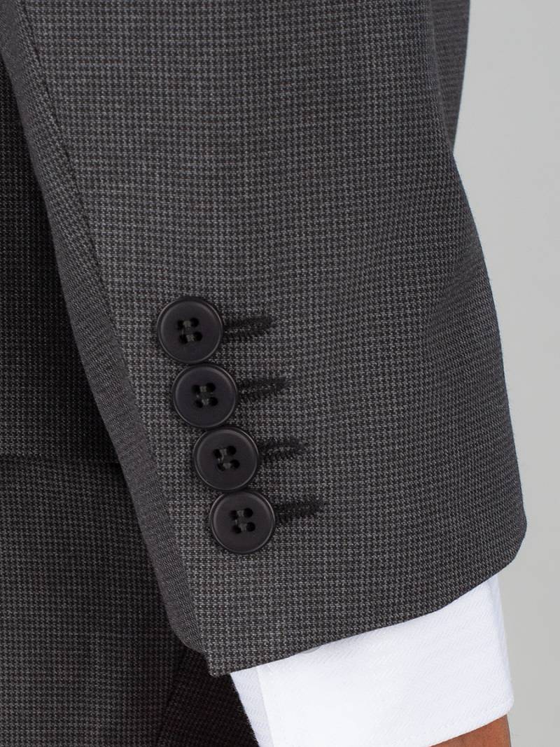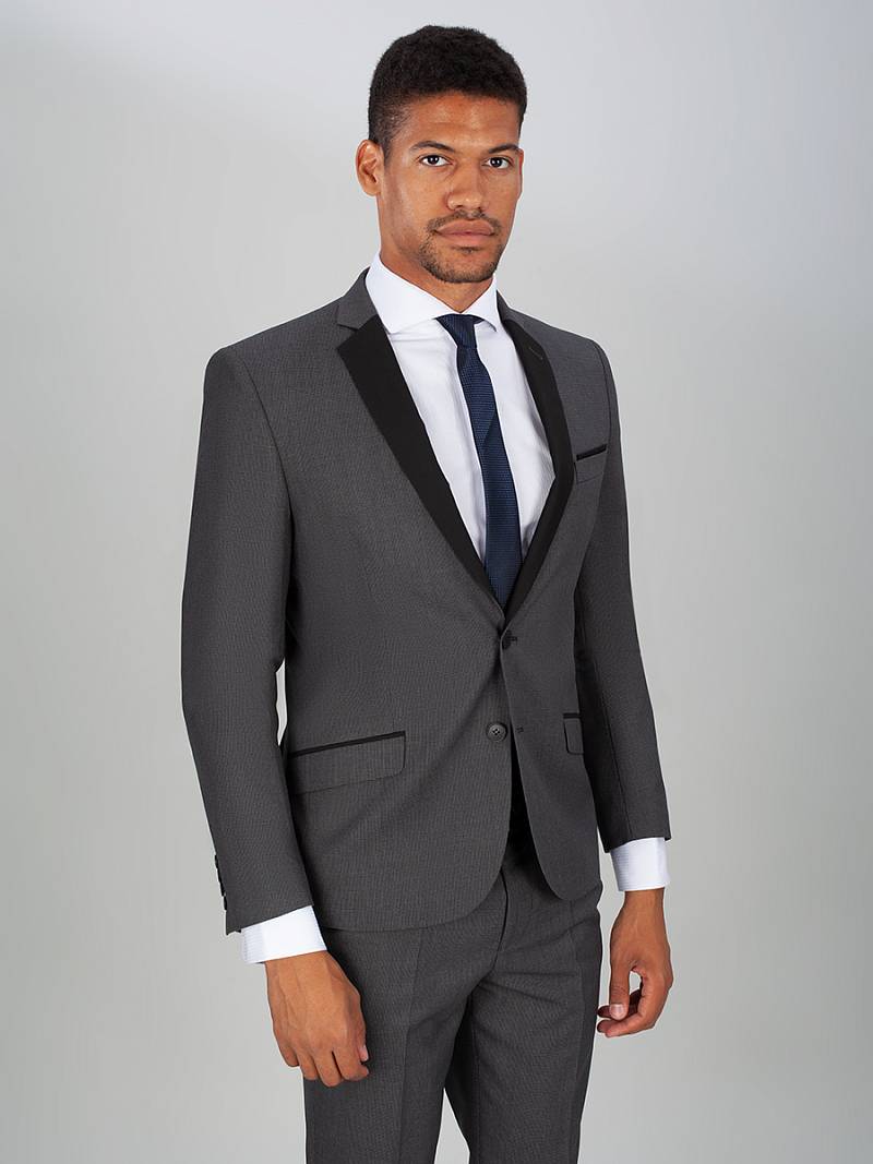 Классический костюм двойка Slim fit. Пиджак на две пуговицы, с боковыми и нагрудным карманами, по спинке две шлицы. Брюки без защипов с боковыми и одним задним карманом. Лацканы пиджака, рамки боковых карманов выполнены из отделочной ткани.