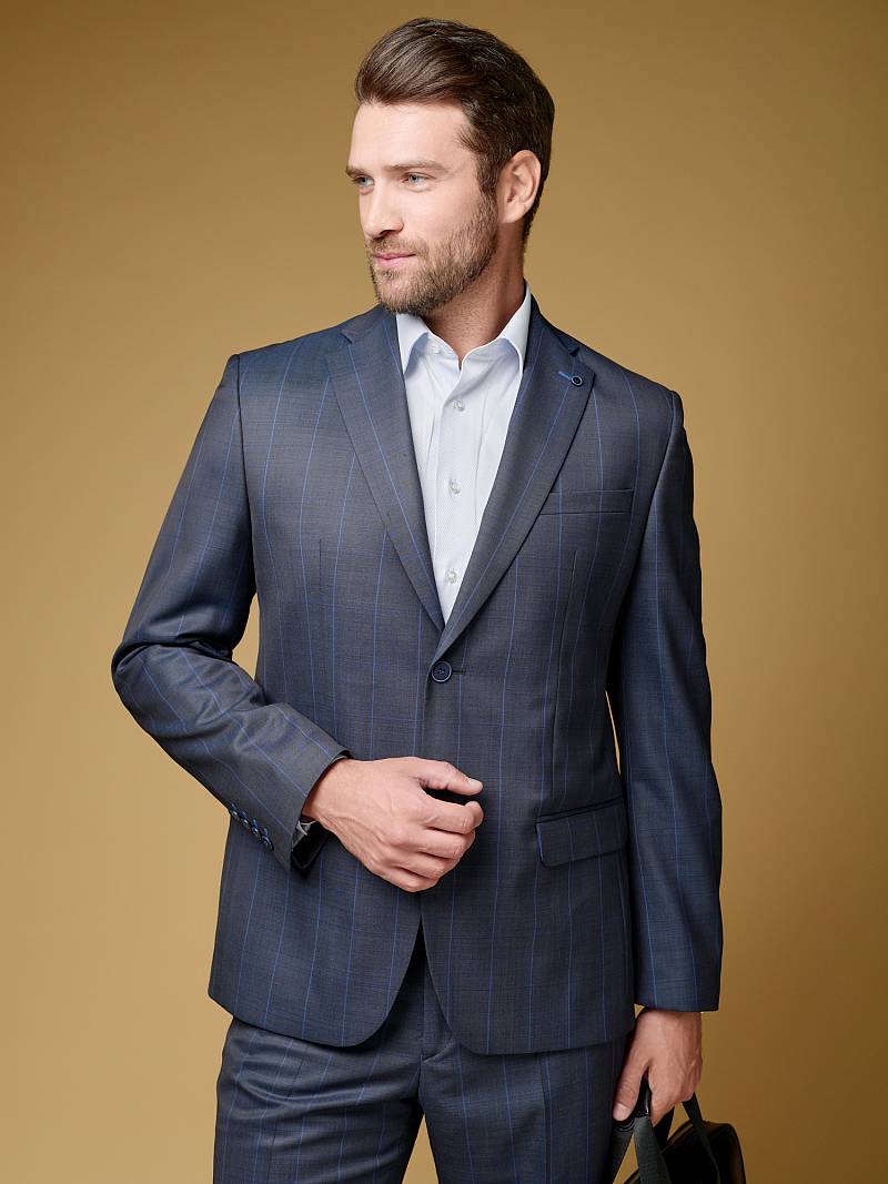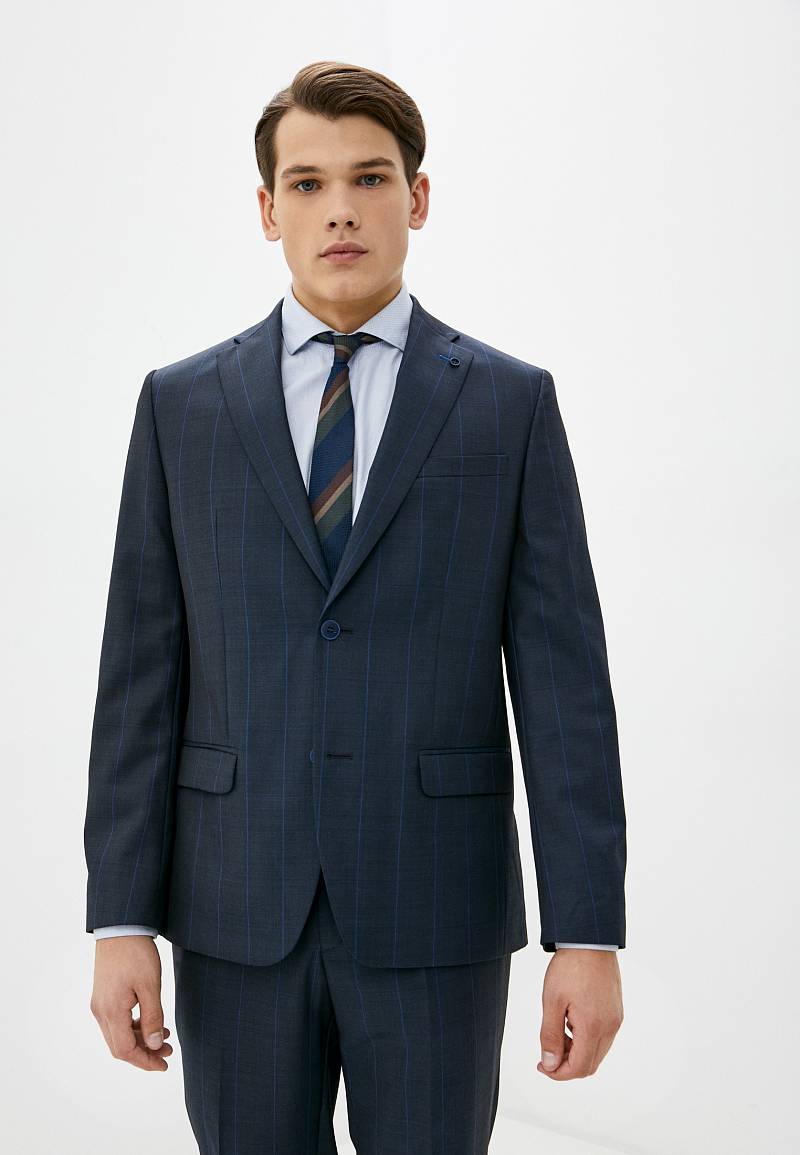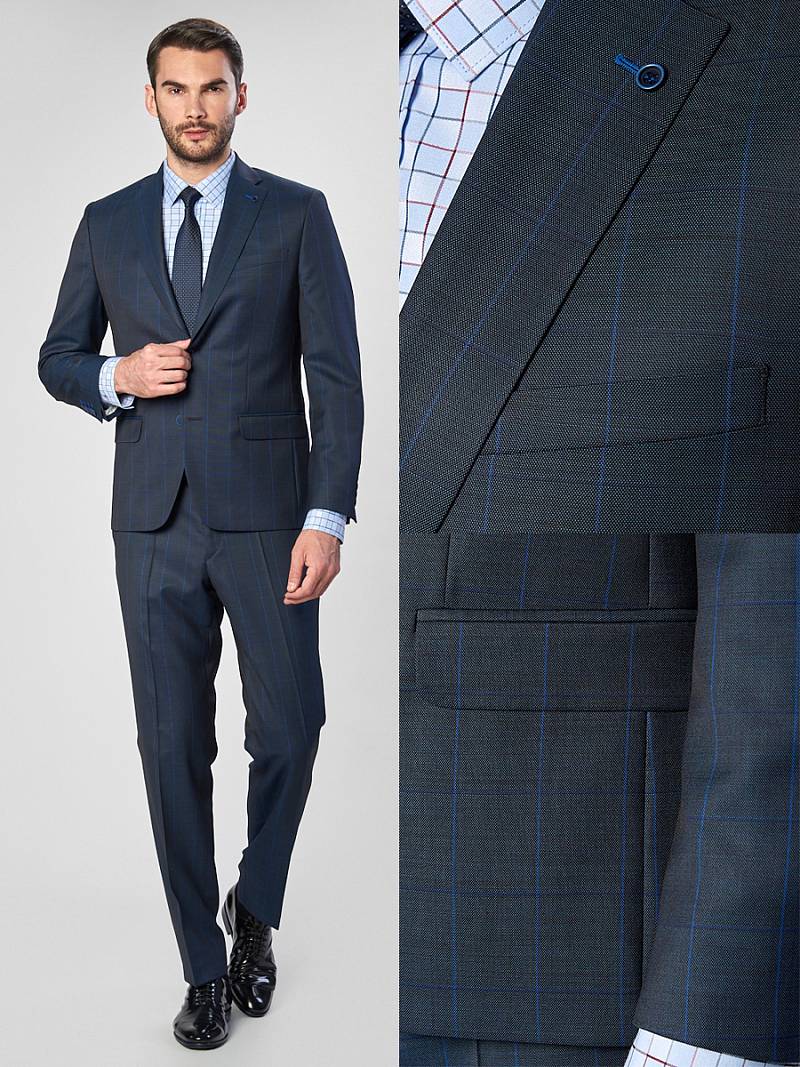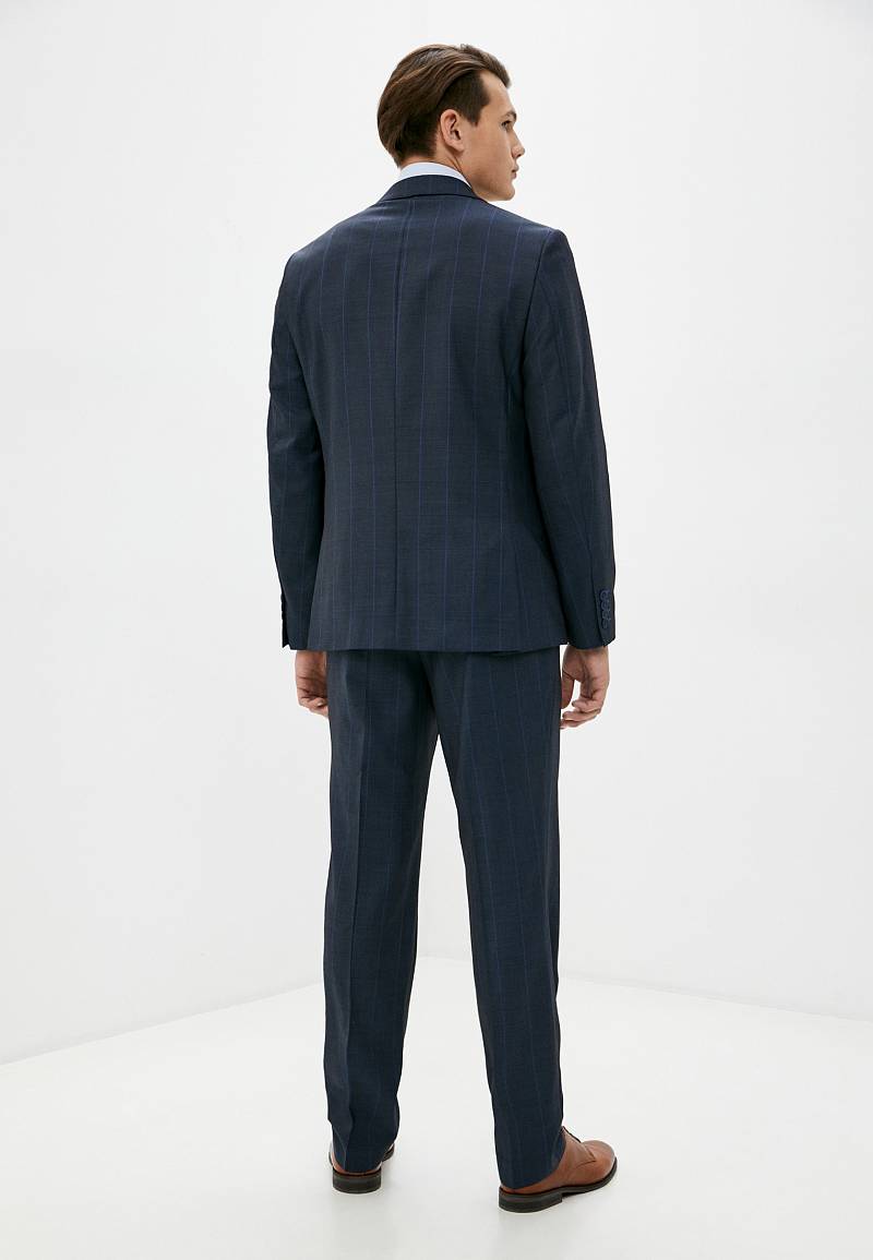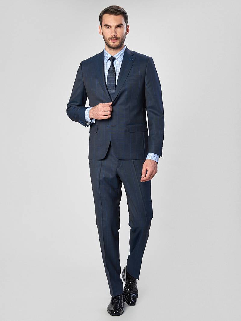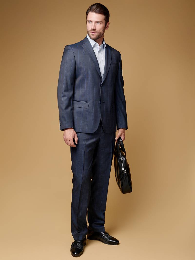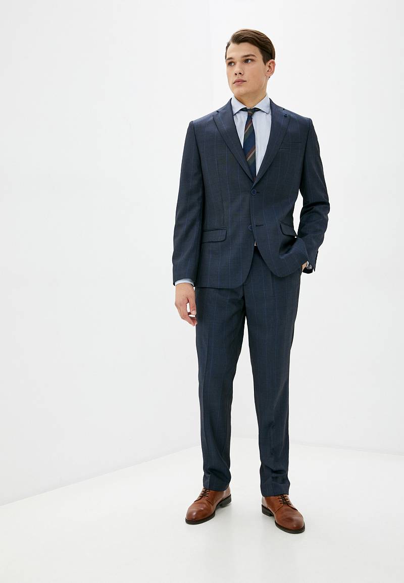 Классический костюм двойка Classic fit. Пиджак на две пуговицы, с боковыми и нагрудным карманами, по спинке две шлицы, в фасонной петле значок. Брюки без защипов с боковыми и одним задним карманом.