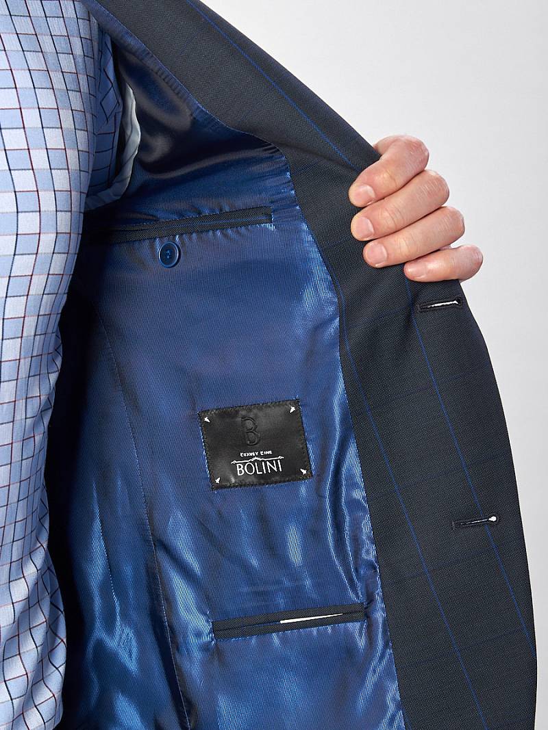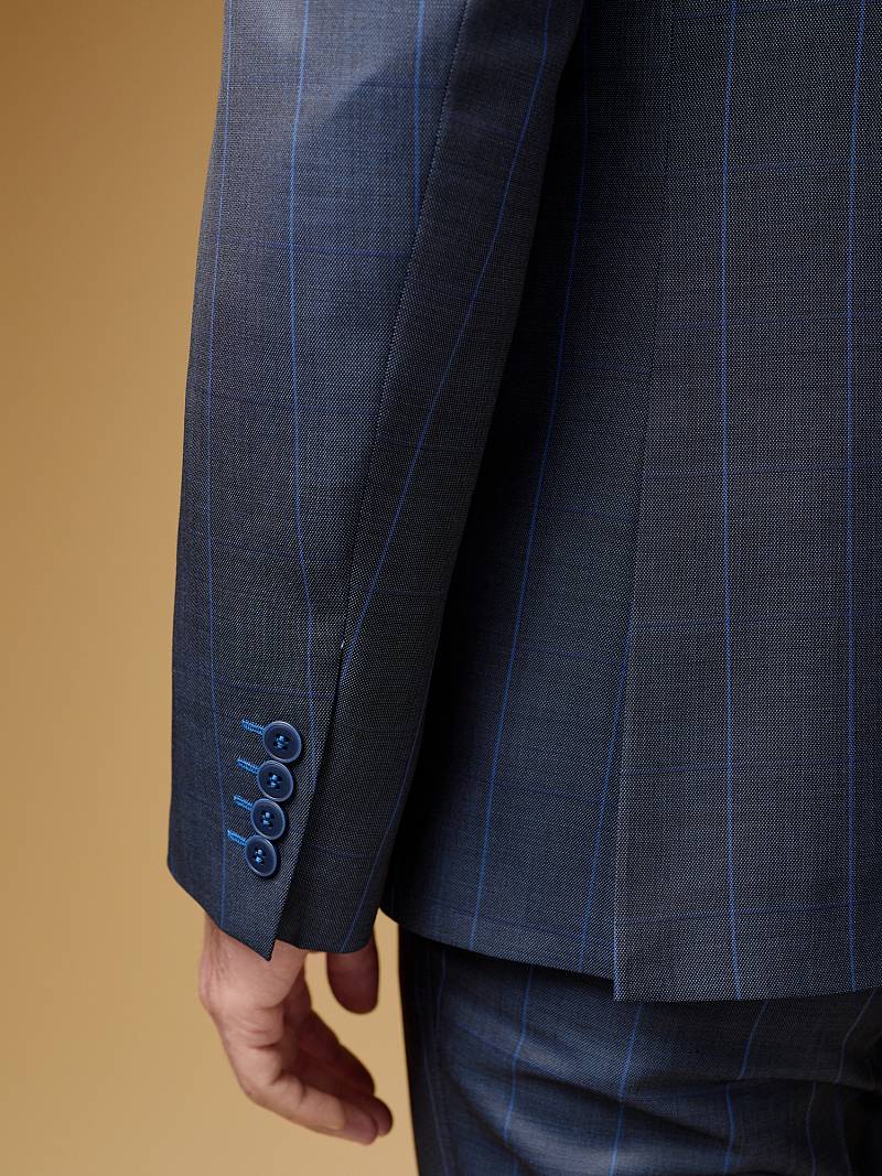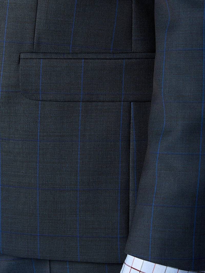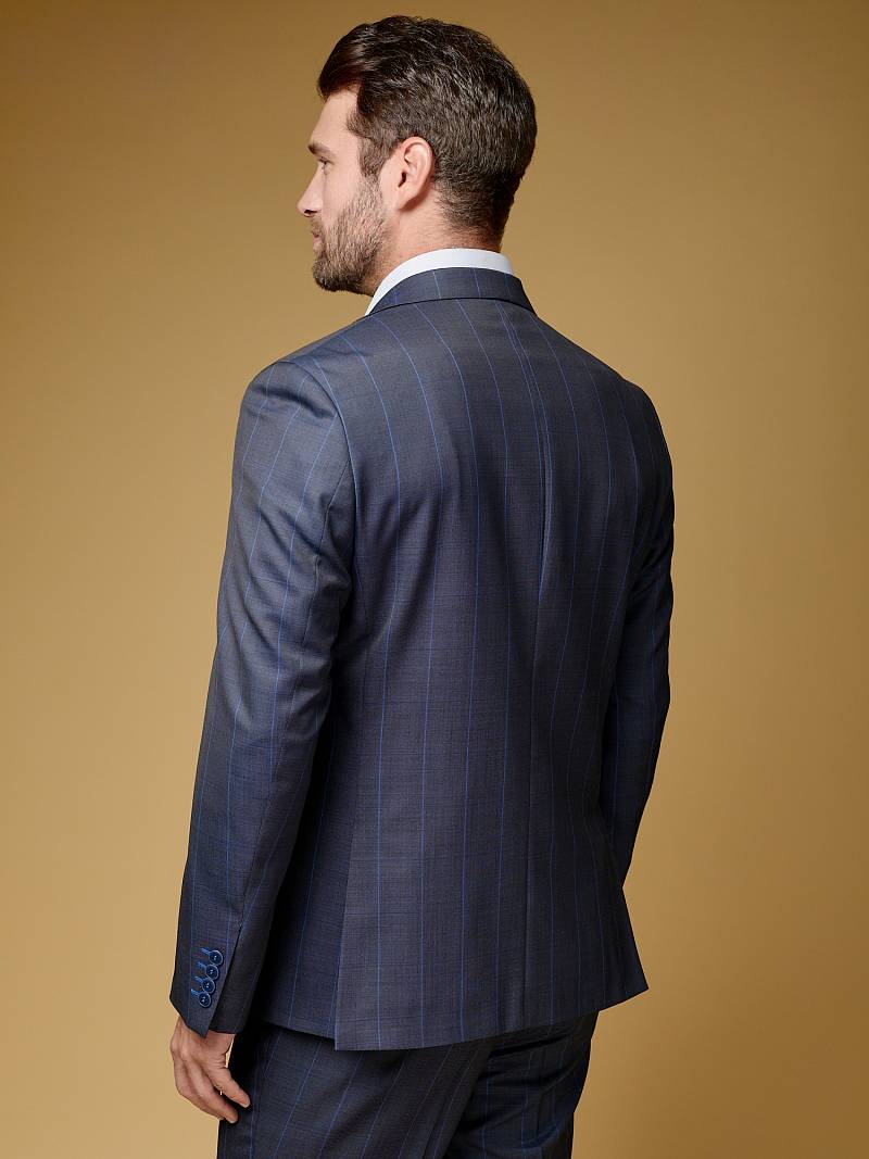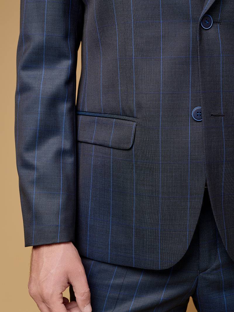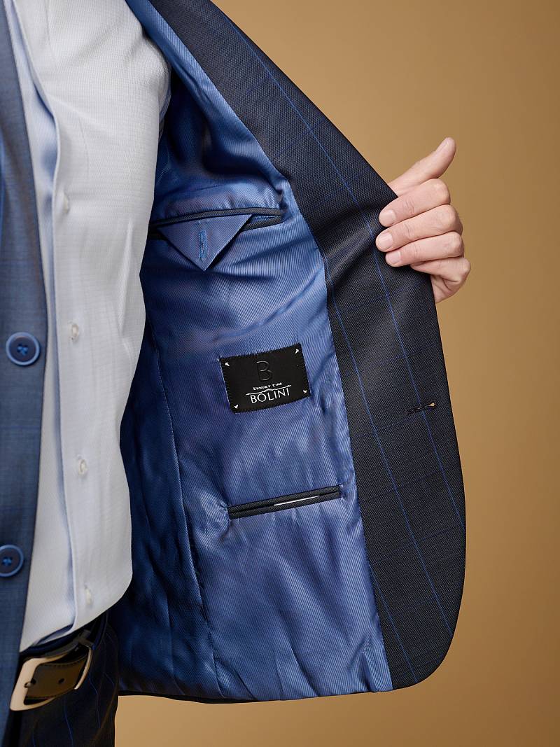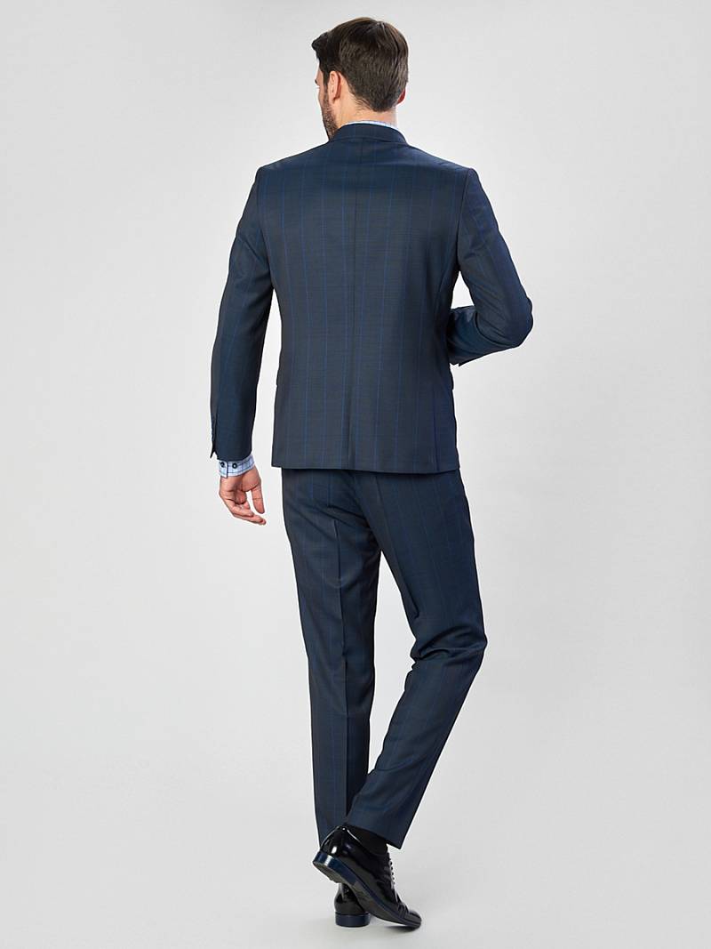 Классический костюм двойка Classic fit. Пиджак на две пуговицы, с боковыми и нагрудным карманами, по спинке две шлицы, в фасонной петле значок. Брюки без защипов с боковыми и одним задним карманом.