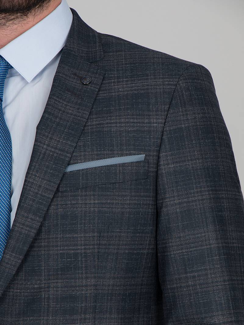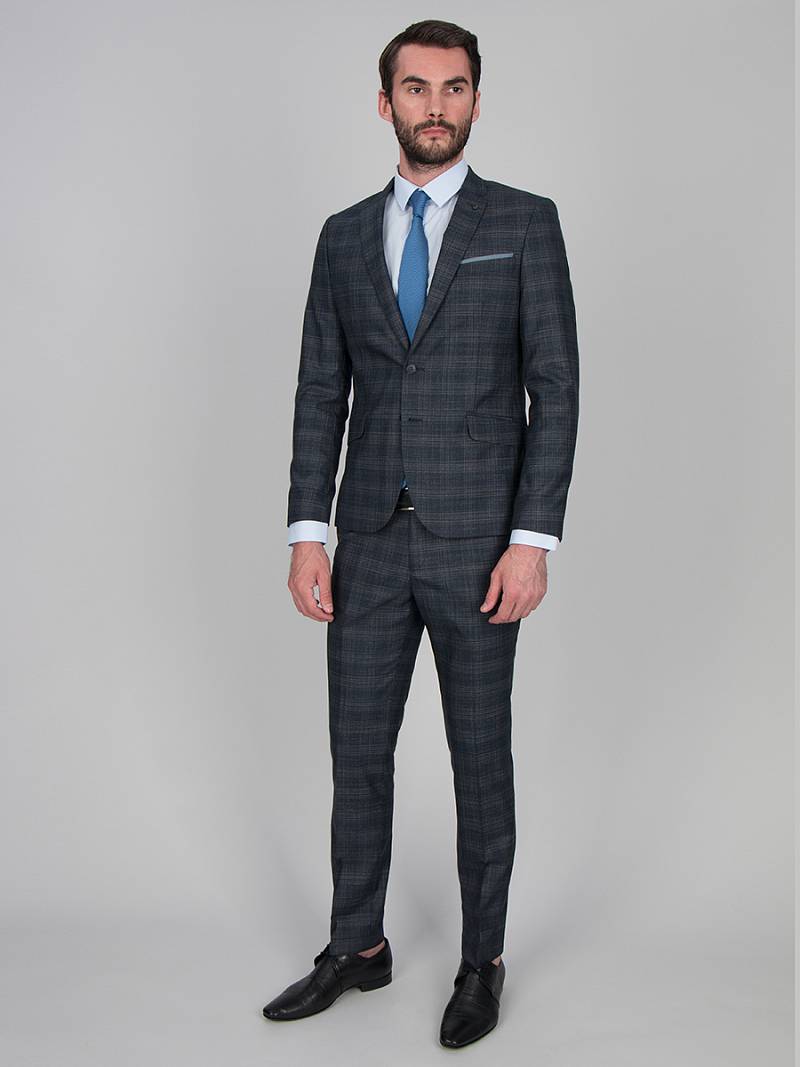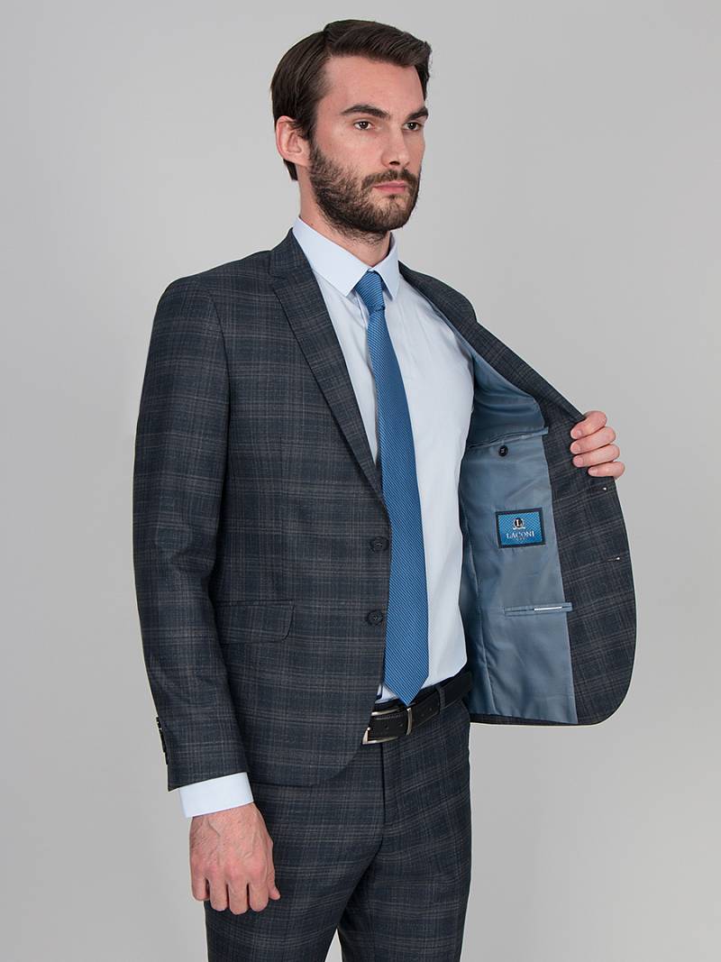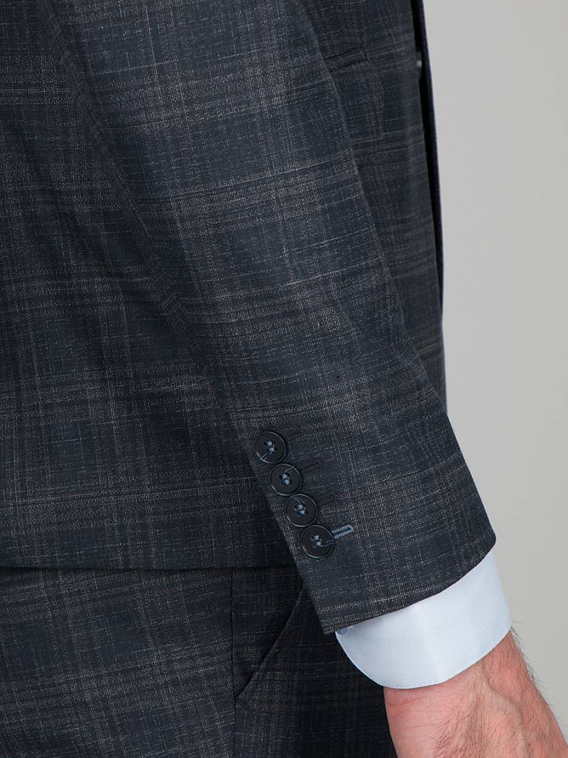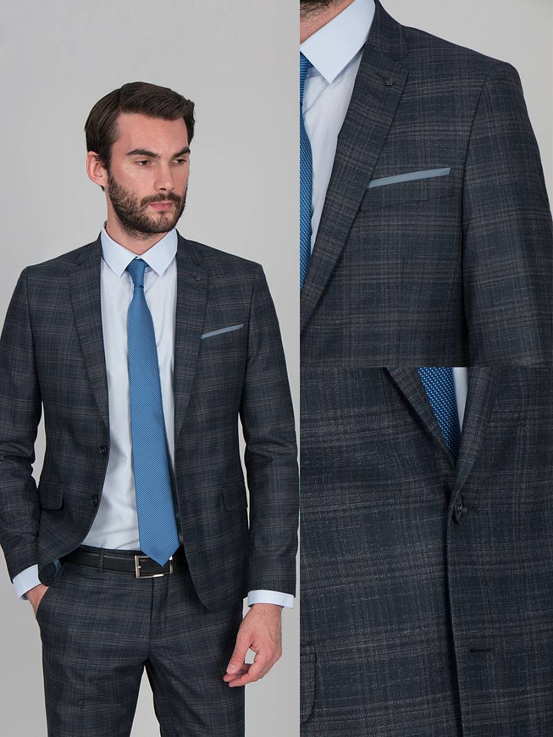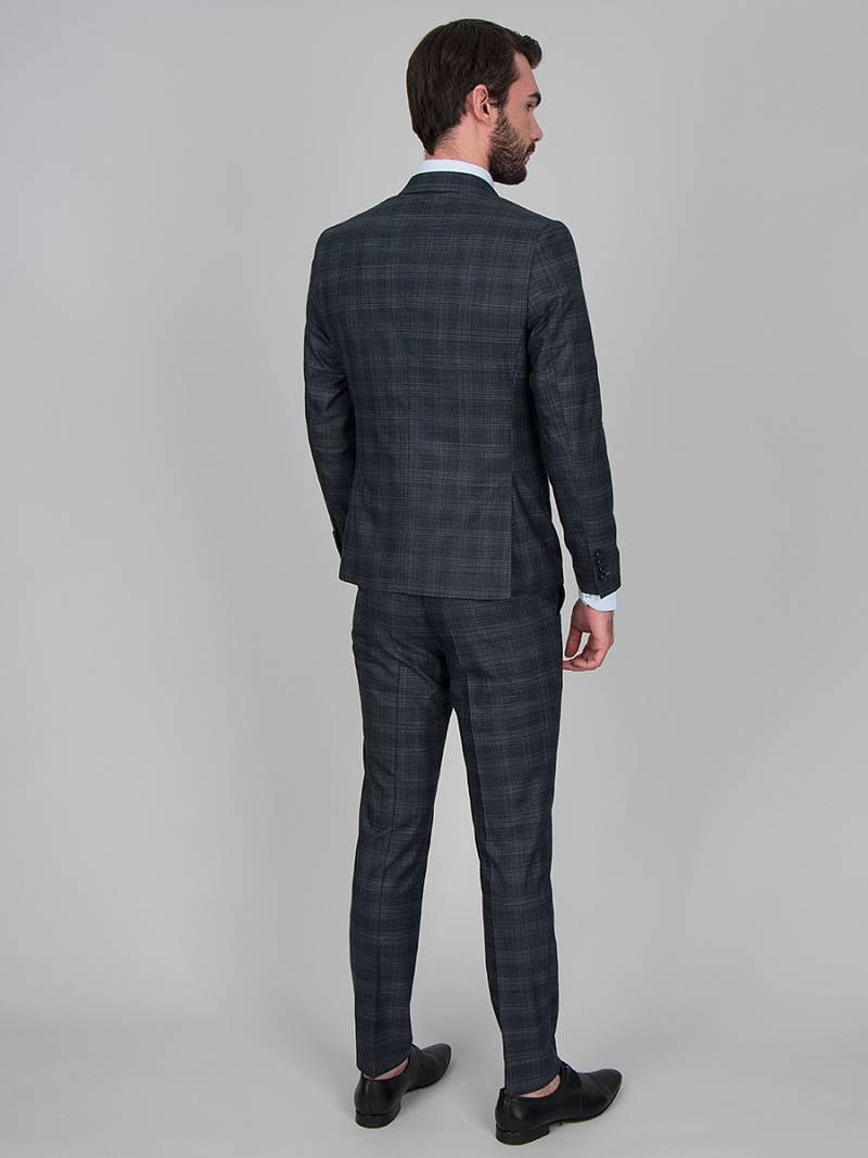 Классический костюм двойка Ultra slim fit. Пиджак на две пуговицы, с боковыми и нагрудным карманами, по спинке две шлицы, в нагрудном кармане расположен декоративный платок, контрастные петли, в фасонной петле декоративная пуговица. Брюки без защипов с боковыми и одним задним карманом.