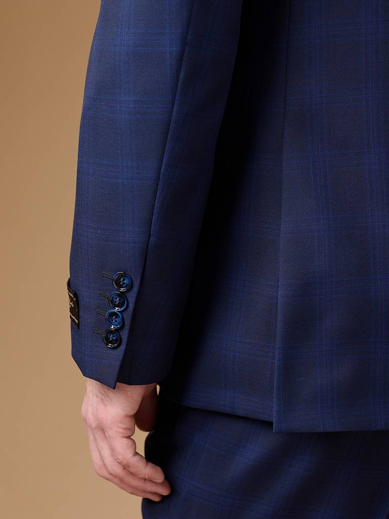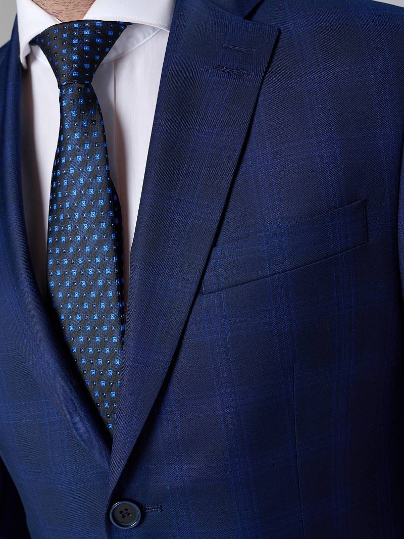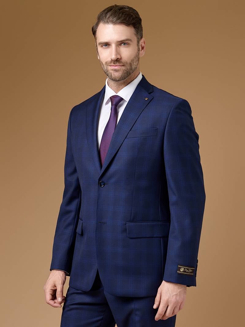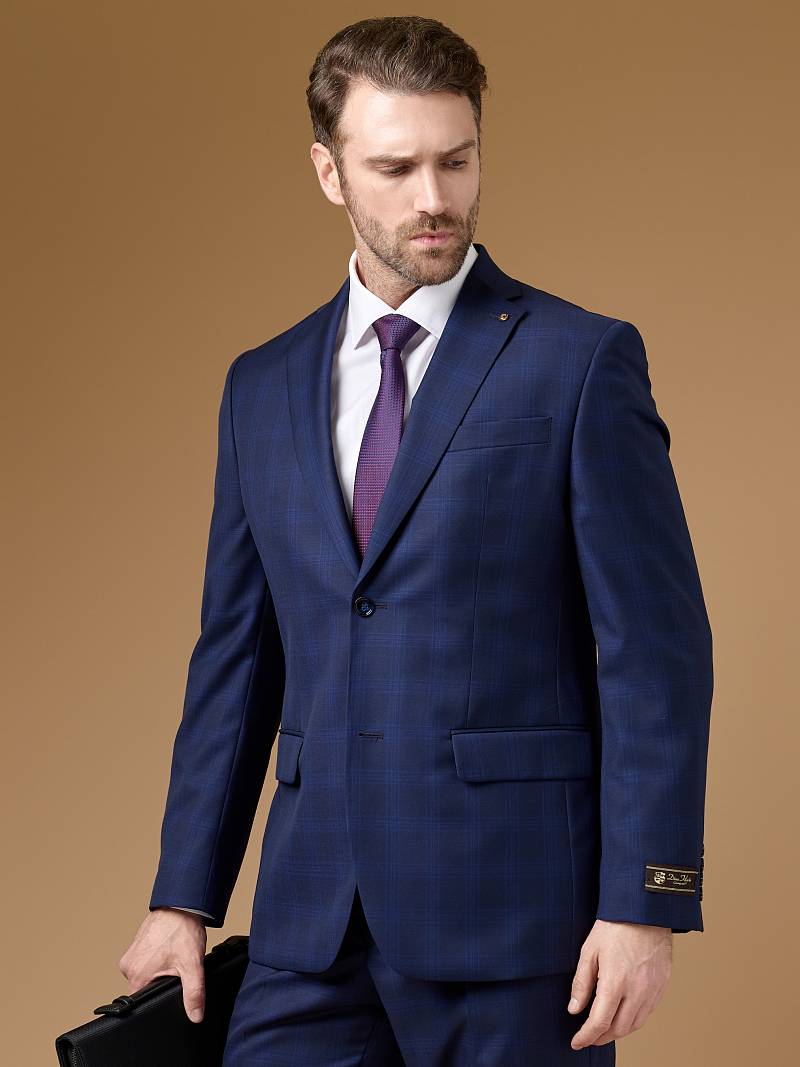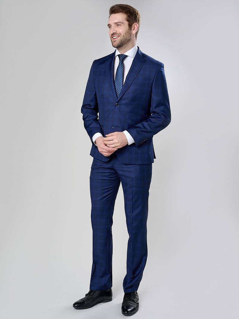 Классический костюм двойка Classic fit. Пиджак на две пуговицы, с боковыми и нагрудным карманами, по спинке две шлицы. Брюки без защипов с боковыми и одним задним карманом.