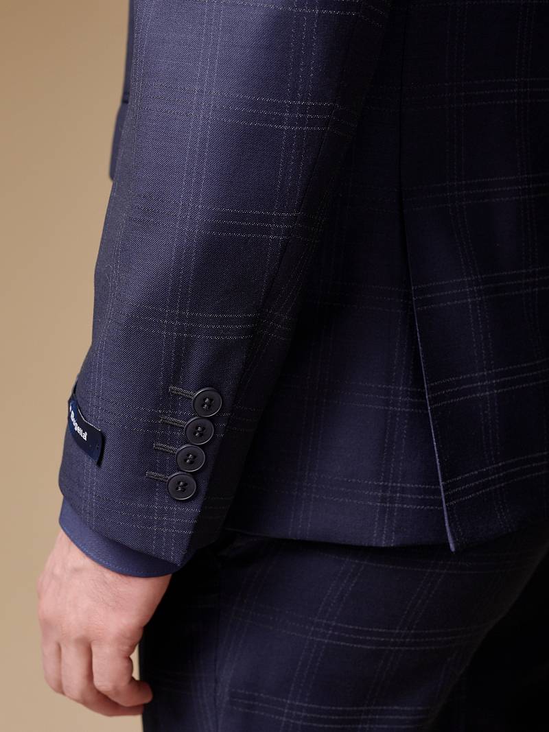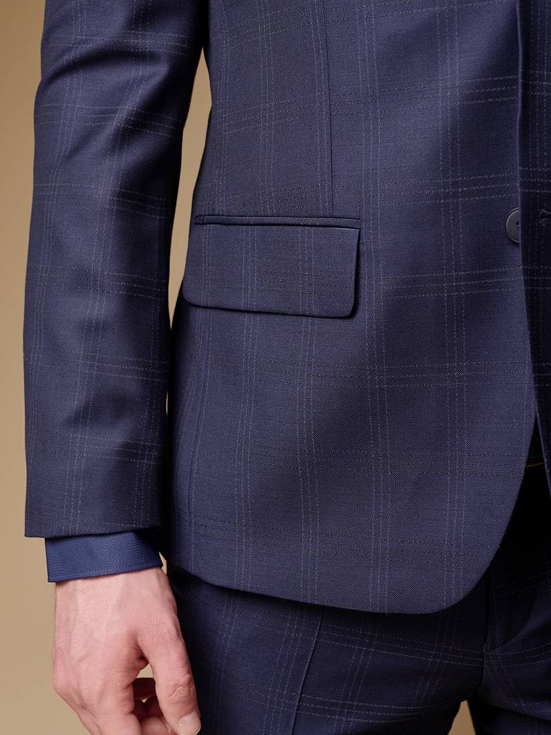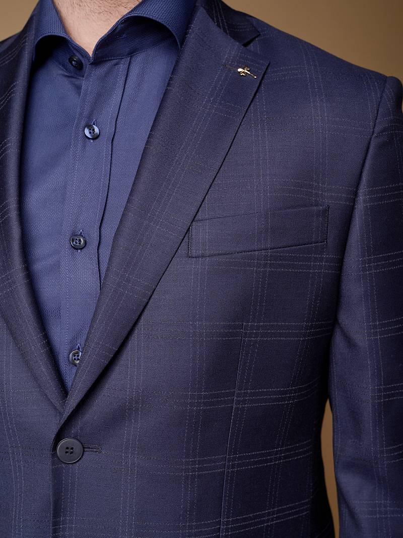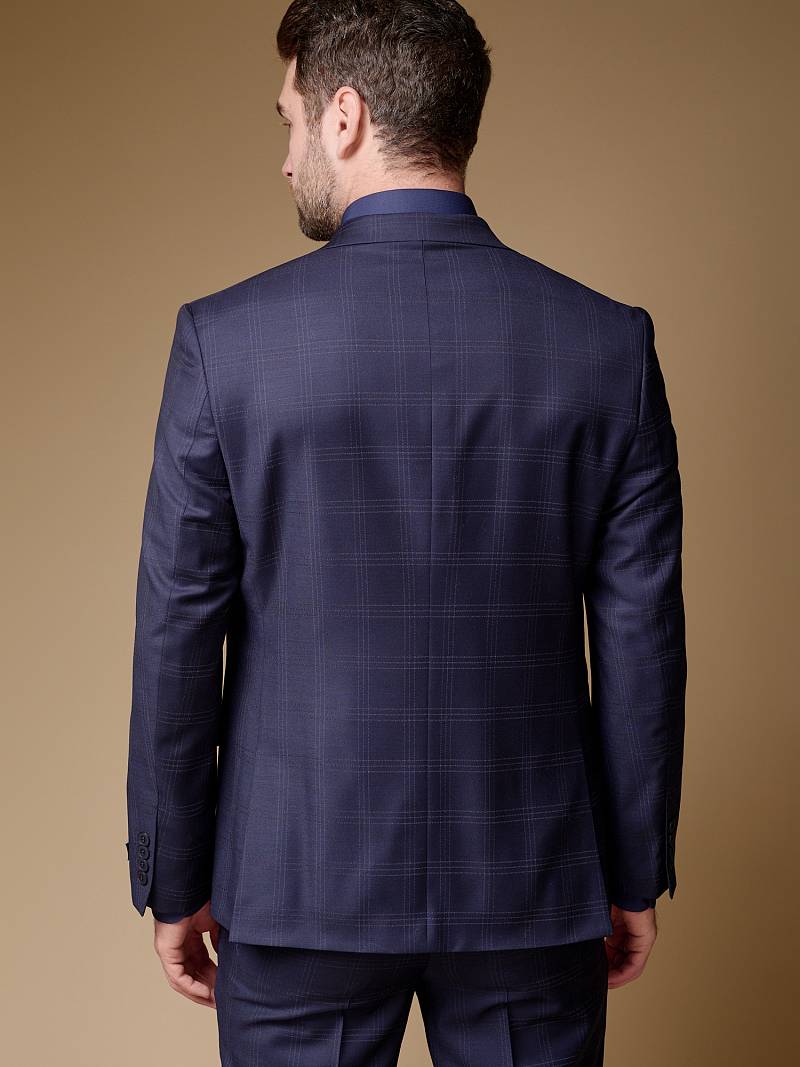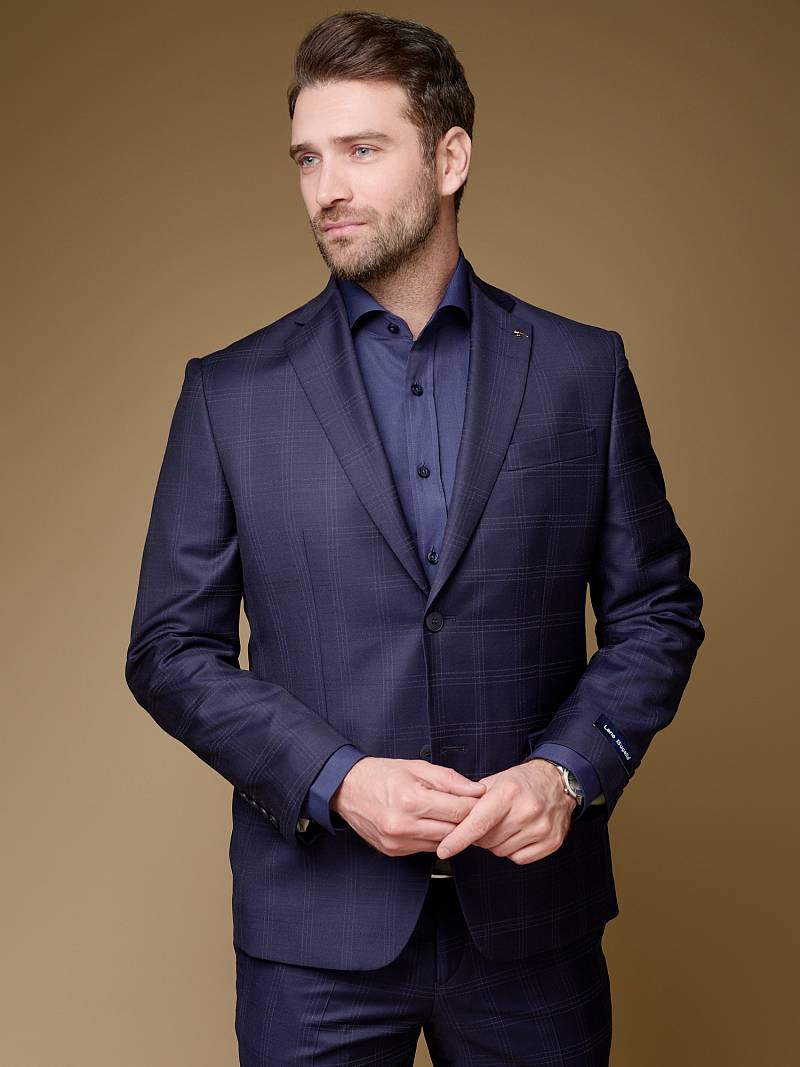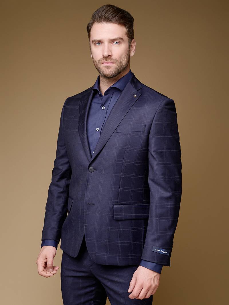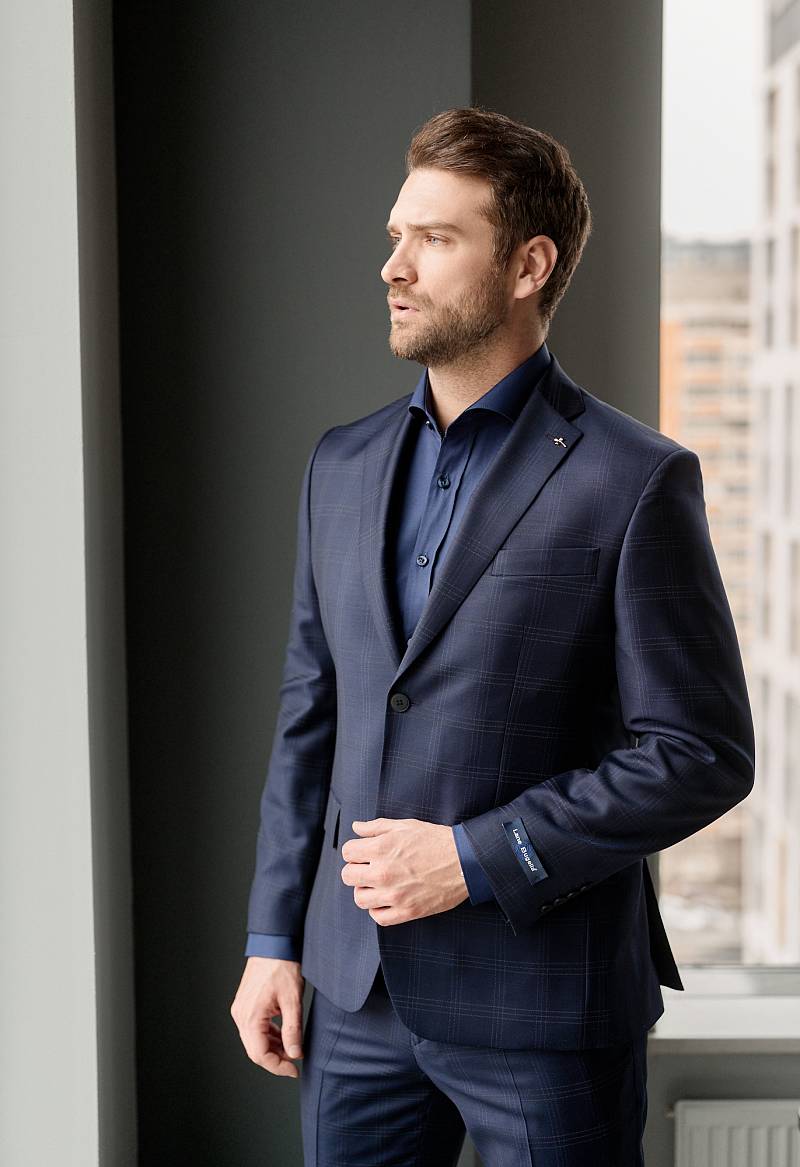 Классический костюм двойка Classic fit (ПОЛУПРИЛЕГАЮЩИЙ СИЛУЭТ). Пиджак однобортный на две пуговицы, с двумя боковыми карманами с клапанами и нагрудной листочкой. Рукава втачные, двухшовные со шлицей и четырьмя декоративными пуговицами. По спинке расположены две шлицы. Пиджак на подкладке, с двумя внутренними карманами. Брюки без защипов, с боковыми наклонными карманами и двумя задними карманами «в рамку». Передние половинки на подкладке. Верхний срез брюк обработан поясом с корсажной лентой и шлевками под ремень. Застежка обработана на тесьму-молнию, с петлей-пуговицей на поясе и усилен металлическим крючком.