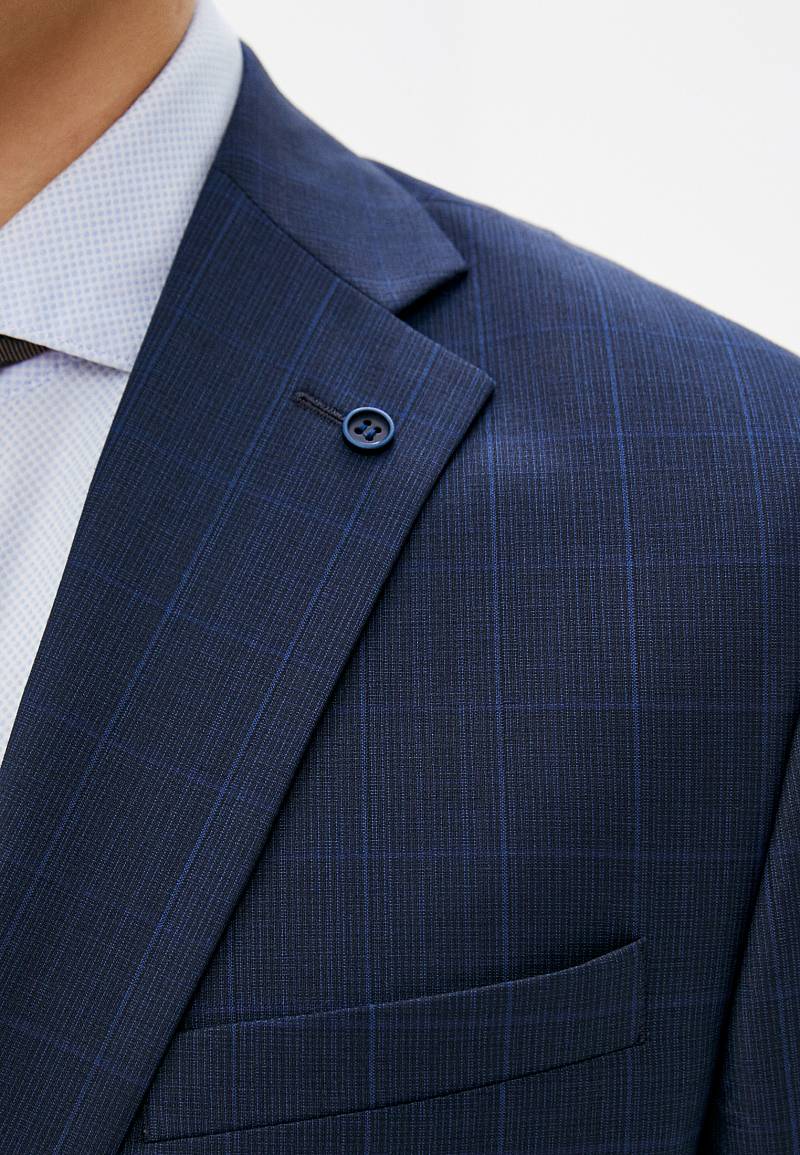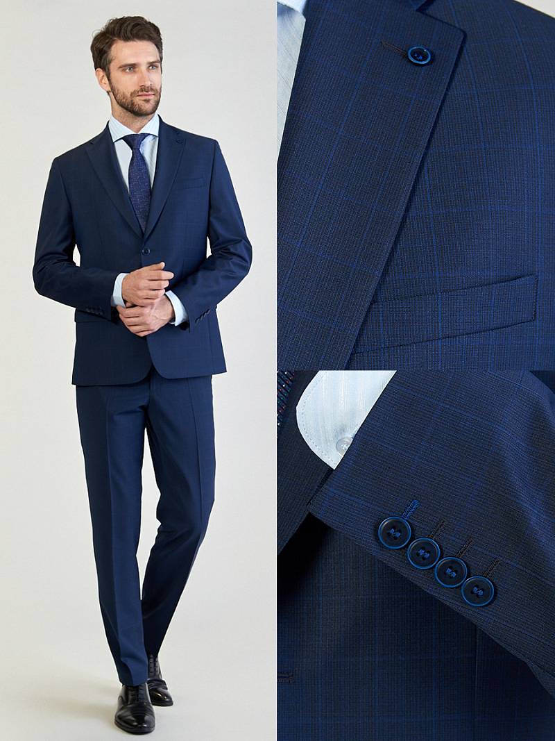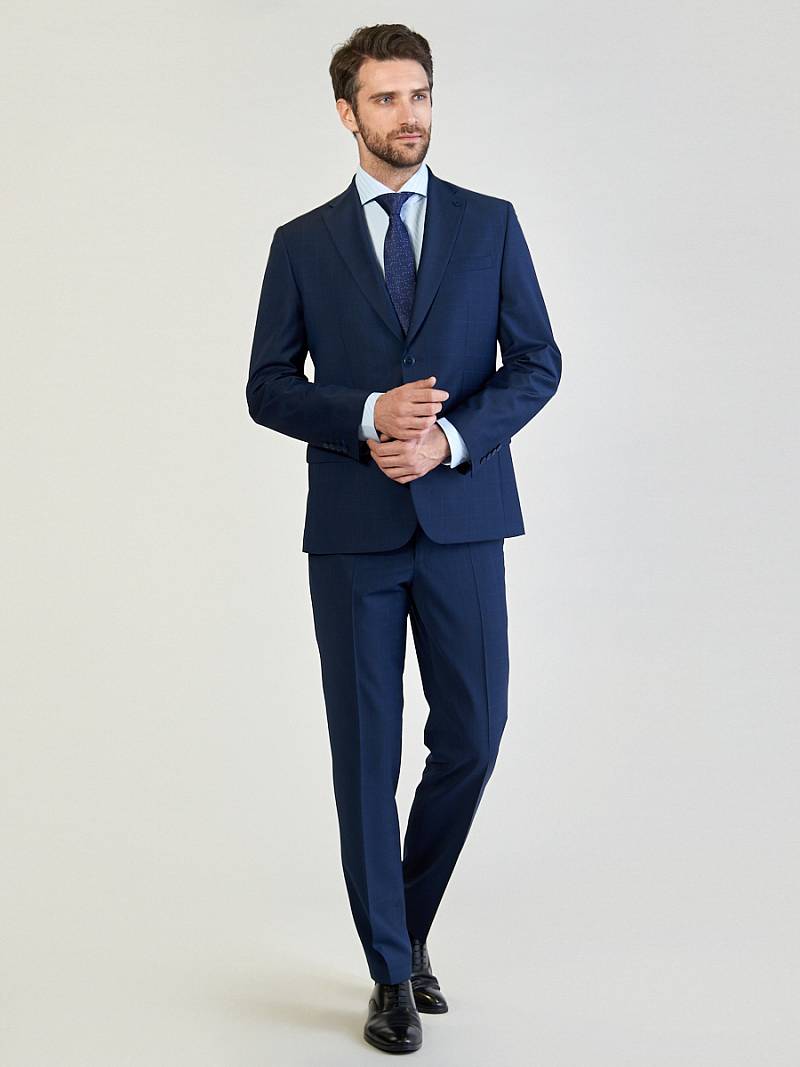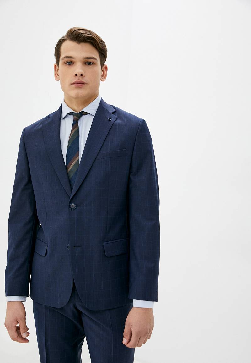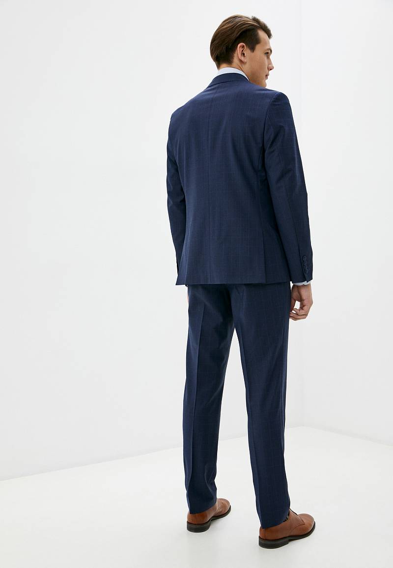 Классический костюм двойка Classic fit. Пиджак на две пуговицы, с боковыми и нагрудным карманами, по спинке две шлицы. Брюки без защипов с боковыми и одним задним карманом.