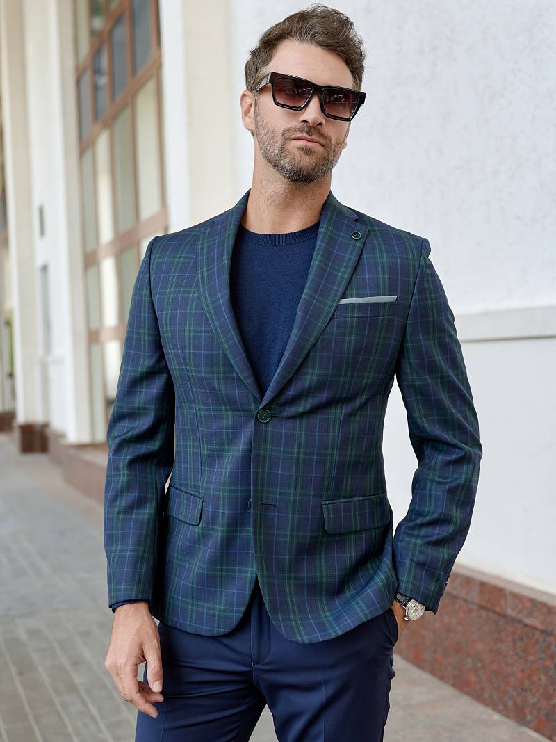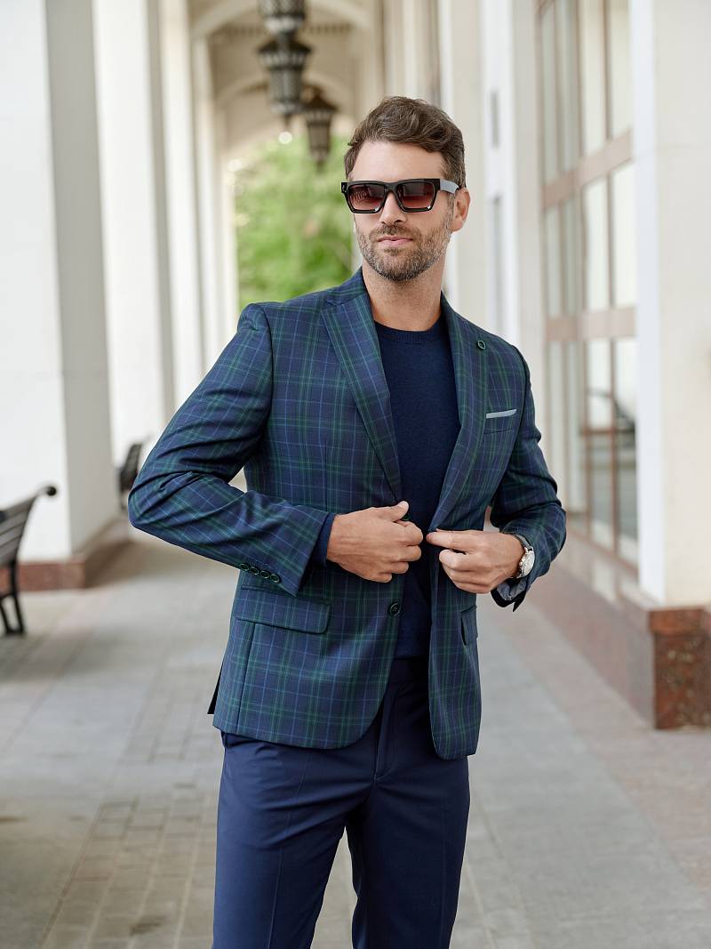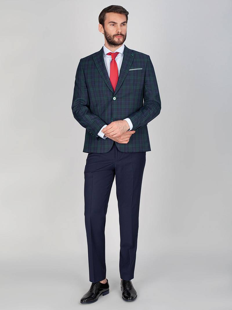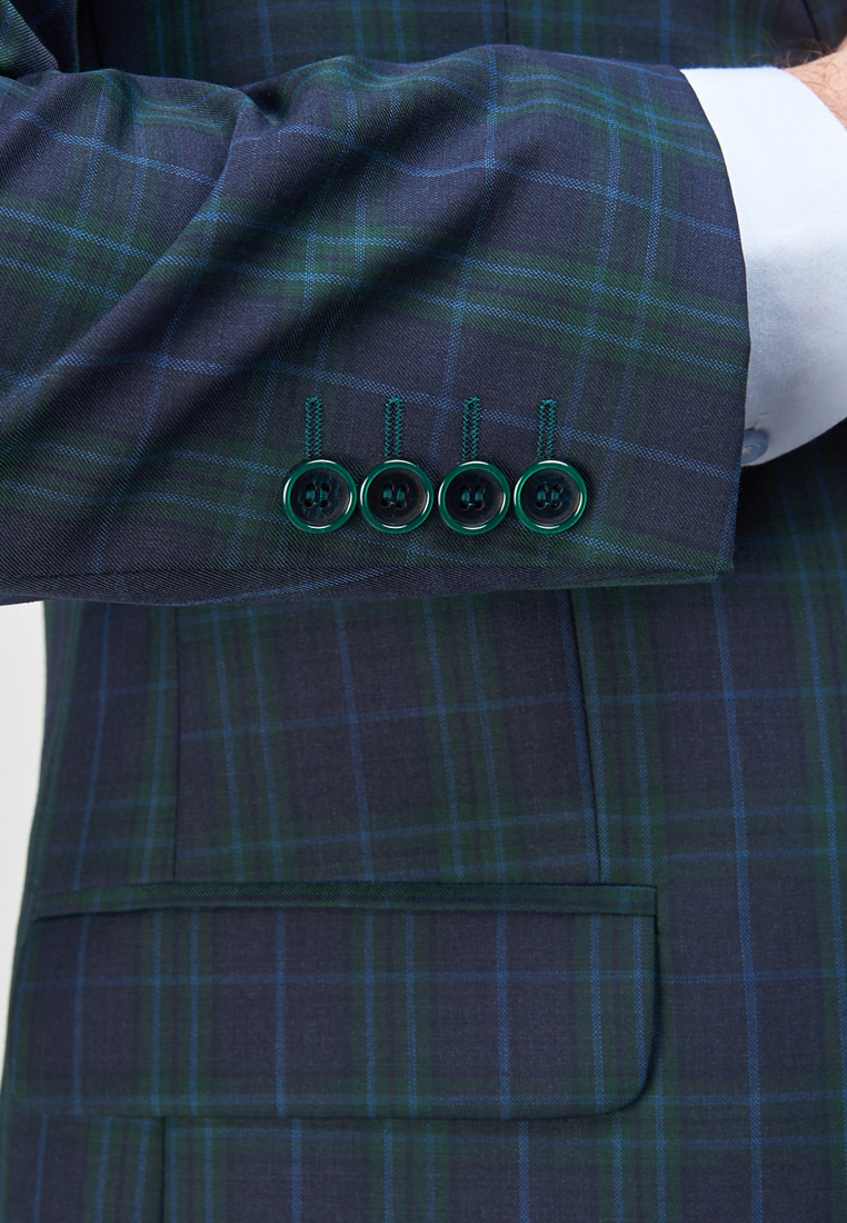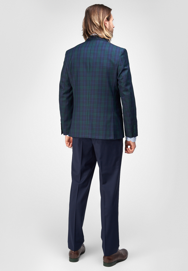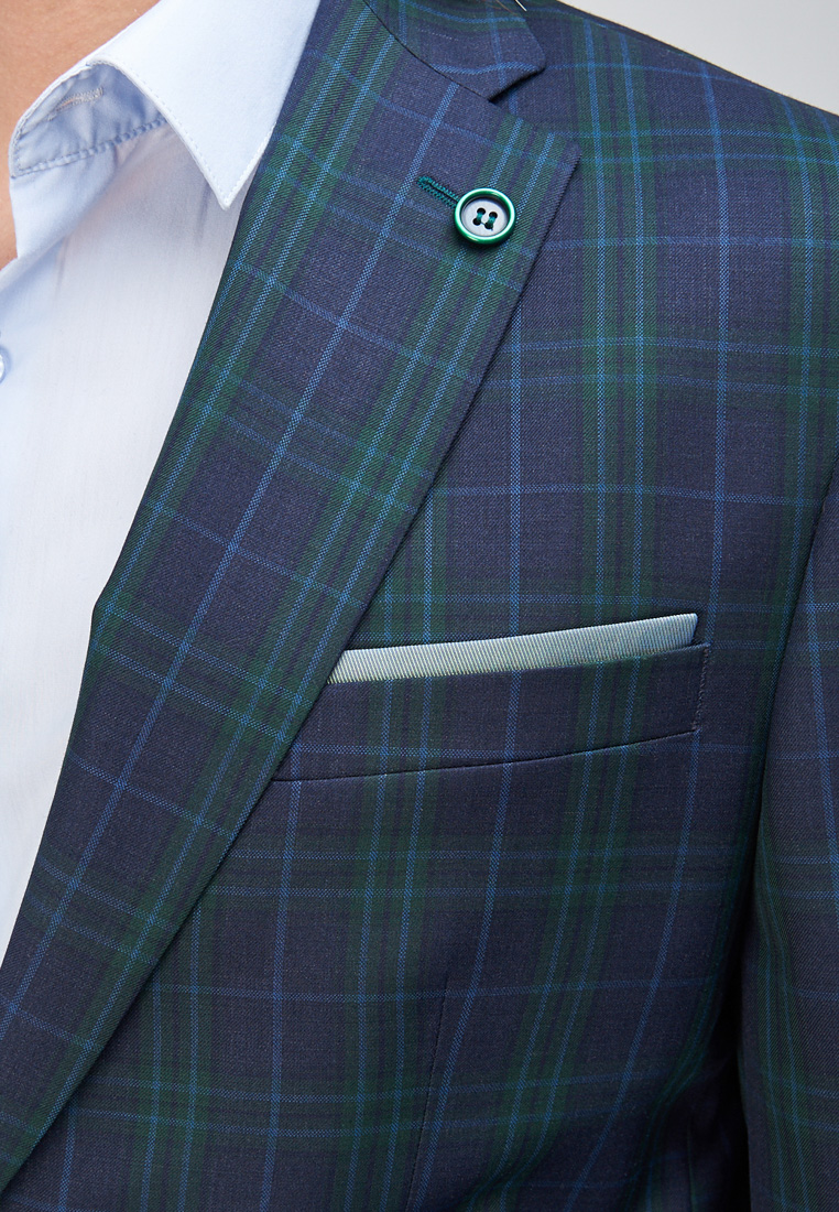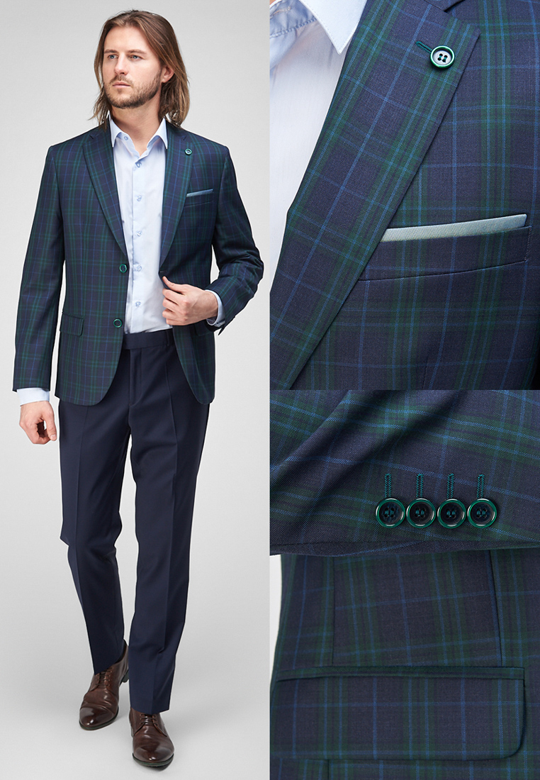 Классический костюм двойка Classic fit. Пиджак на две пуговицы, с боковыми и нагрудным карманами, по спинке две шлицы, в нагрудном кармане расположен декоративный платок. Брюки без защипов с боковыми и одним задним карманом, выполнены из ткани компаньона.