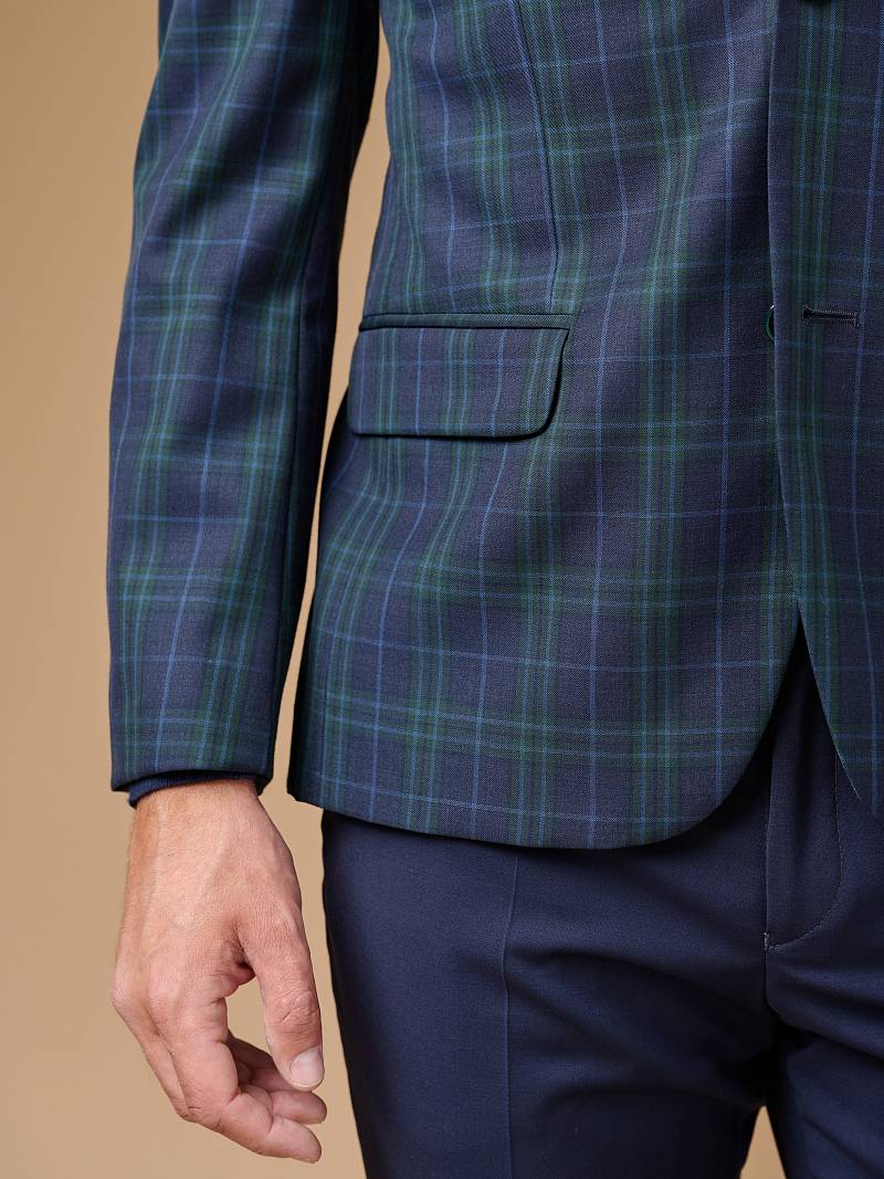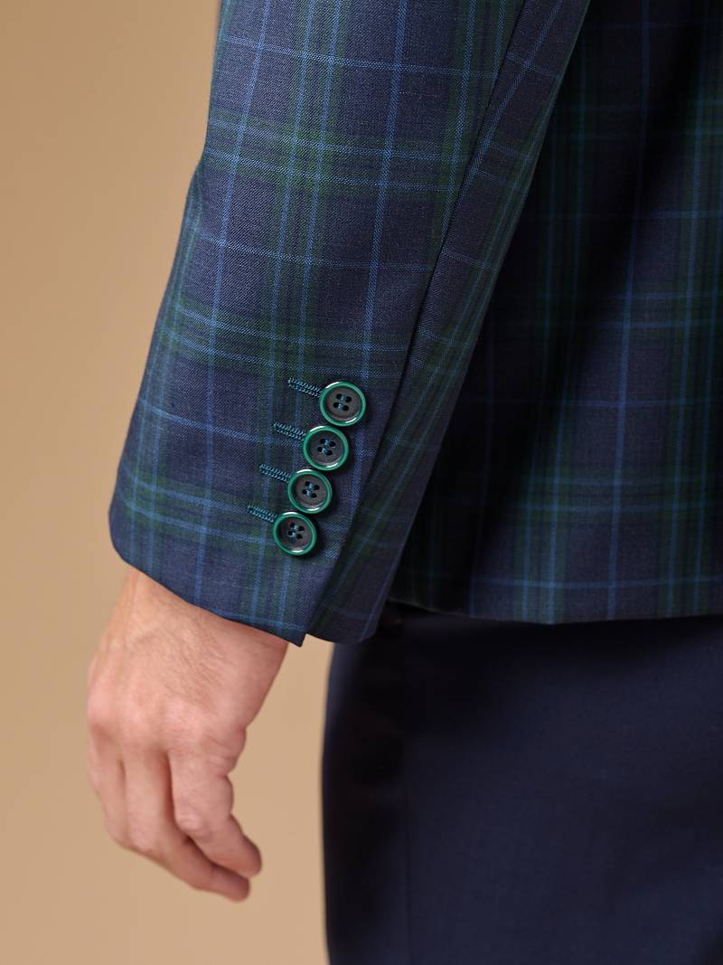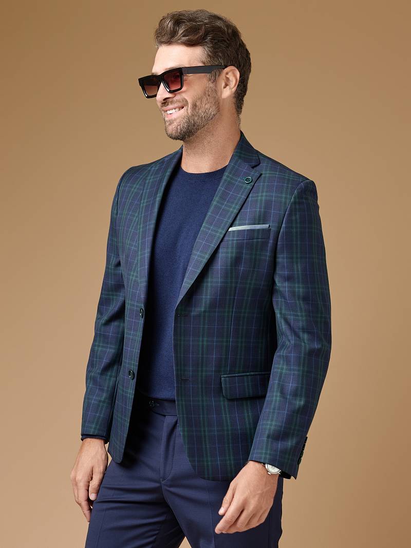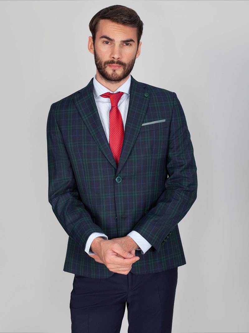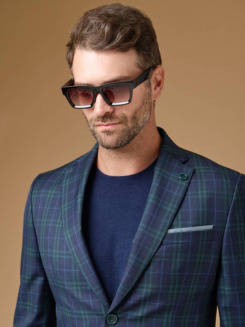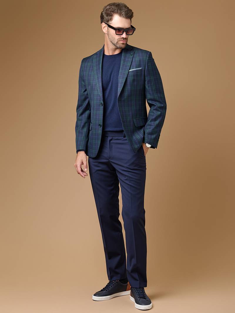Классический костюм двойка Classic fit. Пиджак на две пуговицы, с боковыми и нагрудным карманами, по спинке две шлицы, в нагрудном кармане расположен декоративный платок. Брюки без защипов с боковыми и одним задним карманом, выполнены из ткани компаньона.
