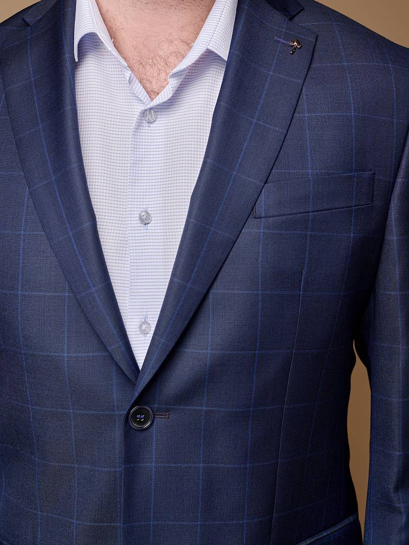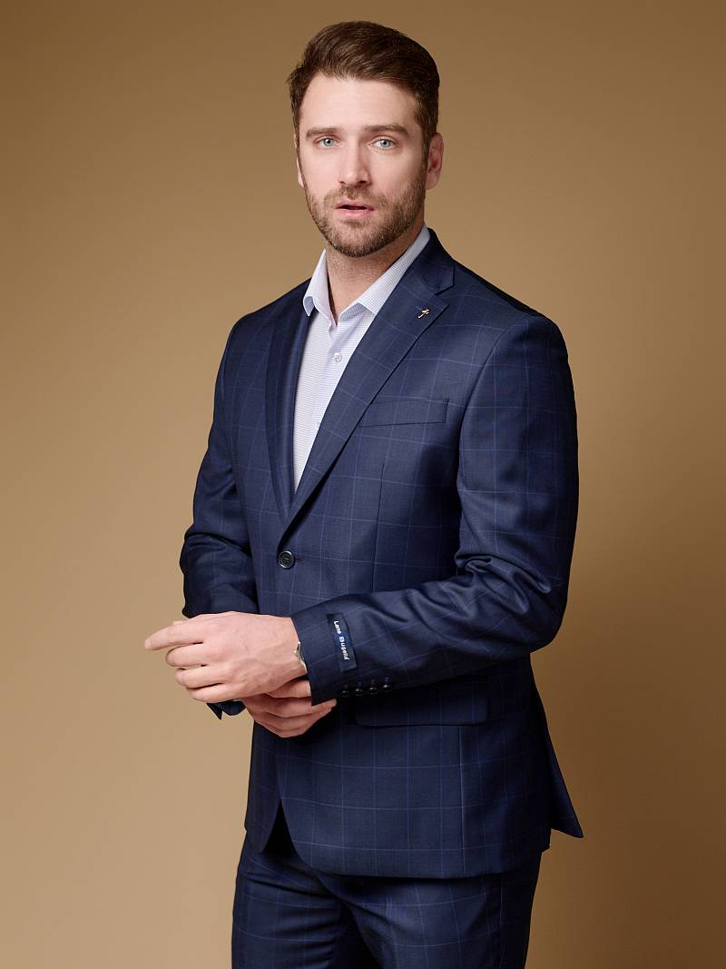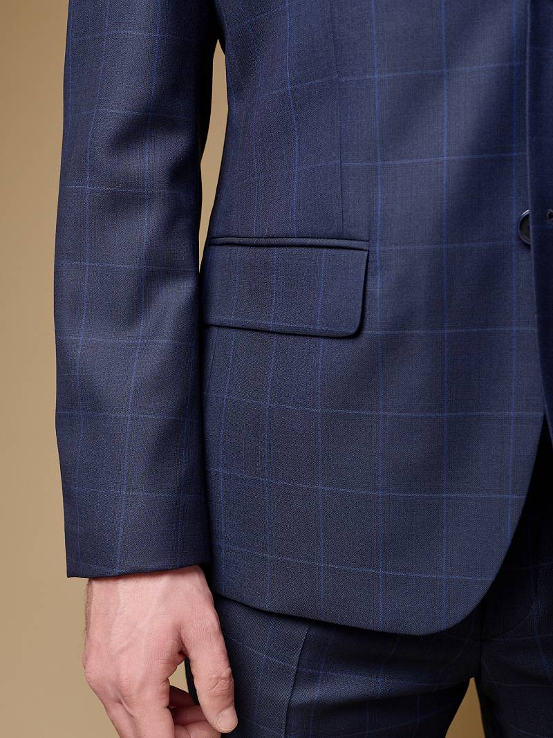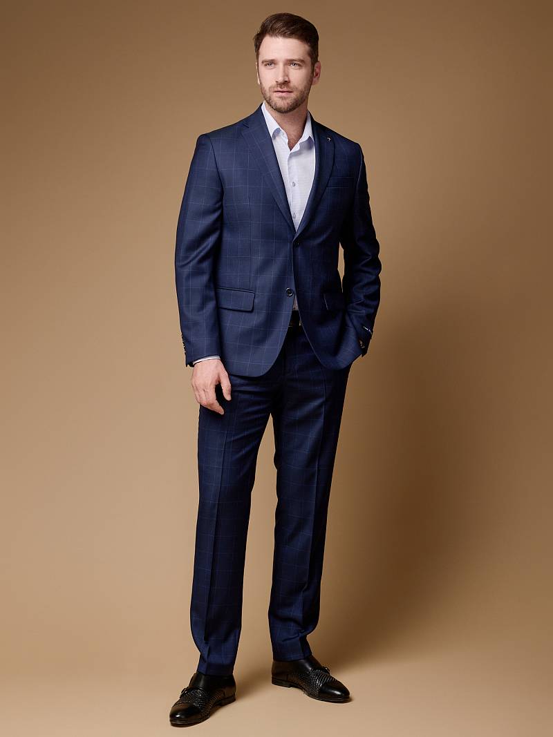 Классический костюм двойка Classic fit (ПОЛУПРИЛЕГАЮЩИЙ СИЛУЭТ). Пиджак однобортный на две пуговицы, с двумя боковыми карманами с клапанами и нагрудной листочкой. Рукава втачные, двухшовные со шлицей и четырьмя декоративными пуговицами. По спинке расположены две шлицы. Пиджак на подкладке, с двумя внутренними карманами. Брюки без защипов, с боковыми наклонными карманами и двумя задними карманами «в рамку». Передние половинки на подкладке. Верхний срез брюк обработан поясом с корсажной лентой и шлевками под ремень. Застежка обработана на тесьму-молнию, с петлей-пуговицей на поясе и усилен металлическим крючком.